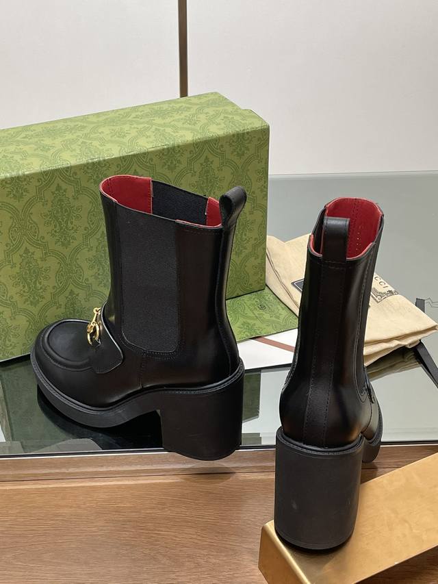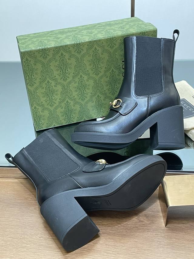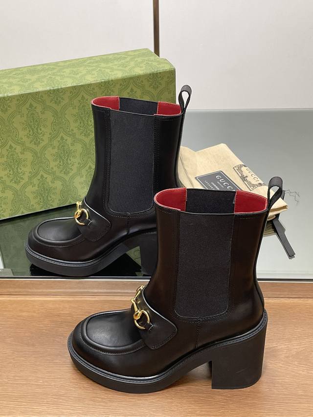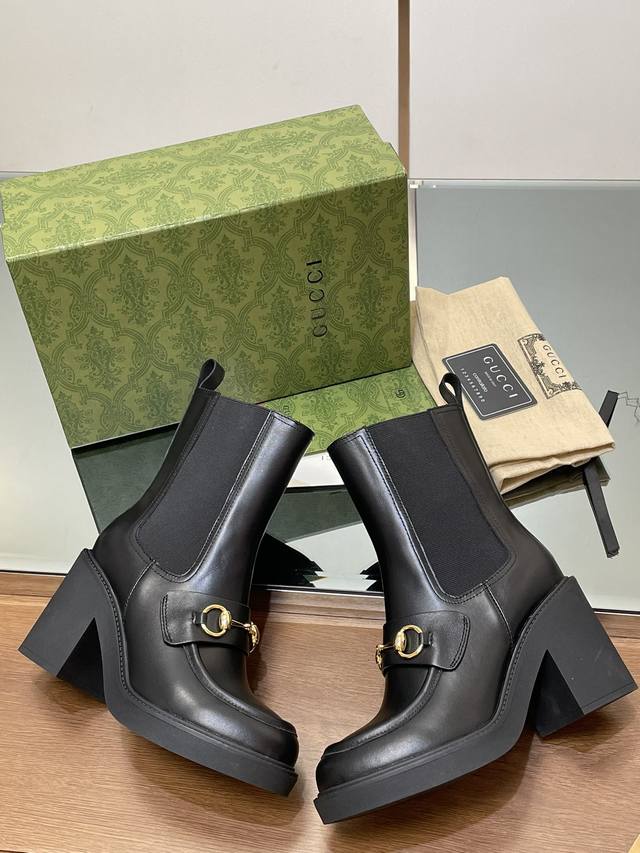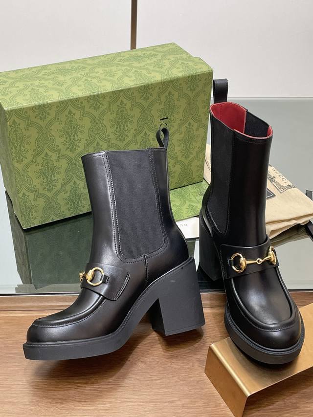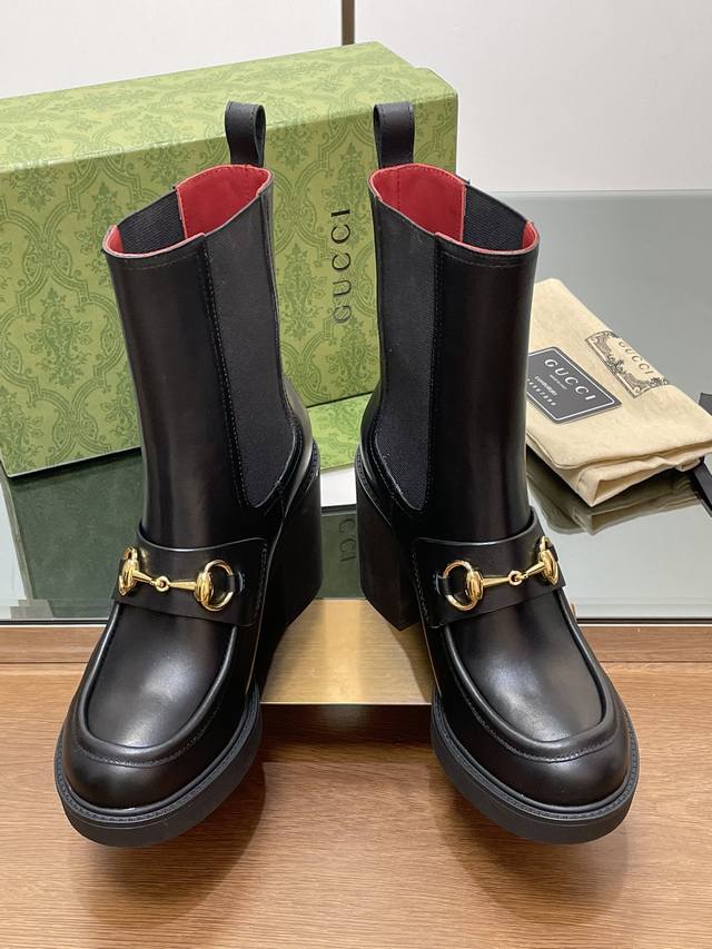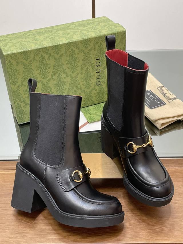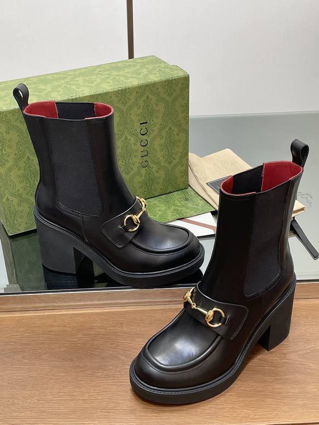 Gucci Fall/Winter Newest High-Heeled Loafer Boots with Bee Sole, Chunky Heel, Horsebit, Platform, Ankola, Burgundy Lined, Cigarette-Style Short Boots - High-End Boutique Item (Retail Purchase Level). These loafers seamlessly blend fashionable elements from boot and soft-top shoe designs, featuring a lightweight foam rubber grooved bee sole. The iconic pattern continues to shine in Gucci's new collection, while the classic horsebit accessory showcases the brand's equestrian heritage. This design enhances the overall appeal, infusing everyday shoes with a refined and sophisticated feel. Material: Imported split-edge beaded calfskin leather + light gold horsebit buckle. Insole: Anchor burgundy silk calfskin leather. Outsole: 1:1 mold-developed high-tenacity rubber foam "little bee" sole. Absolutely not heavy or stiff, and will never collapse. All materials and craftsmanship are consistent with the Y version. Sizes: 35-42 (standard size 404142, custom-made). Heel height: 9 cm. Forefoot: 2.5 cm. Packaging: High-end boutique packaging.
