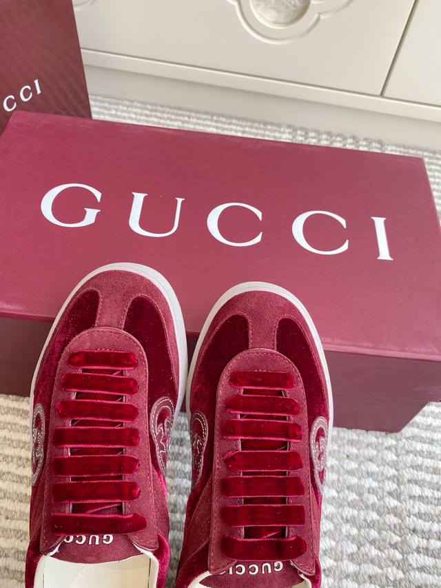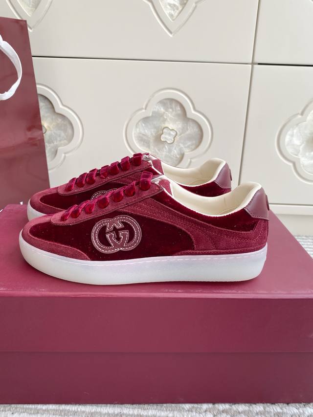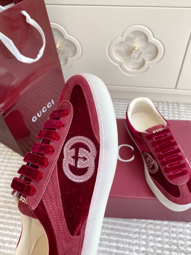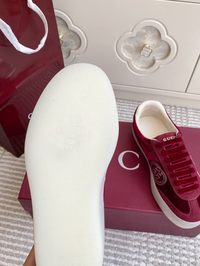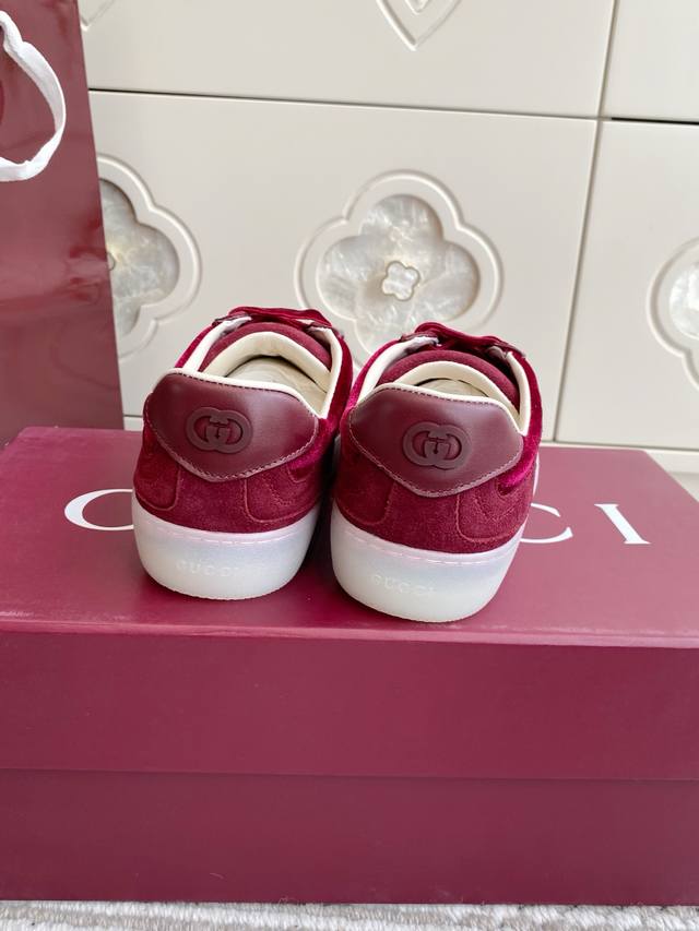 Gucci GG Couple Casual Sports Shoes, German Training Shoes, Cornetto Shoes. The upper features innovative stitching technology to create a flowing, water-like leather design, paired with three-dimensional interlocking double G leather patches and Gucci lettering accessories, achieving a 3D effect for the entire shoe's free-flowing texture. Comes with exquisite boutique packaging. Material: Original custom cowhide velvet. Lining: Original imported sheepskin. Sole: Original molded TPU material. Sole thickness: 2.5cm. Sizes: Women's 35-40, 41 (made-to-order, no returns/exchanges); Men's 39-45, 46 (made-to-order, no returns/exchanges).