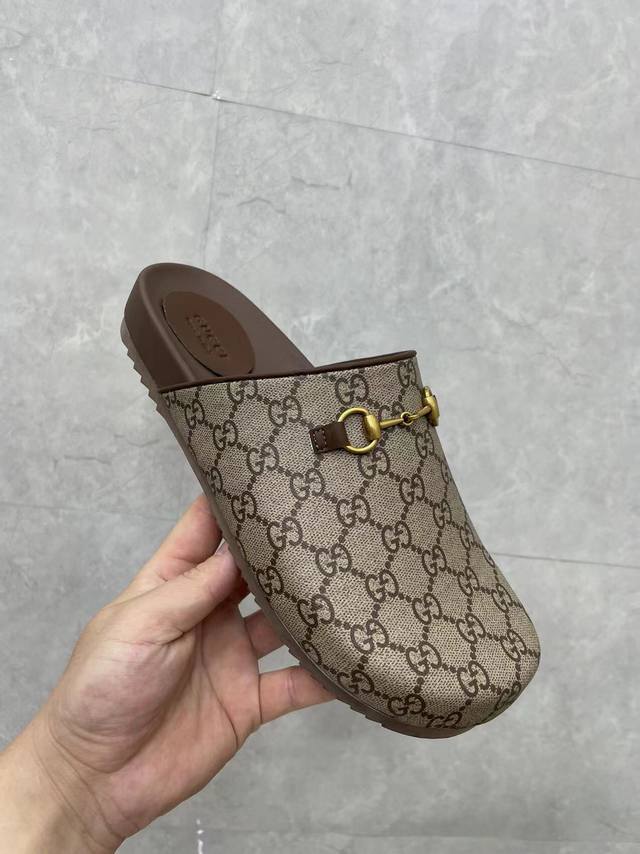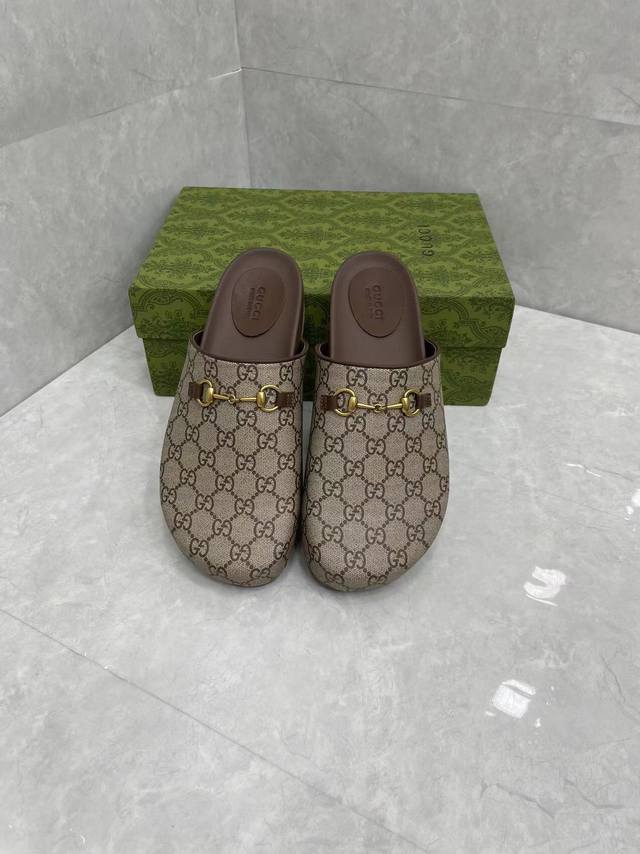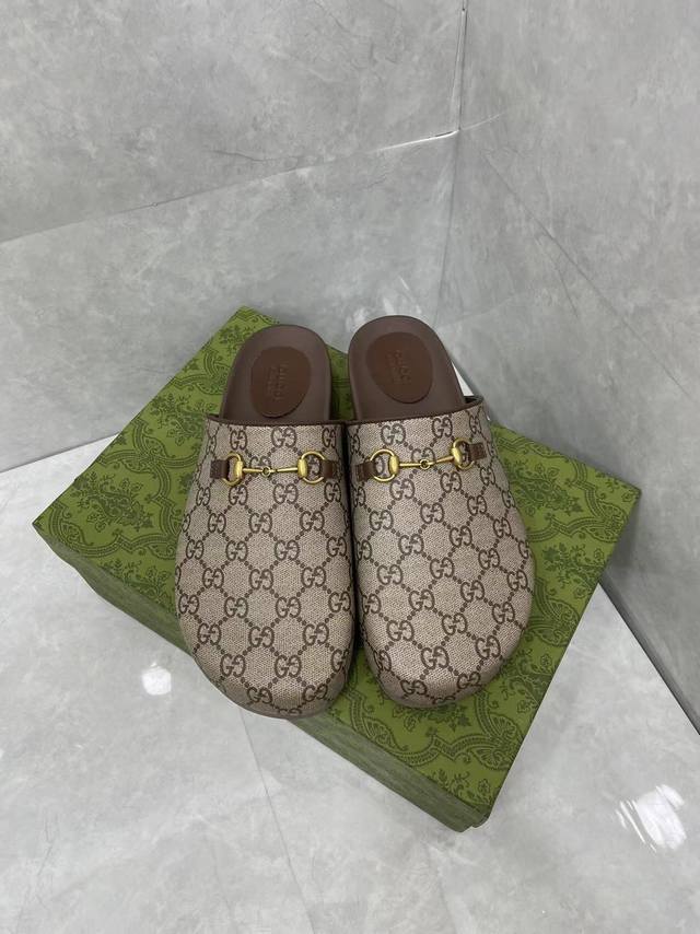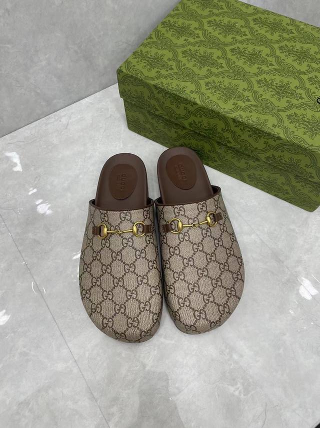Gucci Gg Horsebit Mules for Men and Women. Branded details add a classic touch to these coffee-colored Gg Supreme mules. Inspired by the brand's equestrian heritage, the Horsebit logo adds refined definition and structure to the relaxed silhouette.