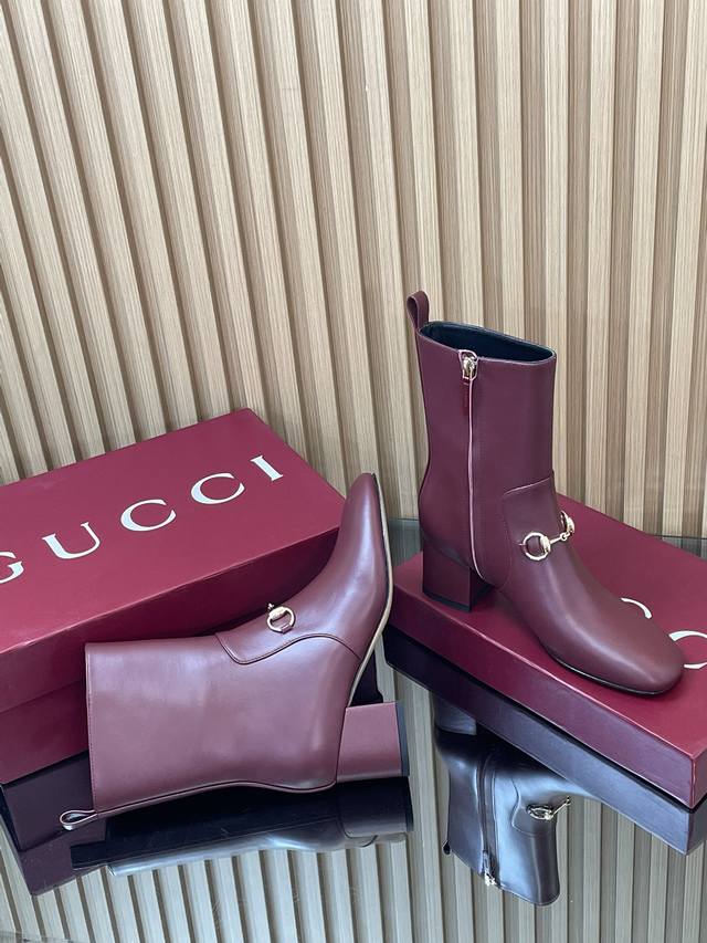 Gucci high-end boutique, 2025 Gucci early autumn new style horsebit ankle boots, classic chunky heel square toe short boots. Authentic original quality, every detail meticulously crafted, comparable to genuine Gucci products, unparalleled quality! Material: Original custom imported calf, Dongguan factory molded horsebit. Lining/Insole: High-end custom sheepskin lining. Heel height: 5.5cm. Outsole: Italian genuine leather. Sizes: 35-42, 40, 41, 42 (made to order, no returns or exchanges). Full set of original high-end packaging! These riding boots are made of leather, cleverly using square toe and three-dimensional square heel design elements to interpret a fashionable retro style. The classic horsebit detail evokes the brand's equestrian origins. Women's side zipper closure. Horsebit detail. Three-dimensional square heel 5.5cm.