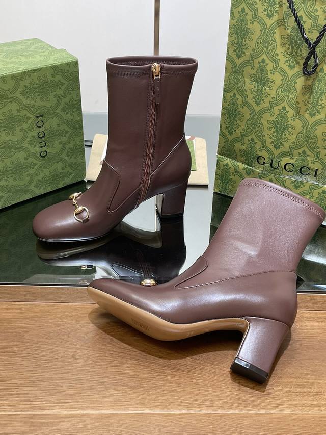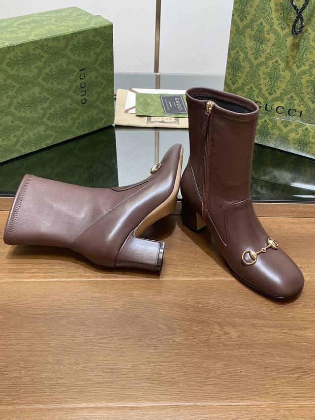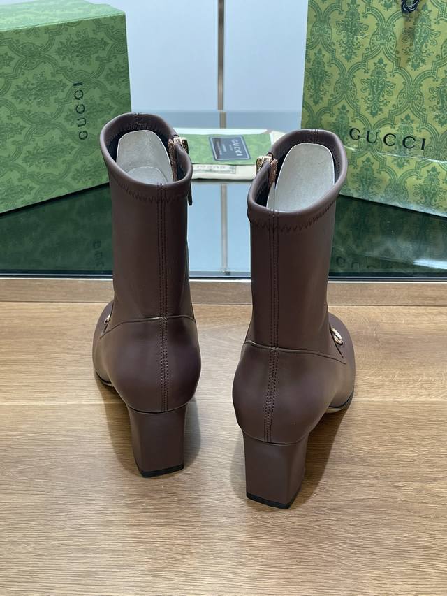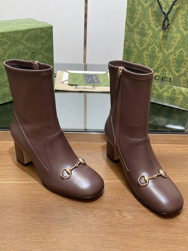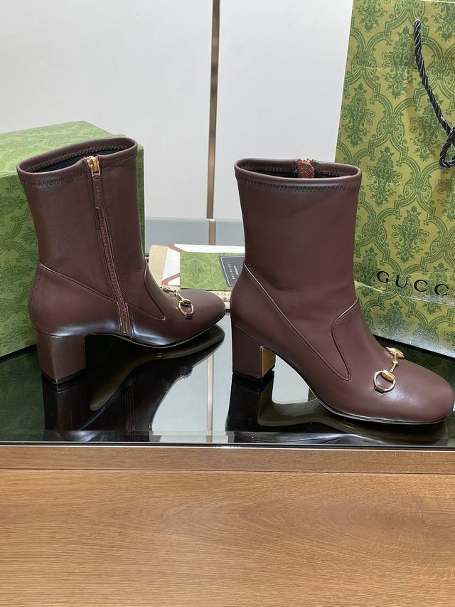 Gucci high-end boutique, Gucci early autumn new style horsebit elastic boots, classic chunky heel square toe ankle boots. Authentic original quality, every detail is meticulously crafted, comparable to genuine Gucci boots, unparalleled quality! Material: Original custom imported calfskin + elastic soft sheepskin, molded by a large factory in Dongguan. Hardware: Horsebit buckle. Lining/Insole: High-end custom sheepskin lining. Heel height: 6.5cm. Outsole: Italian genuine leather. Sizes: 35-42, 40, 41, 42. Made to order, no returns or exchanges. Full original high-end packaging! These riding boots are made of leather, cleverly using square toe and three-dimensional square heel design elements to interpret a fashionable retro style. The classic horsebit detail is reminiscent of the brand's equestrian origins.