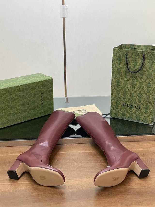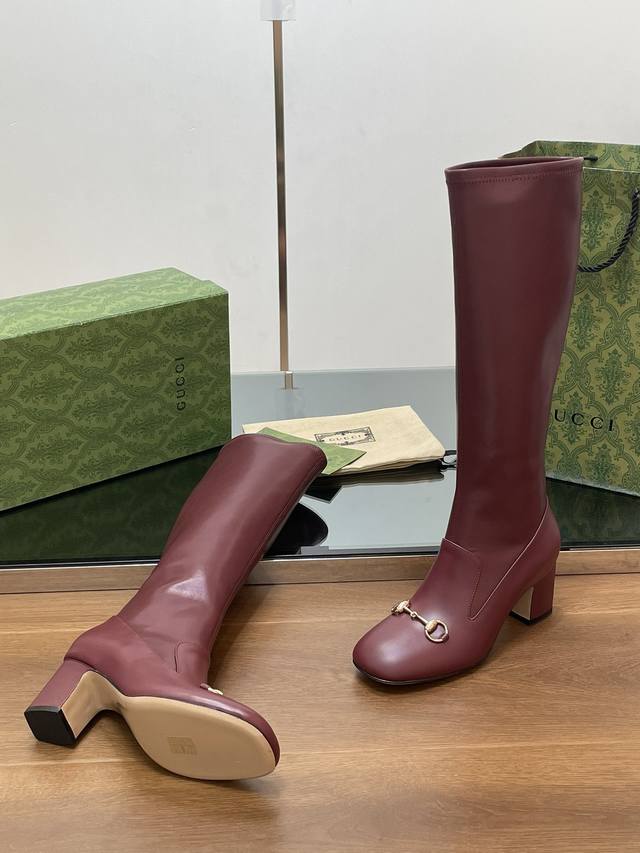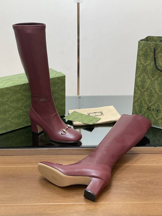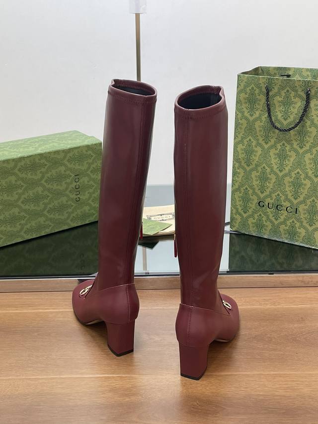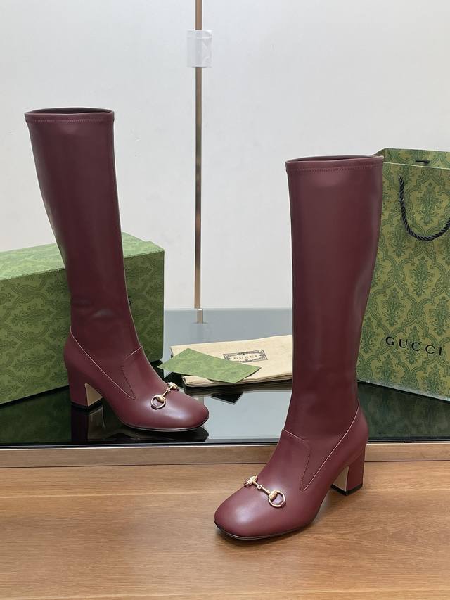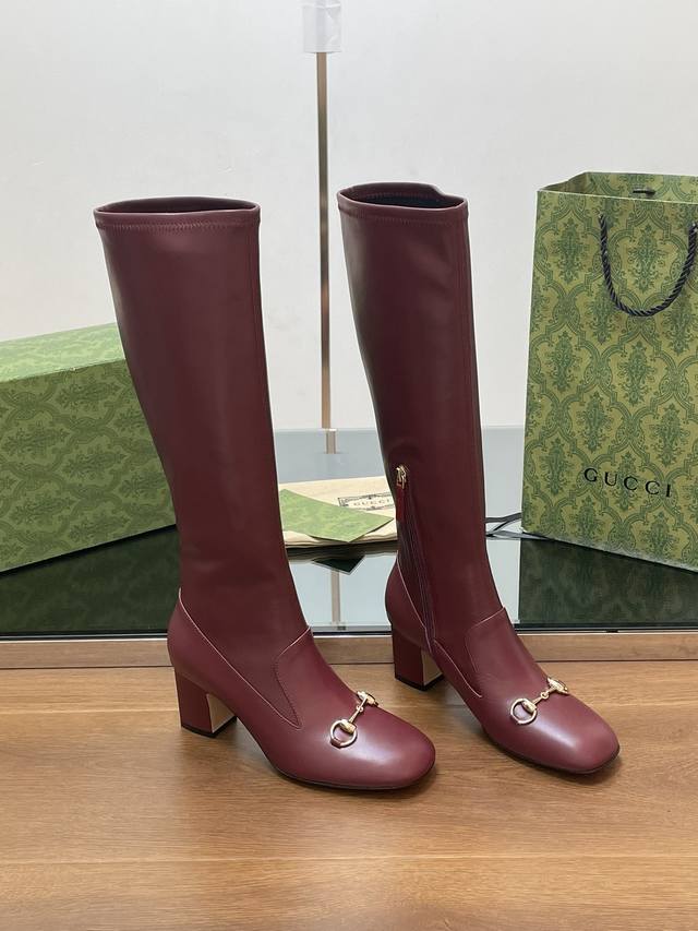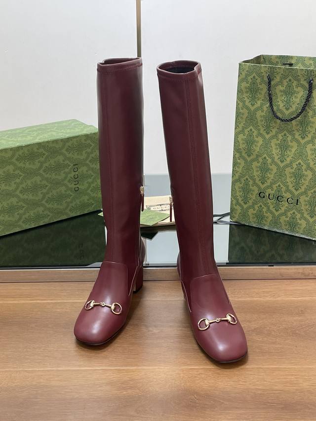 Gucci high-end boutique, Gucci early autumn new style horsebit elastic high-top boots, knee-high boots, clearance sale, classic chunky heel square toe ankle boots. Authentic original quality, every detail is meticulously crafted, comparable to ZG, unparalleled quality! Material: Original custom imported calfskin + elastic soft sheepskin, Dongguan factory mold opening, hardware horsebit buckle. Lining/Insole: High-end custom sheepskin lining. Heel height: 6.5cm. Outsole: Italian genuine leather sole. Sizes: 35-42, 40, 41, 42. Made to order, no returns or exchanges. Full original high-end packaging! These riding boots are made of leather, cleverly using square toe and three-dimensional square heel design elements to interpret a fashionable retro style. The elongating and slimming leg design, along with the classic horsebit detail, evokes the brand's equestrian origins.