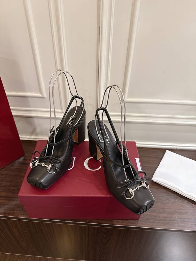 , Fall/Winter 2025 Collection). These horsebit pumps feature a square toe design with elegant bow details, paying homage to traditional ballet flats. Crafted from leather and adorned with light gold hardware, the "Sacchetto" construction ensures exceptional comfort. Heel height: 9.5cm. Imported sheepskin lining. Sizes 35-42. Custom orders are non-refundable.