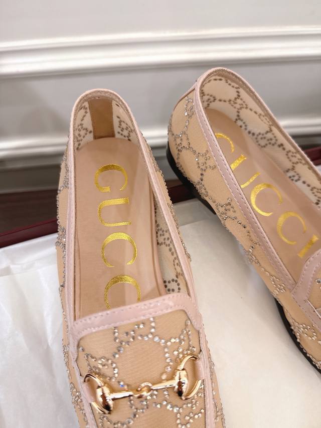 As an outstanding representative of Gucci's design heritage, the Jordaan series horsebit loafers vividly showcase classic elegance. These shoes are crafted from select mesh crystal rhinestones, with a touch of light gold incorporating the classic horsebit design.