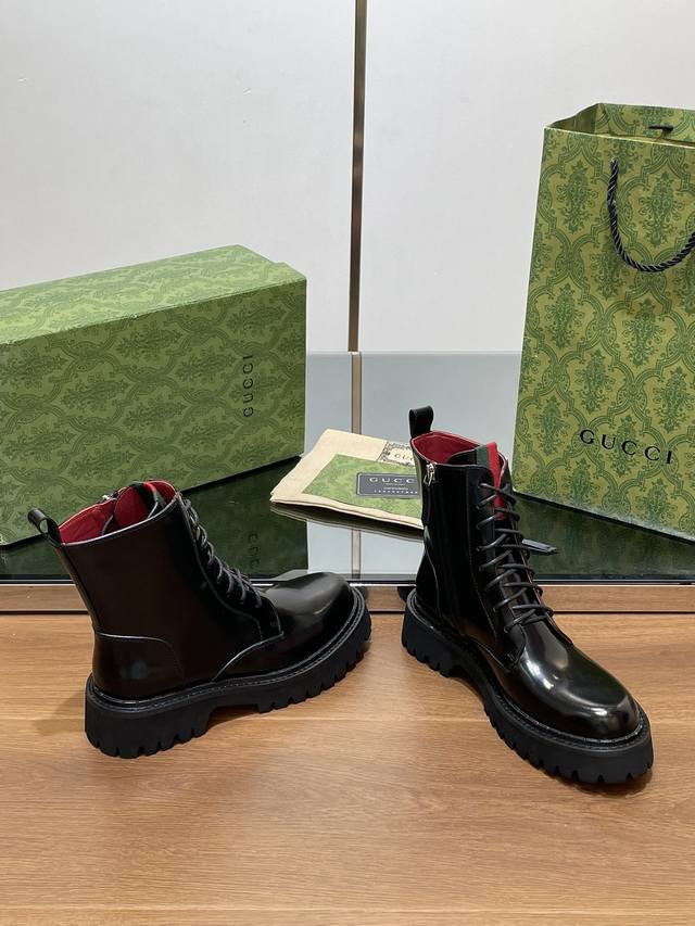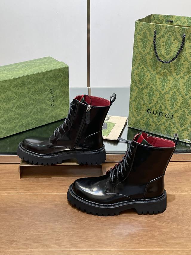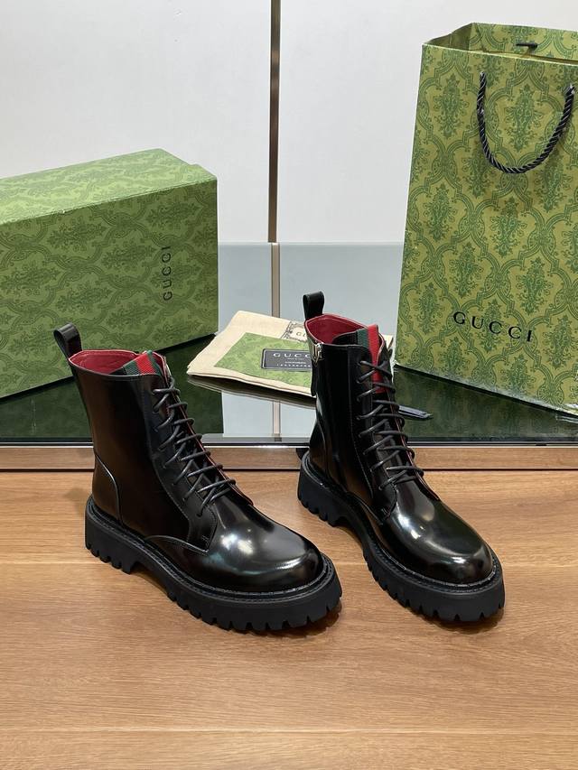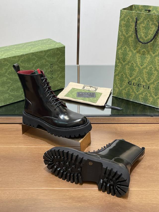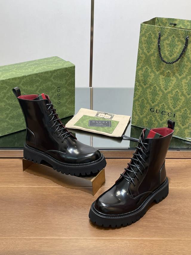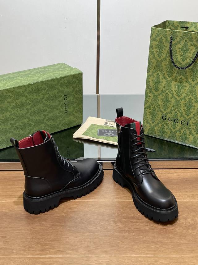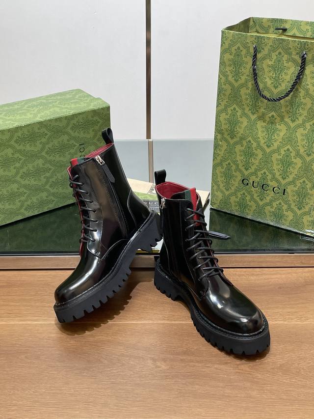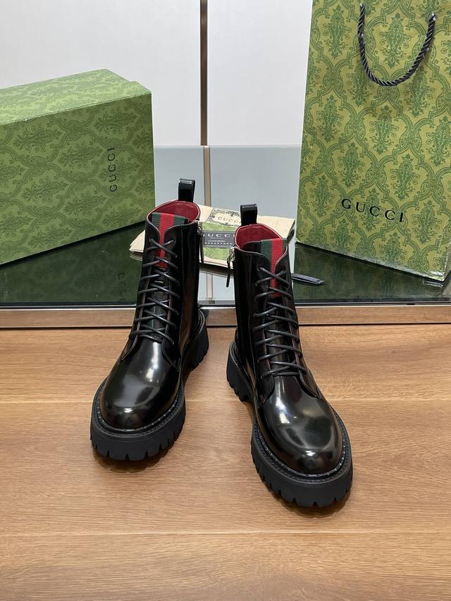 Gucci New Autumn/Winter Collection: Red and Green Webbing Side Zipper Lace-up Ankle Boots, Grooved Platform Ankle Boots, Chelsea Boots, Cigarette Boots - High-End Boutique Item (Retail Purchase Level). Original brand details from the 1990s are given a romantic new life on this shoe. The striped webbing, inspired by the equestrian world, has become a symbol of high-class clubs and is making a comeback in a new way. This boot is made of calfskin and split-bead leather, with a rubber grooved sole, webbing tongue, and elastic laces. Material: Imported split-bead silk calfskin + red and green webbing. Lining: Water-staining cowhide. Outsole: 1:1 mold developed rubber foam high-tenacity grooved sole, absolutely not heavy or stiff, and will never collapse. All materials and craftsmanship are consistent with the original. Size: 35-42 (Standard size 404142, custom made). Heel height: Approx. 5cm. Packaging: High-end boutique packaging.