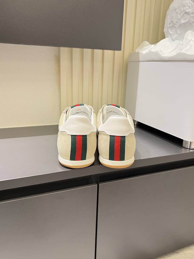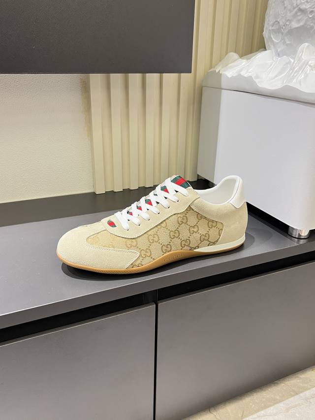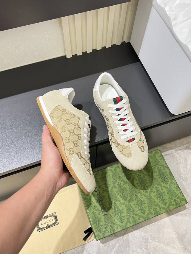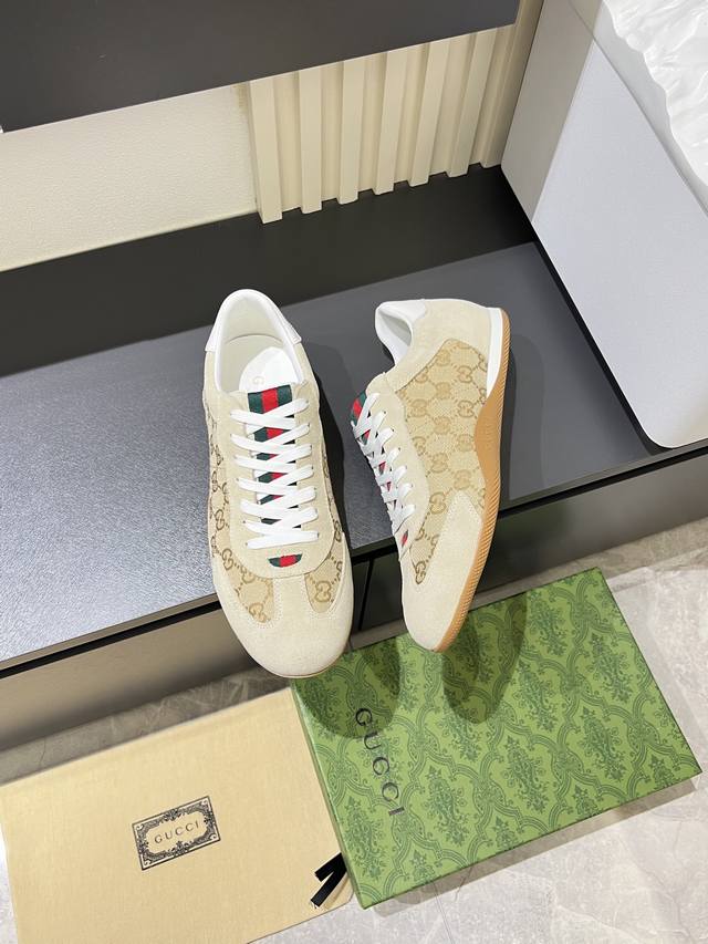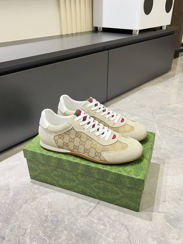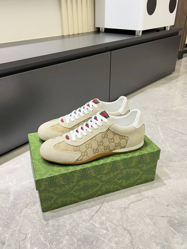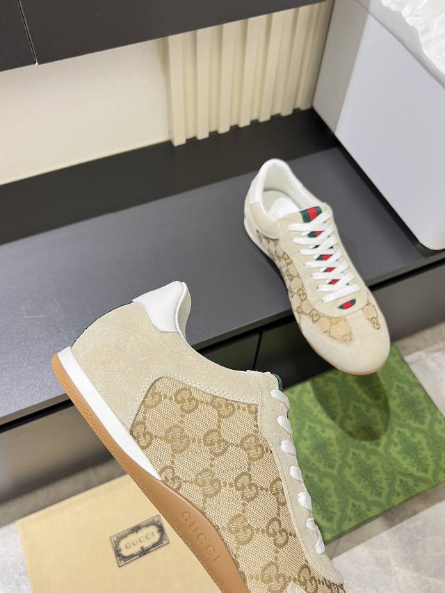 Gucci Shift series sneakers, featuring a lightweight, thin-soled design, combining suede, canvas, and technical materials for a premium feel! The tongue and heel feature red and green webbing, making them highly recognizable. The classic brown and off-white color scheme is both retro and modern. The shell-toe design makes feet appear smaller, making them a great choice for everyday wear or with skirts and trousers. The woven upper and elastic heel make them easy to slip on and off, providing a comfortable fit. Suitable for both work and casual occasions, these are one of the hottest items since Demna Gvasalia took over. Sizes: 38-45!