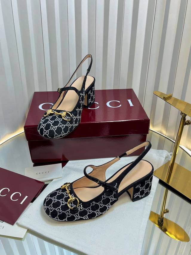 Gucci Women's Double G Rhinestone Horsebit Strappy Sandals. This shallow-cut sandal is crafted from canvas with GG rhinestones, ingeniously incorporating the classic Horsebit design. The round toe and adjustable ankle buckle complement each other perfectly, while the light gold Double G hardware subtly echoes the brand's instantly recognizable logo. This sandal showcases a preppy aesthetic. Lined with custom sheepskin and Italian leather, the sole features a 6cm heel. Available in sizes 35-42, 40, 41, and 42. Made to order and non-refundable.