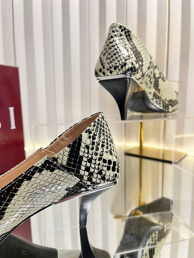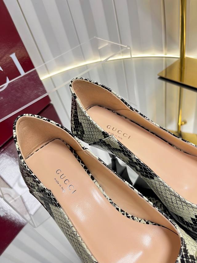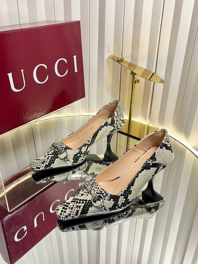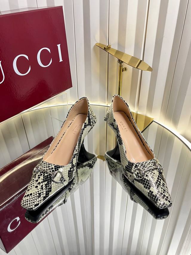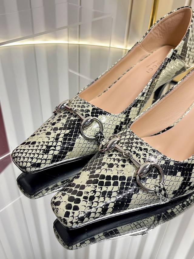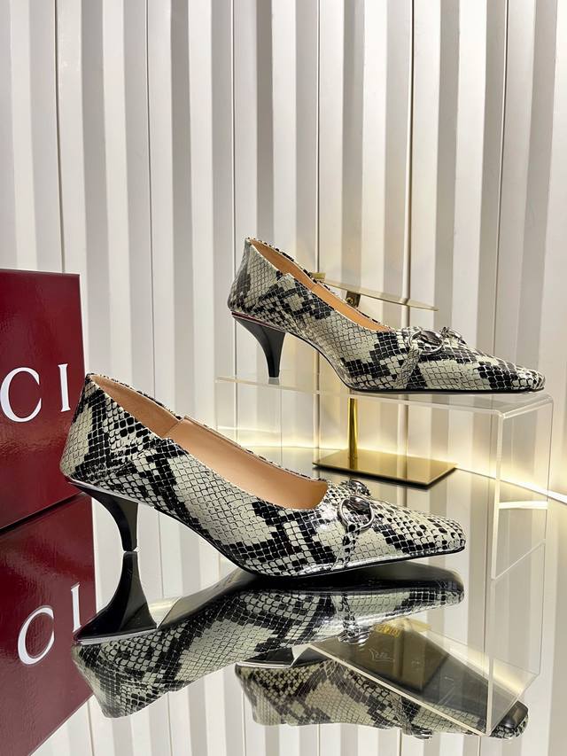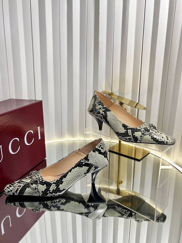 Gucci Women's New Horsebit Shoes. The upper features the most classic and iconic logo. A tribute to understated luxury, the shoe's most eye-catching feature is the soft sheepskin heel, which can be worn loosely or dragged. It's versatile enough to pair with trousers or skirts, suitable for any occasion, seamlessly blending rich historical heritage with modern style. Crafted from supple sheepskin. A pair that meets all the needs of fashionistas. Features include: Italian imported sheepskin and snakeskin upper; Italian imported sheepskin insole; imported genuine leather outsole; 6cm heel height; sizes 35-42; sizes 40, 41, and 42 are custom-made and non-refundable.