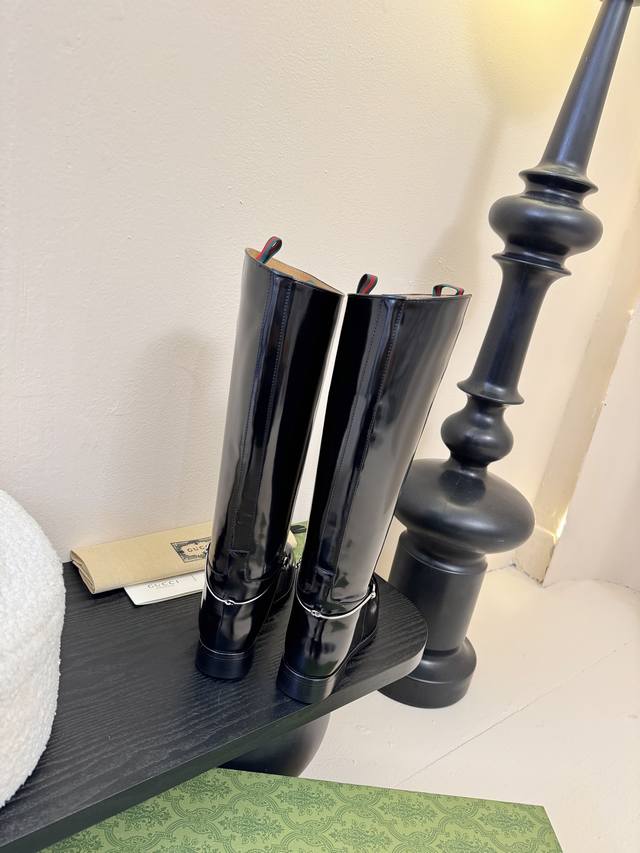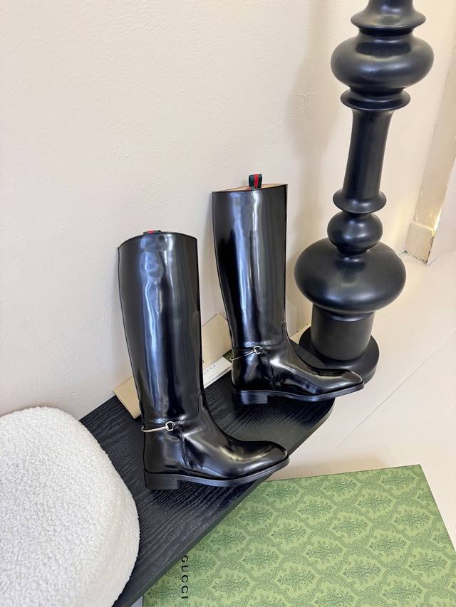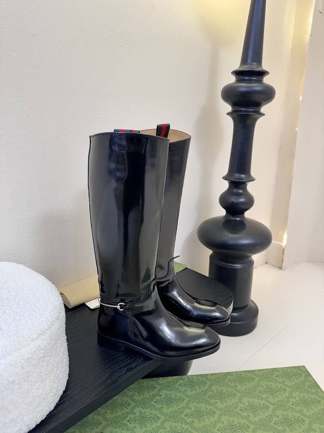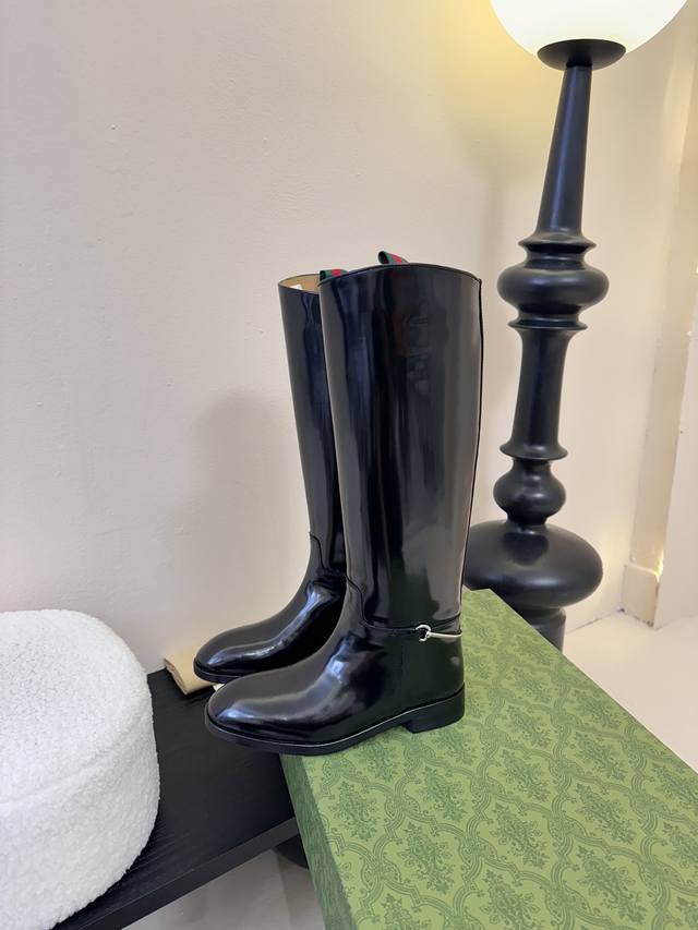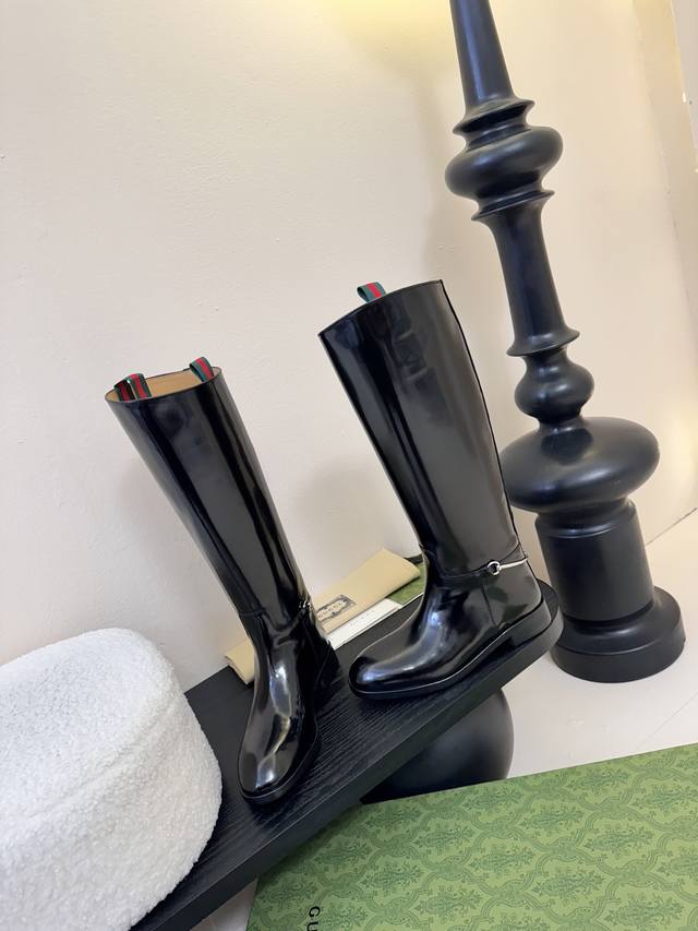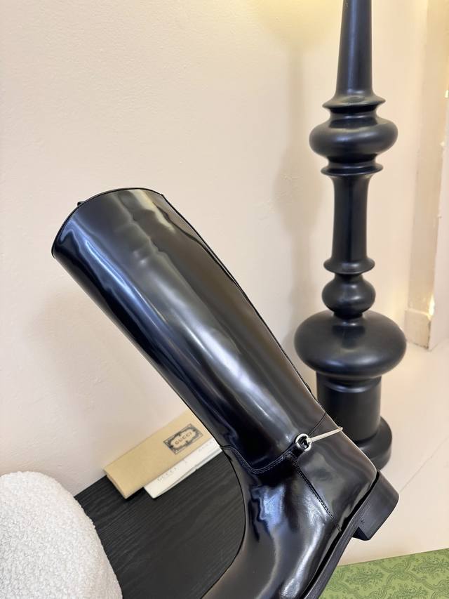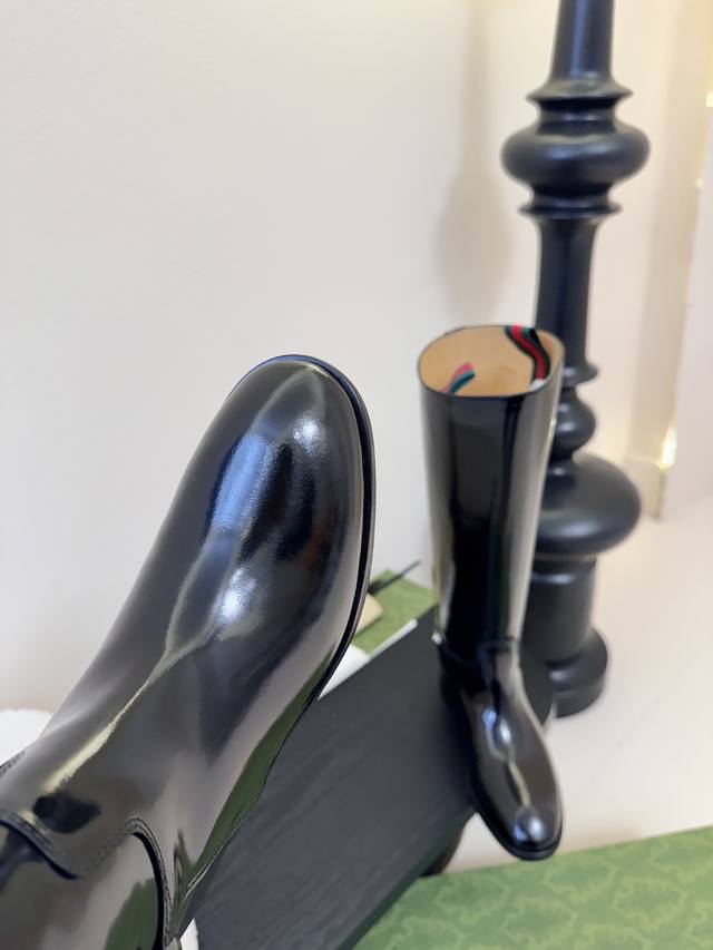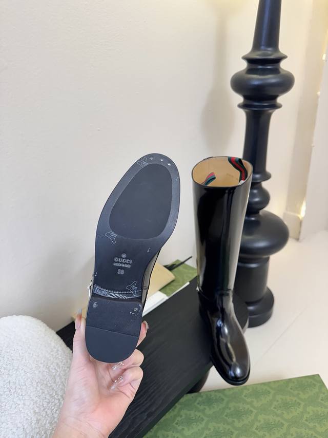 Gucci's autumn/winter runway equestrian boots are seriously cool this season! The classic boot shape is highlighted by the brand logo in every detail, and they look really good on the feet. I've been ordering this pair at the counter for a long time and finally got it! It's so hard to find one size! These shoes are very intricately made. The upper is imported, the beaded toe is handmade, and the entire shoe has a full shape. The heel and the entire belt are made of cowhide, and the interior is a single piece of cowhide without any stitching. The Italian leather sole has a 2.5-inch heel height, the boot shaft is 16 inches high, the upper shaft circumference is 370mm, and the 4-inch circumference is 300mm. Sizes: 35-40