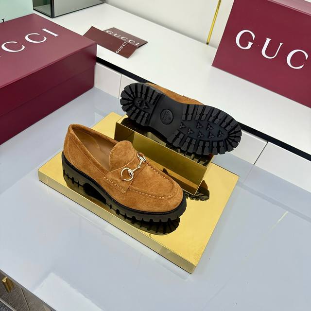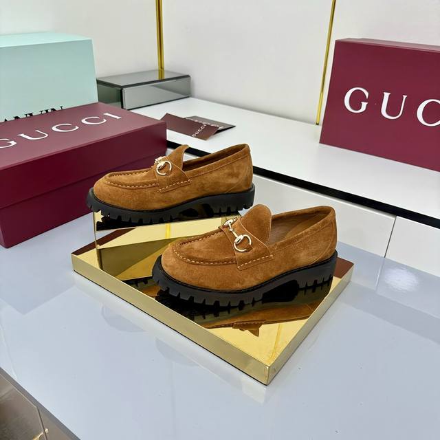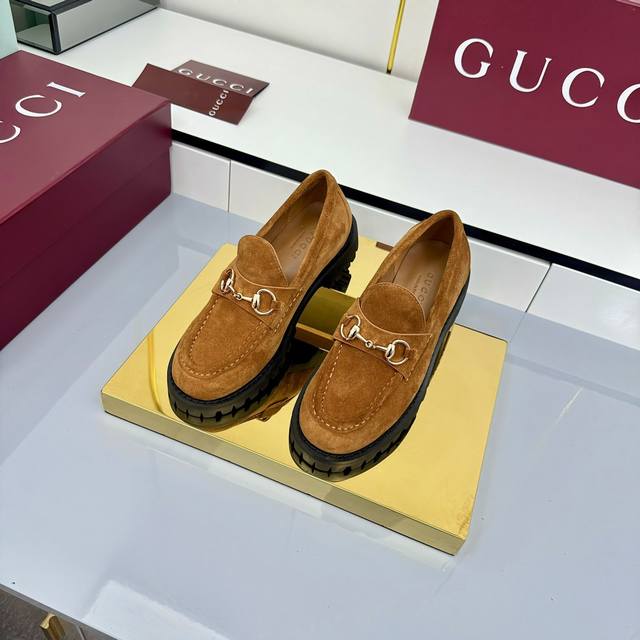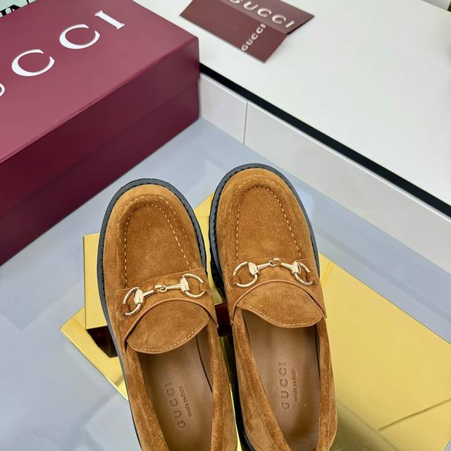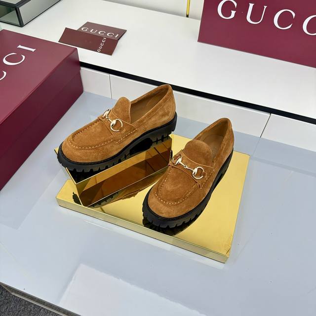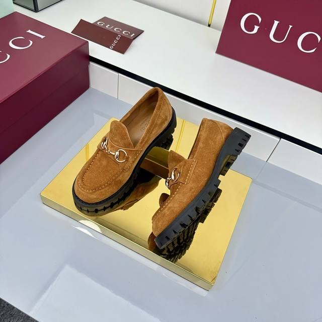 Gucci's exquisite details infuse these loafers with elegance. Crafted from smooth suede and paired with a grooved rubber sole, the design is further enhanced. The light gold horsebit adds a touch of brand identity to this classic yet modern design. [Dark brown suede material, light gold hardware, horsebit, grooved rubber sole, flat, size 35-42, height: 3cm]