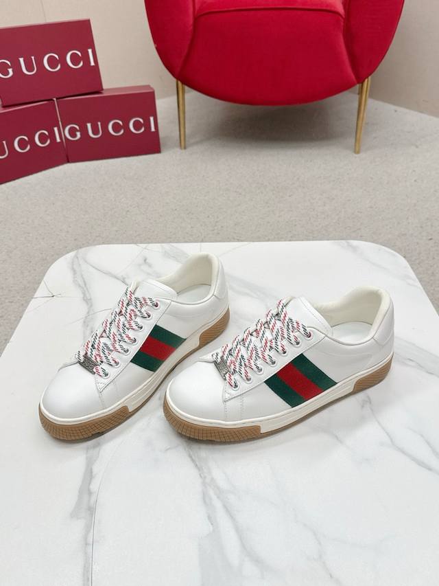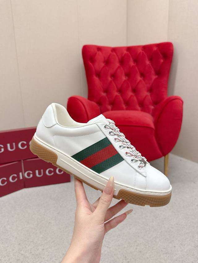 Gucci's latest Ace series casual sneakers, a celebrity favorite. Classic brown canvas and leather combination, with distinctive red and green stripes on the side. Perfect last, great for everyday casual wear, super comfortable and stylish, a must-have for trendsetters. Material: Original custom imported top-grain cowhide. Lining: Custom imported cowhide. Outsole: Original molded anti-slip TPU sole. Sole thickness: 2.5cm. Size: Men's 39-44, 45 (custom sizes, no returns or exchanges).