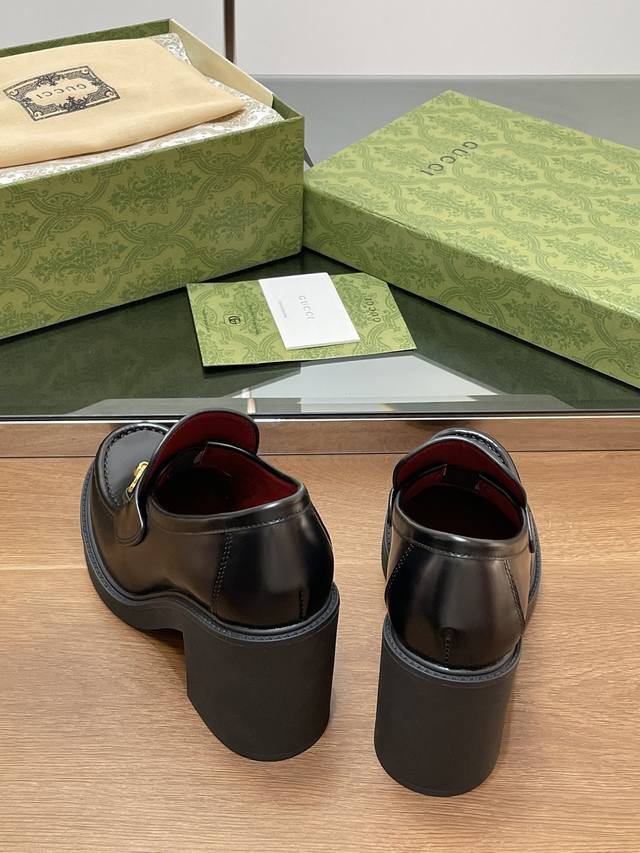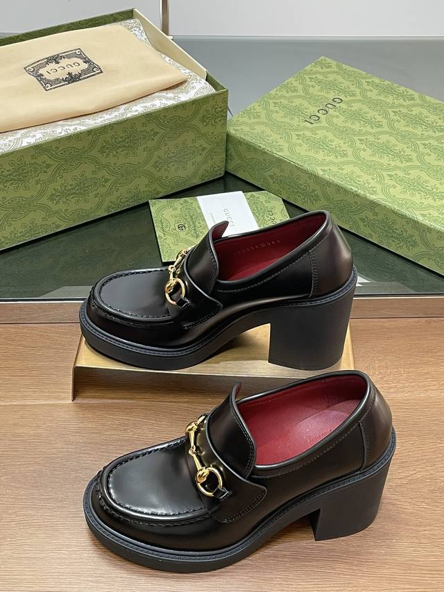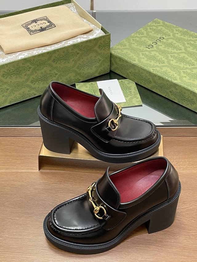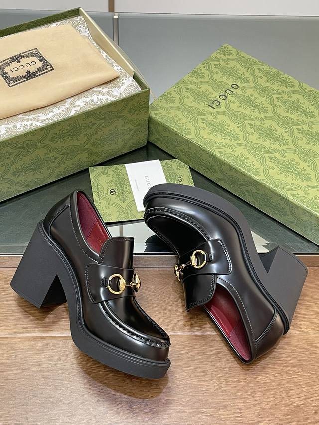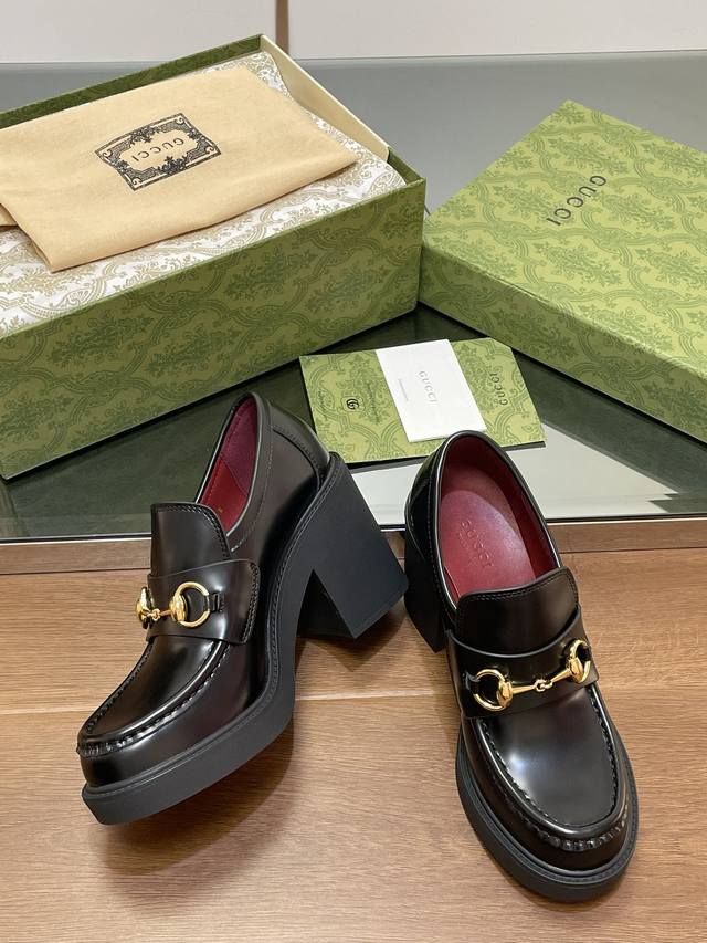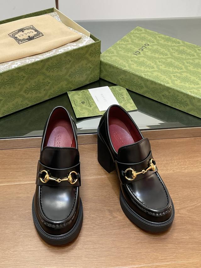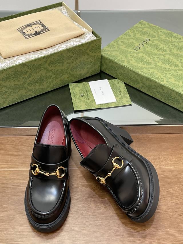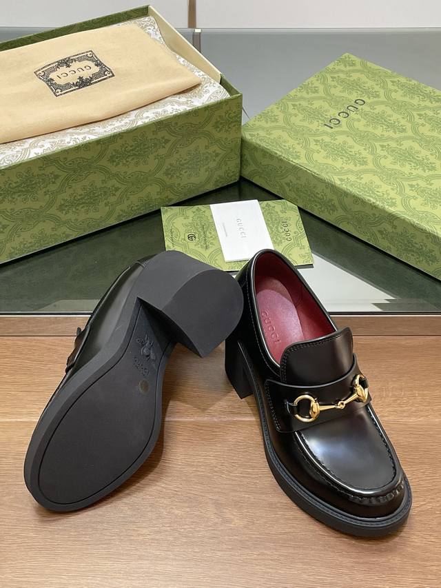 Gucci's latest autumn and winter Gucci high-heeled shoes with bee-soled thick-heeled shoes, horsebit thick-soled loafers, ankora burgundy lining, single shoes, purchasing level, high-end boutique products