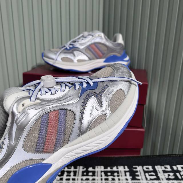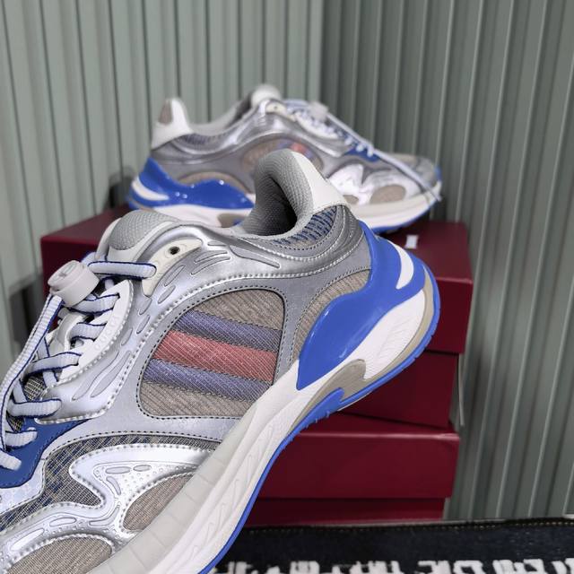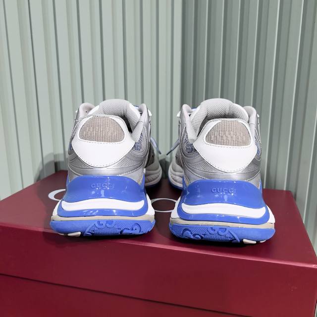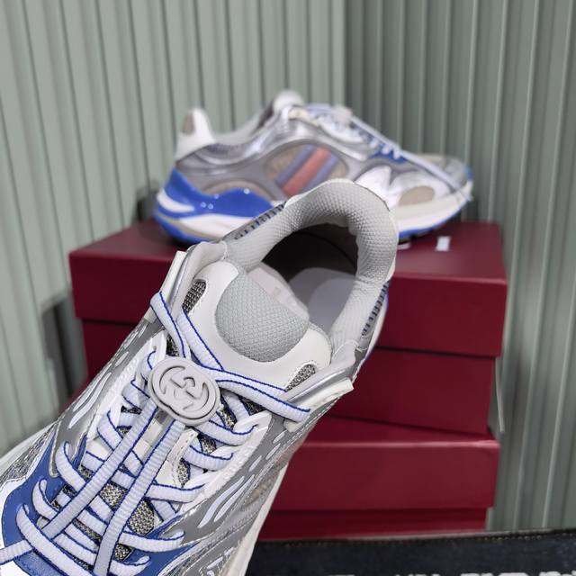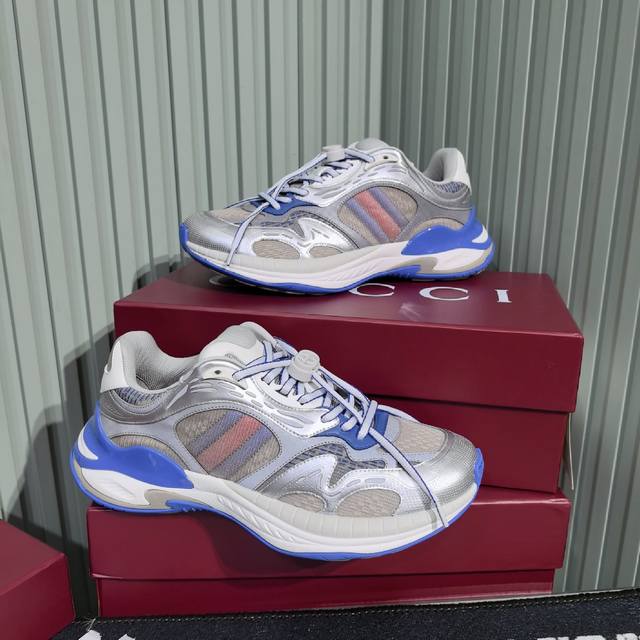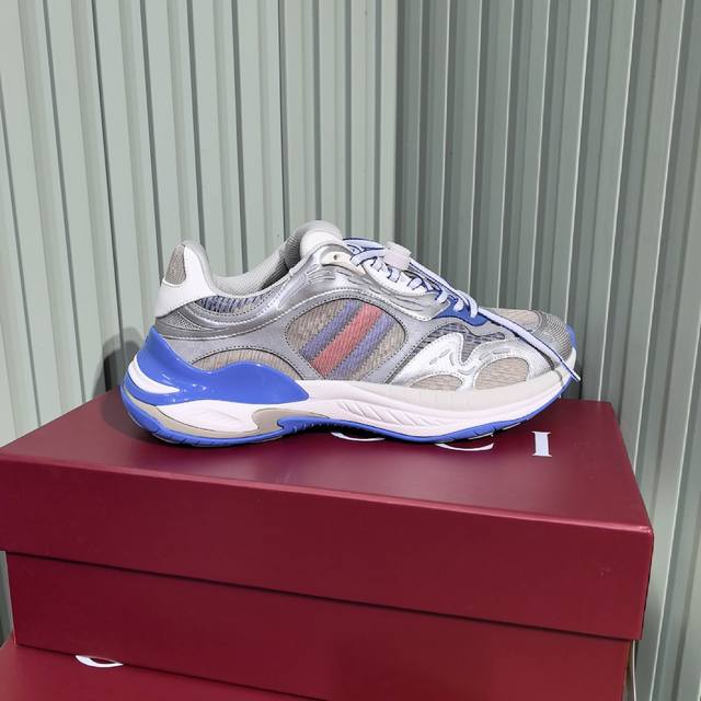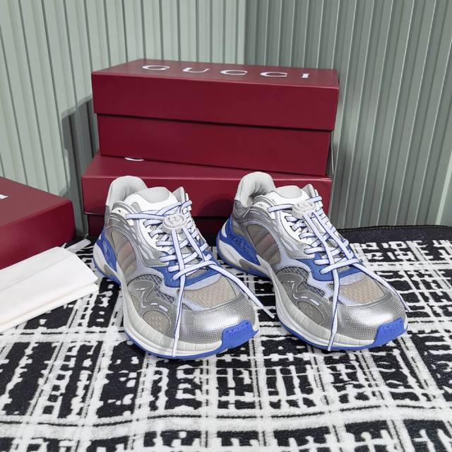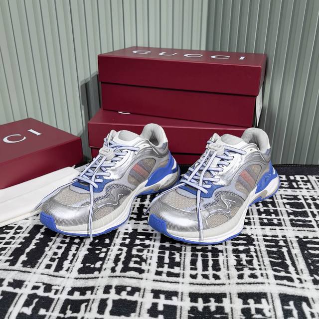 Gucci's new couple's casual sneakers feature a fresh take on the brand's signature striped Web design. These shoes reinterpret the iconic details with a thick EVA sole and a dynamic silhouette for a secure and comfortable fit. Leather lining. GG reflective piping and a GG EVA rubber sole with Web detailing. Lace-up fastening with interlocking GG laces. Thick sole approximately 5cm. Sizes: 35-44. Women's 40 - Men's 45. Custom sizes. Non-returnable.