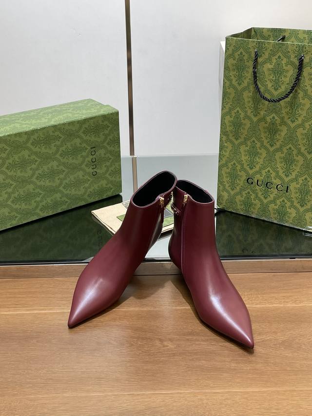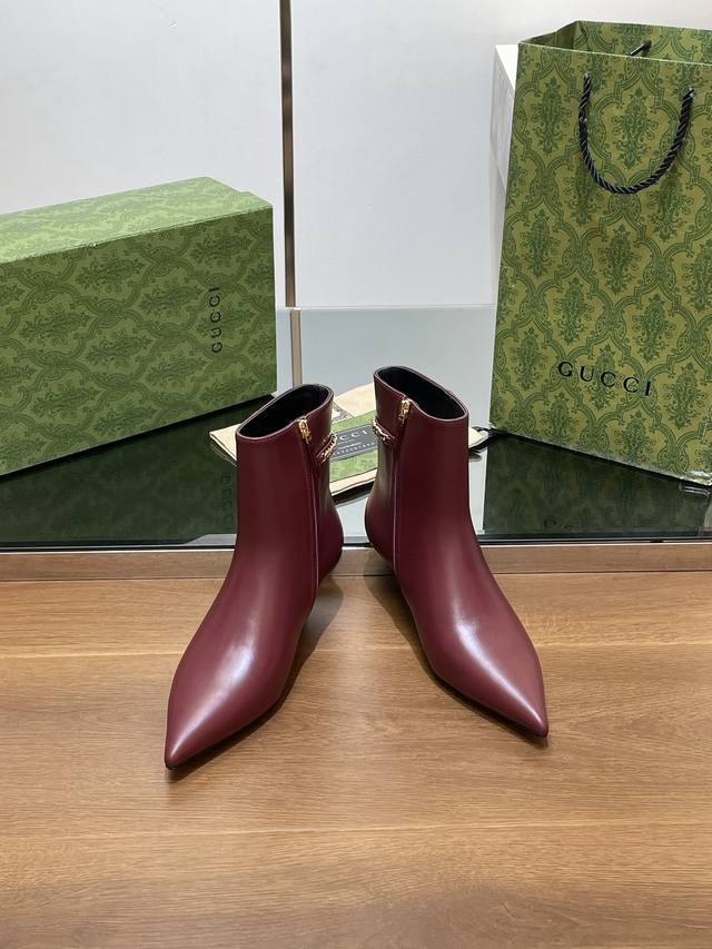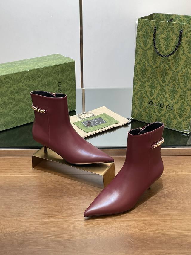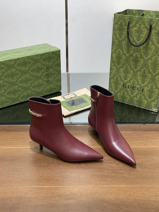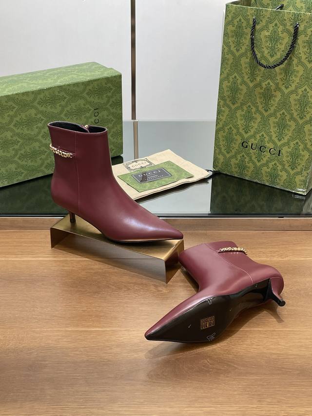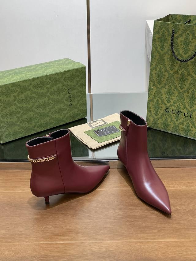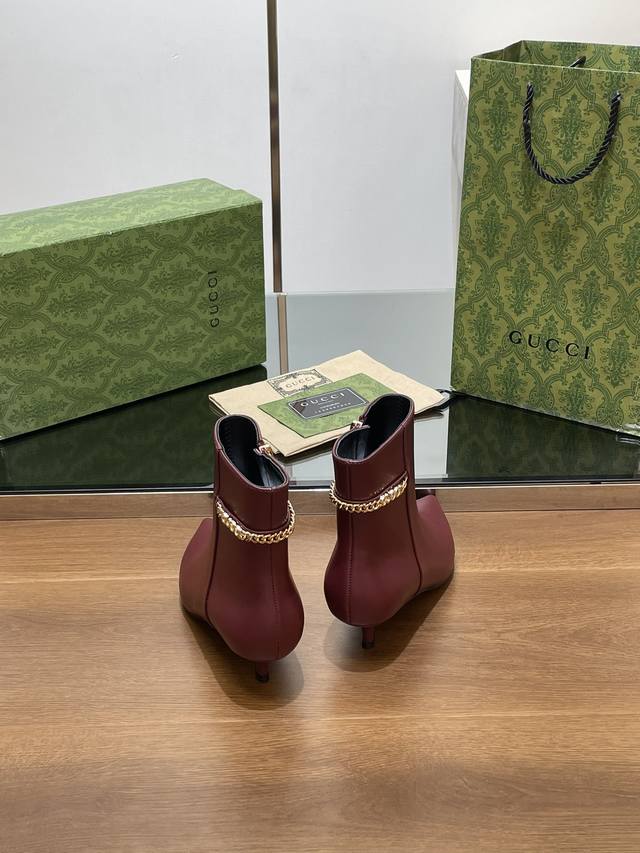 Gucci's new Gucci logo chain mid-heel ankle boots, pointed toe, no-shoulder style, factory price. Top-tier version, welcome to compare. 1:1 replica of the original. Note that many common versions on the market have incorrect linings, please recognize our authentic product. Upper: Full-grain high-grade calfskin. Lining/Insole: Full-grain high-grade lambskin. Sole: Italian top-grade genuine leather. Heel height: 4.5cm. Sizes: 35-42, 41, 40, 42. Custom orders are non-refundable. Packaging: Original full set of green packaging. Gucci's creative director introduces new pointed-toe chain ankle boots, a commitment to gender equality and advocating for women's empowerment. The pointed toe with chic chain details showcases beauty, strength, and a spirit of freedom.