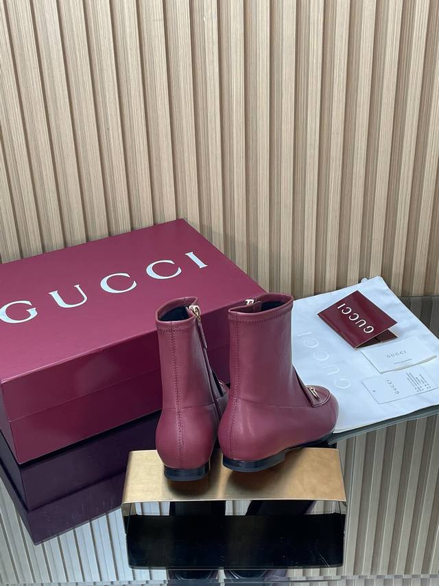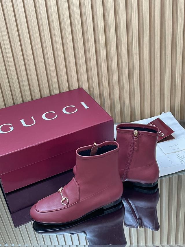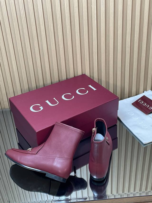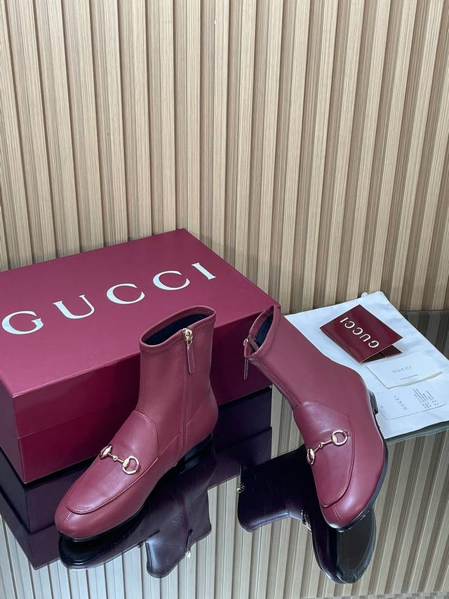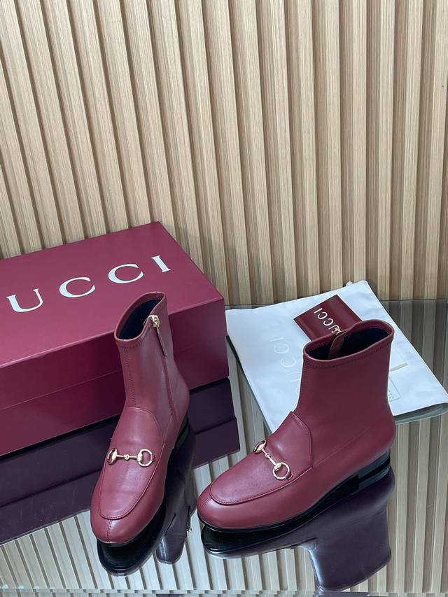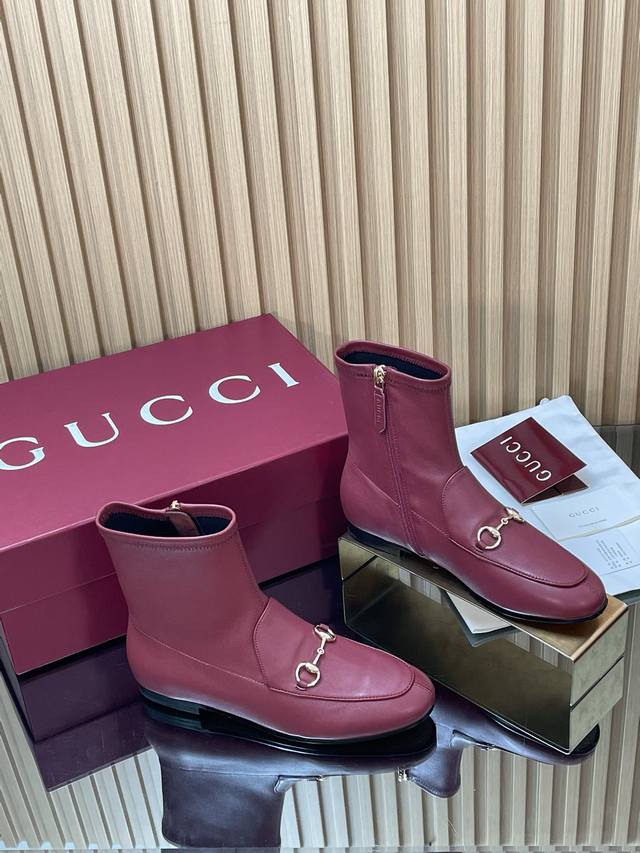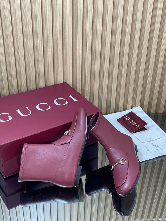 Guccl High-End Boutique, 2025 Autumn/Winter New Horsebit Elastic Mid-Calf Boots, Classic Loafers, Ankle Boots, Runway New Arrival, Authentic Original Quality. Every detail is meticulously crafted, comparable to ZG, unparalleled quality! Material: Original custom imported calfskin + elastic soft sheepskin. Dongguan factory mold-made hardware, horsebit buckle. Lining/Insole: High-end custom sheepskin lining. Outsole: Italian genuine leather. Sizes: 35-42, 40, 41, 42 (Made to order, no returns or exchanges). Full original high-end packaging! These riding boots are made of leather, cleverly using square toes and loafer design elements to interpret a fashionable retro style. The elongating and slimming horsebit detail evokes the brand's equestrian origins.