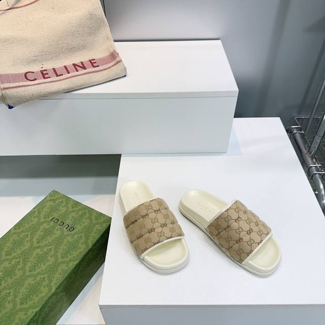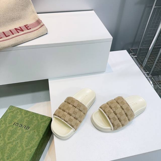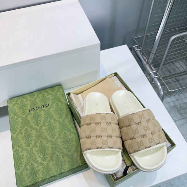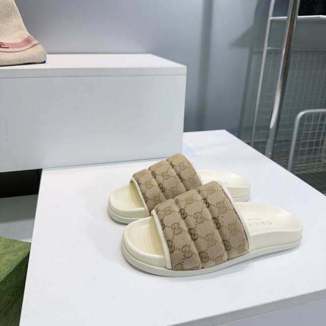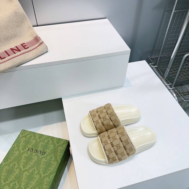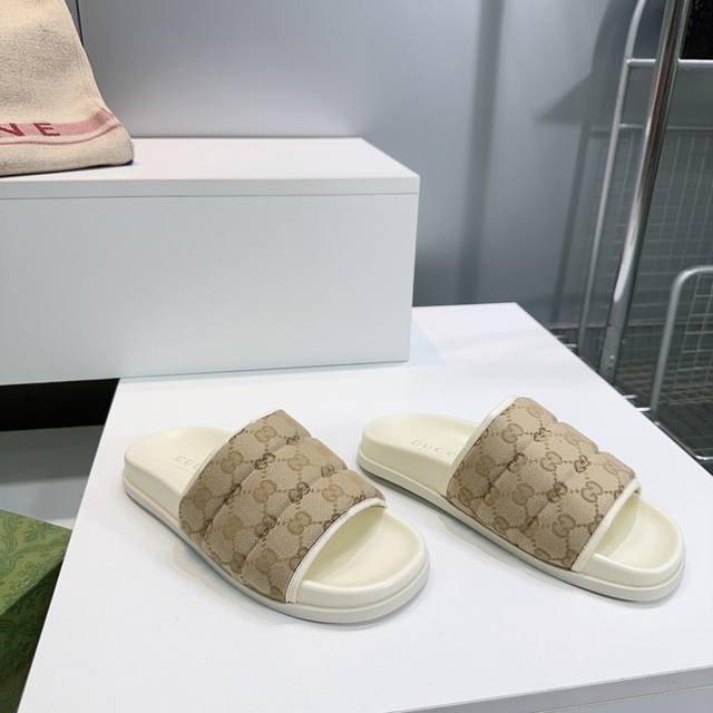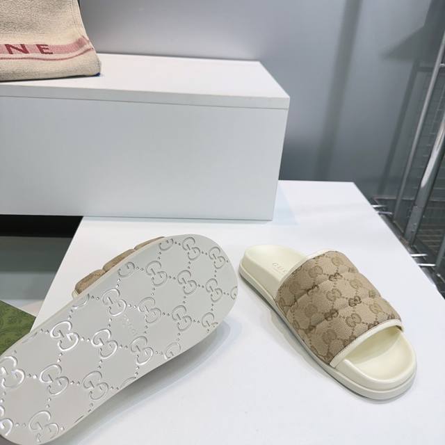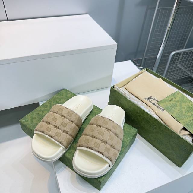 High-quality factory! Top quality Gucci Spring/Summer 2025 new beach sandals, latest Spring/Summer double Gg embroidered monogram series sponge cloud bread sandals, new thick-soled sandals DDD These sandals are made with classic Gg embroidered monogram canvas, featuring iconic traditional classic elements! One-piece wide stripe with cloud bread style paired with rubber sole, creating an outstanding shoe design! DDD The upper is made of original custom Gg embroidered canvas DDD The inner lining is sheepskin DDD Original molded platform combined with rubber outsole DDD Sizes: 35-42 40, 41, 42 are non-refundable DDD Comes with original packaging DDD