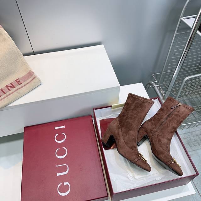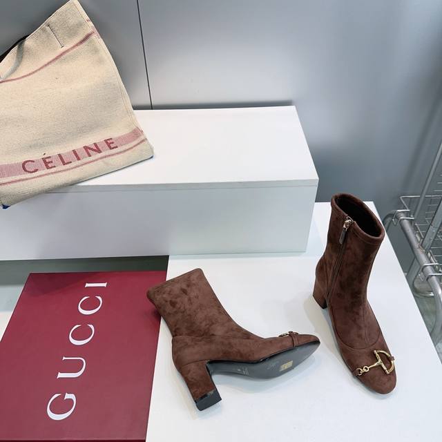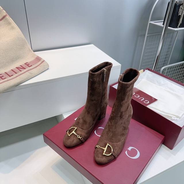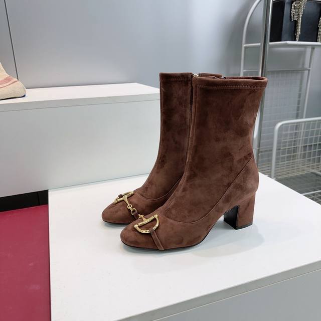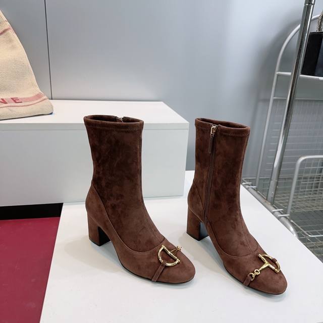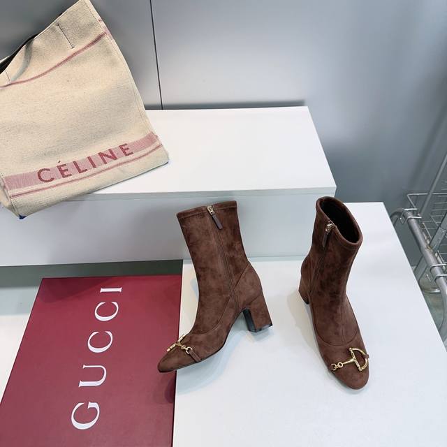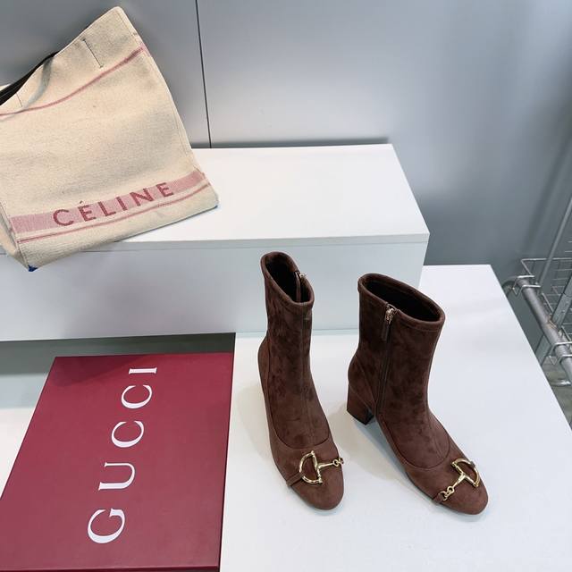 High-quality factory! Top-quality Gucci 25Ss Fall/Winter new arrival classic horsebit hardware chunky heel stretch ankle boots! Reimagining winter ankle style with iconic aesthetics. Light gold horsebit embellishes the boot upper, replicating the brand's 70-year classic symbol. Every metallic texture hides the secrets of luxurious craftsmanship. The stretchy fabric precisely fits the ankle, eliminating any feeling of restriction, allowing for natural and comfortable movement with every step. The perfectly designed chunky heel balances stability and flattering silhouette. Chunky heels are a beginner-friendly choice for high heel wearers. The delicate texture of the leather sole adds to the overall appeal. Effortlessly transitioning between retro and modern styles, from work trousers to weekend knit dresses. DDD Made with imported elastic sheepskin fabric; DDD The inner lining and toe box are also made of sheepskin; DDD Italian imported genuine leather outsole; DDD Heel height: approximately 7cm; DDD Sizes: 35-42; Sizes 40, 41, and 42 are non-refundable and non-exchangeable; DDD Comes with original packaging; DDD