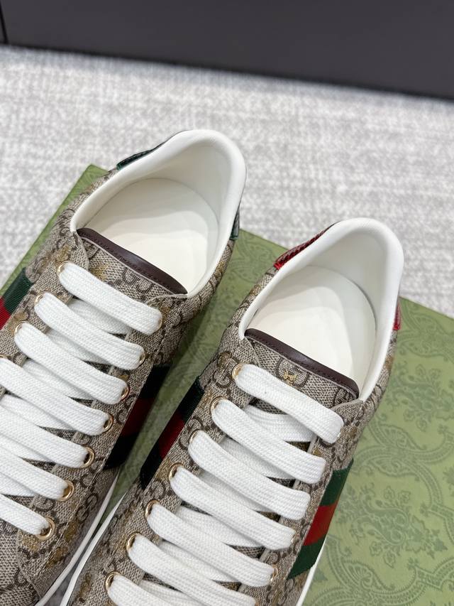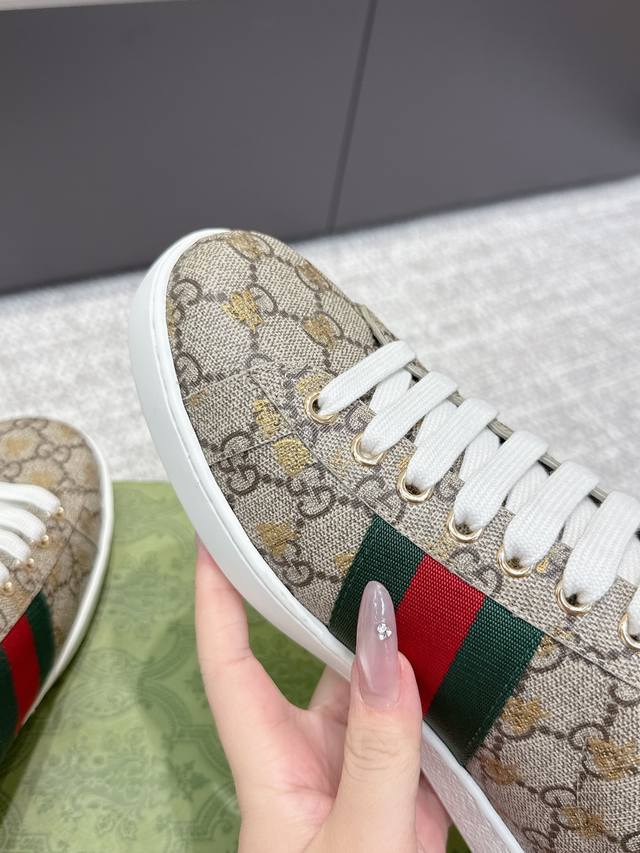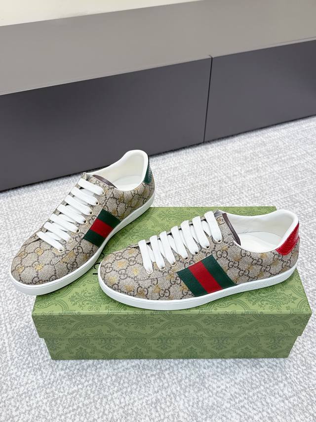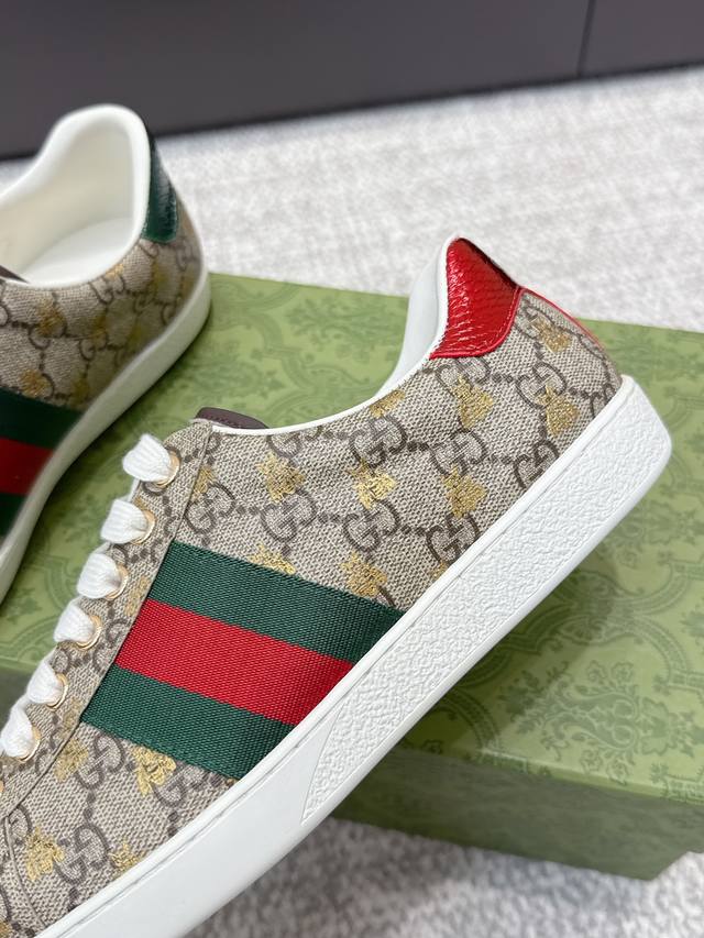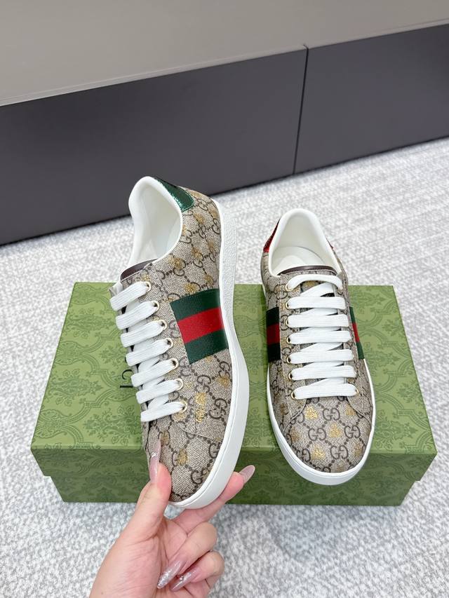 High-quality Gucci 2025Ss classic bee couple white sneakers. Classic design, simple and elegant, the white upper paired with the black logo looks very stylish. The sole uses durable rubber material, making them comfortable to wear and very stable to walk in. They can be easily paired with trousers or skirts to create different fashionable looks. Upper: Original custom cowhide leather. Lining: Top layer cowhide lining. Outsole: Original outsole. Sizes: Women's 35-39, 40 available; Men's 39-44, 45 available.