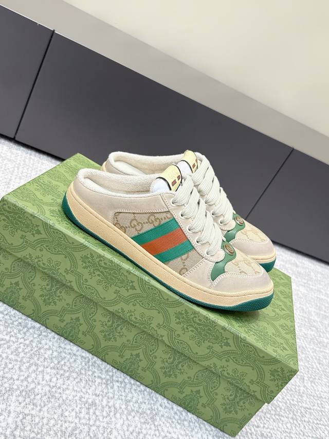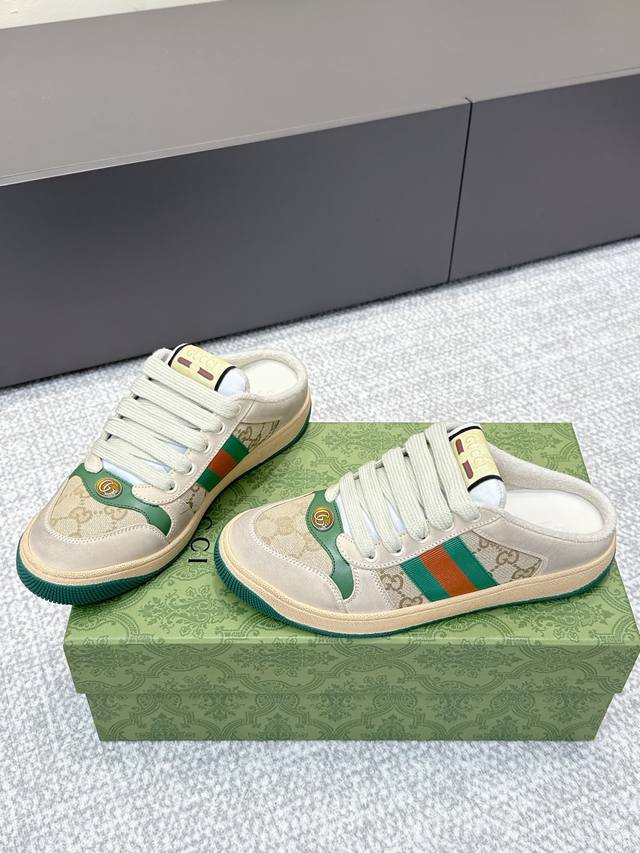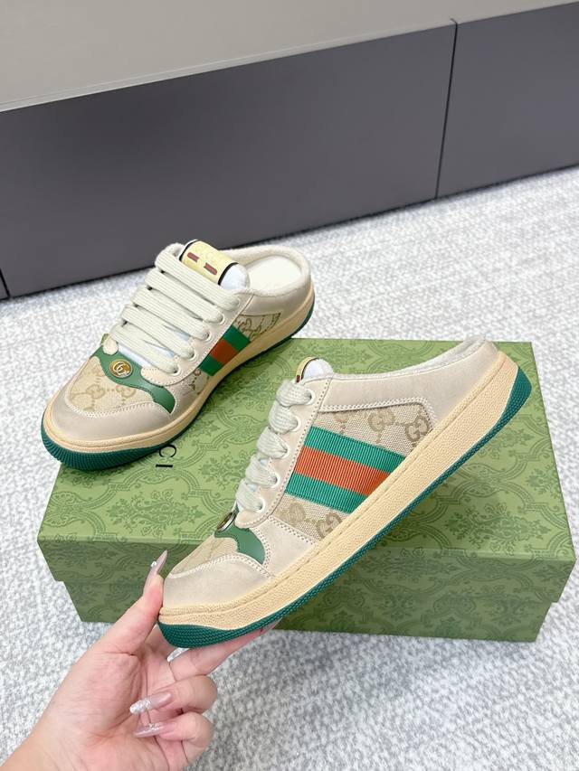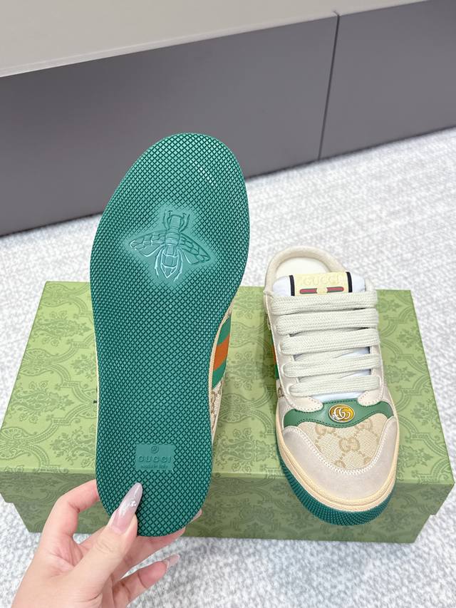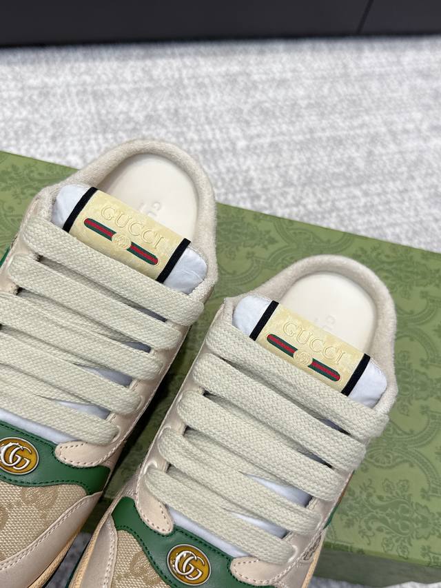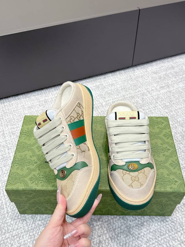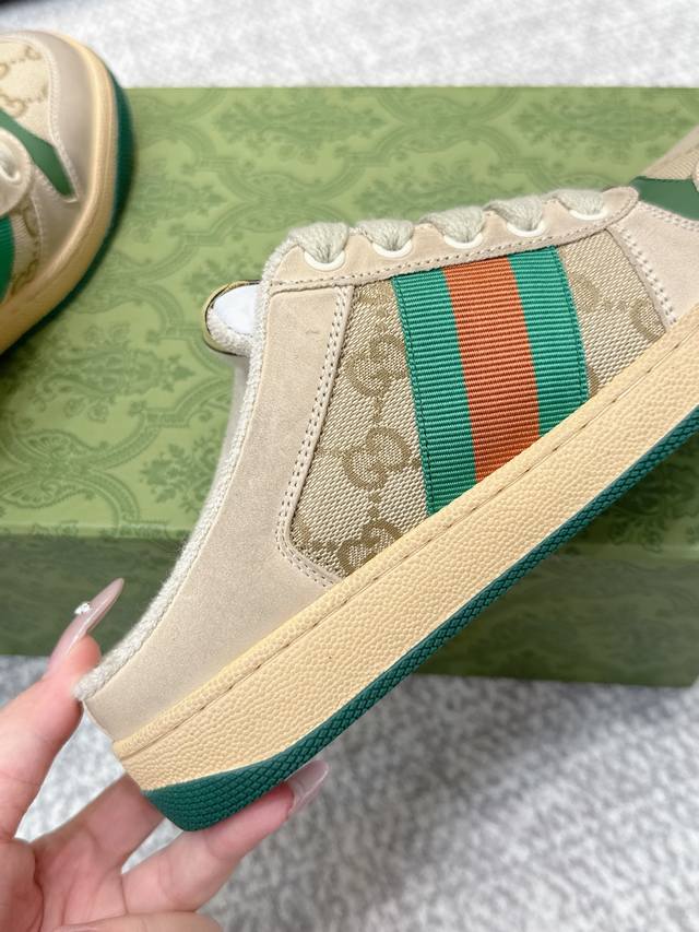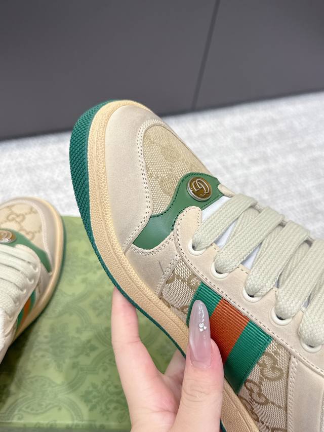 High-quality Gucci 2025Ss classic distressed color-washed sneakers for couples. Classic design, original molded version with cherry crystal pendant; metal double G crystal cylindrical label; original Gucci webbing; distressed leather upper with classic double G fabric, full oil-sealed edges. Upper: Original custom leather. Lining: Original terry cloth lining. Outsole: Original outsole. Sizes: Women's 35-39, 40 available; Men's 39-44, 45 available.