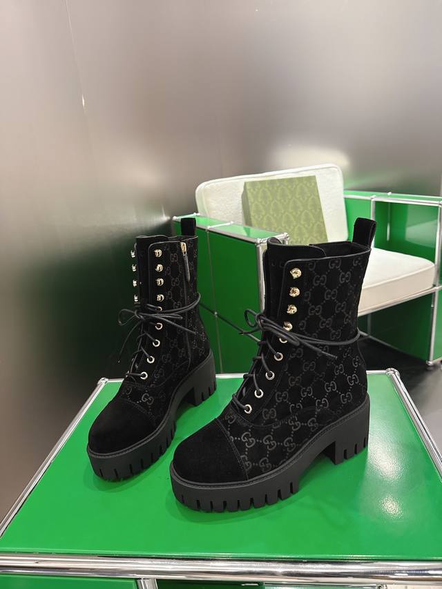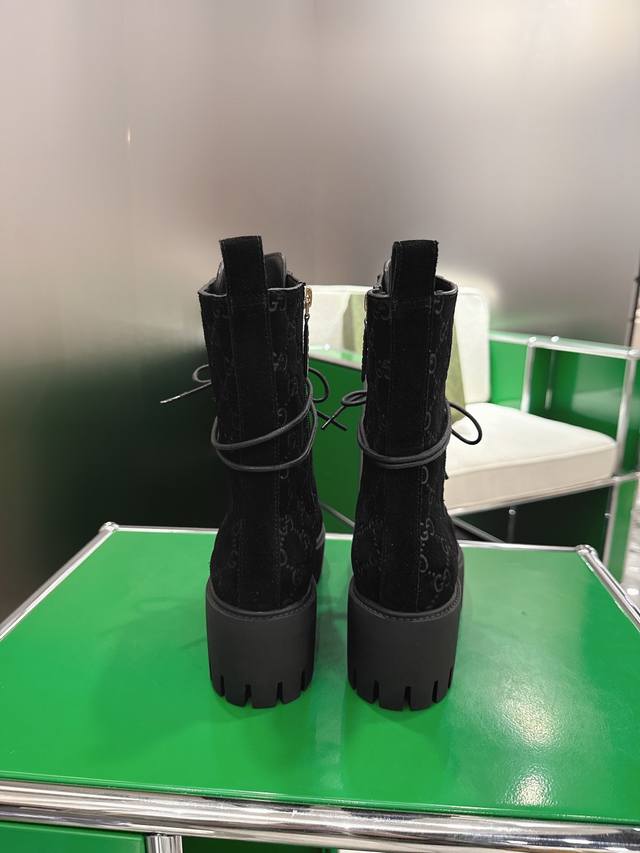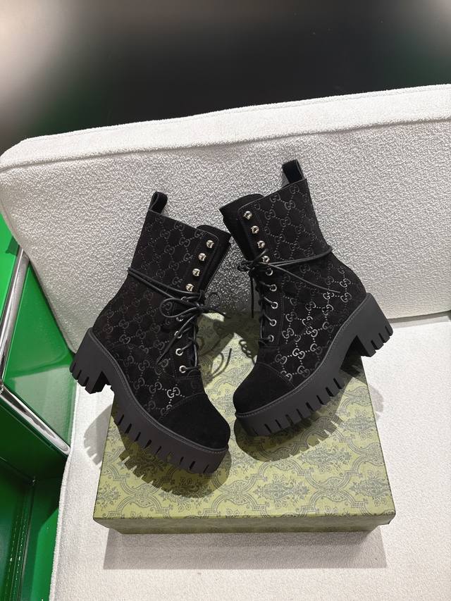 K055 DDD Gucci Women's Gg Lace-up Ankle Boots DDD These lace-up ankle boots are crafted from iconic Gg calfskin leather, showcasing the brand's timeless and elegant aesthetic. The bold silhouette, paired with a rubber grooved sole, provides stable support while giving the overall style a modern and sophisticated feel. DDD Black Gg Calfskin Leather DDD Rubber Grooved Sole DDD Lace-up Fit DDD Height: Forefoot Height: 3.5 cm; Heel Height: 6 cm DDD Sizes: 35-39 40.41 Custom Made DDD