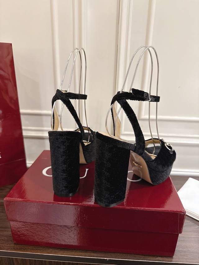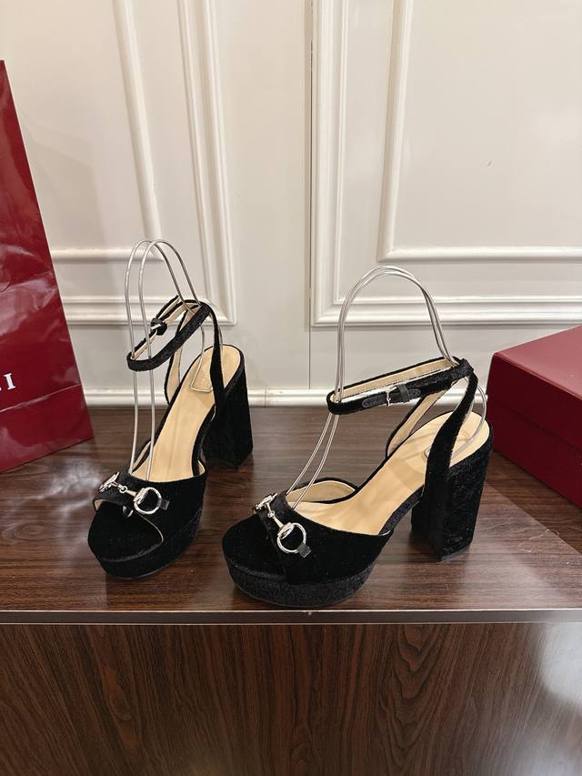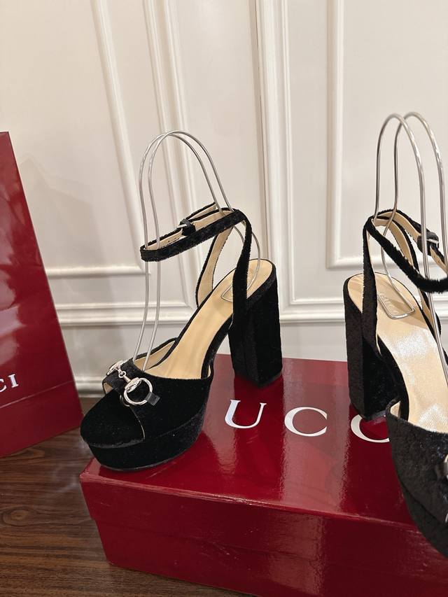 Latest Gucci Classic Horsebit Velvet Platform High-Heeled Sandals. This series presents a new fashion charm, continuing the ultra-high heel design. Upper: Velvet; Insole: Original lambskin; Italian genuine leather outsole; Platform: 2cm; Heel height: 11cm; Sizes: 35-42 (40, 41, 42). Custom orders are non-refundable and non-exchangeable.