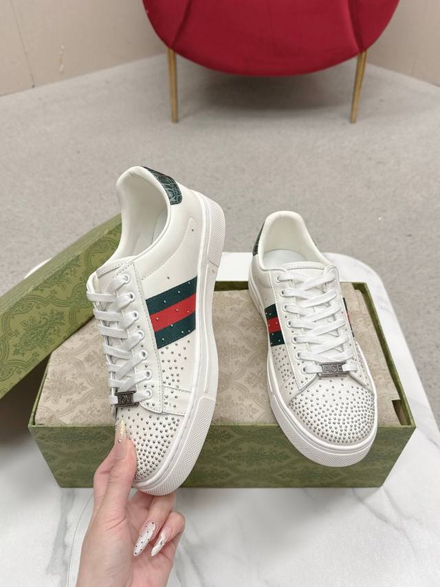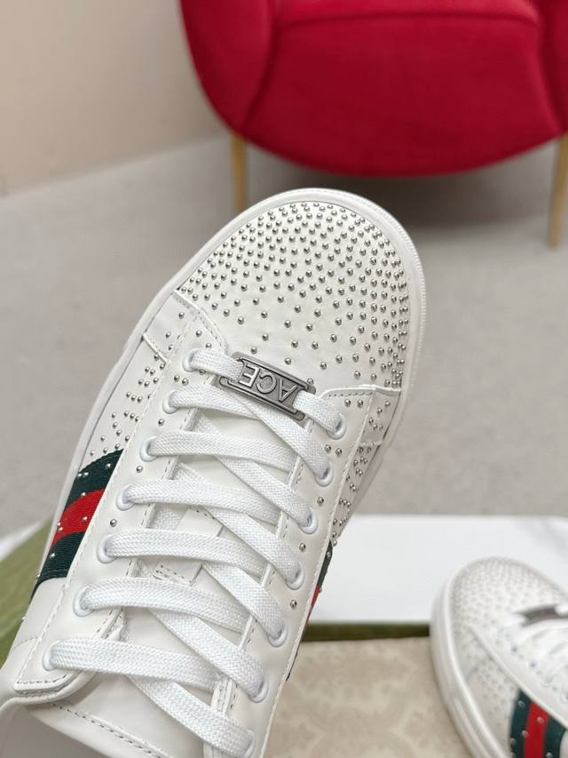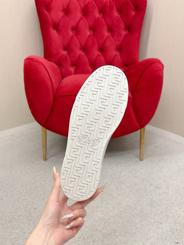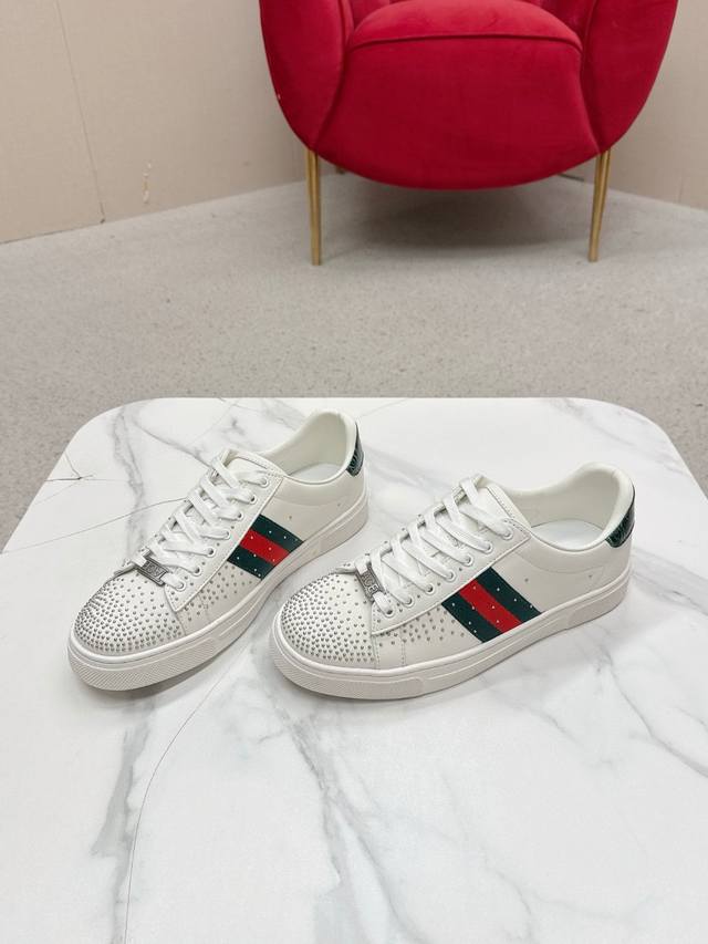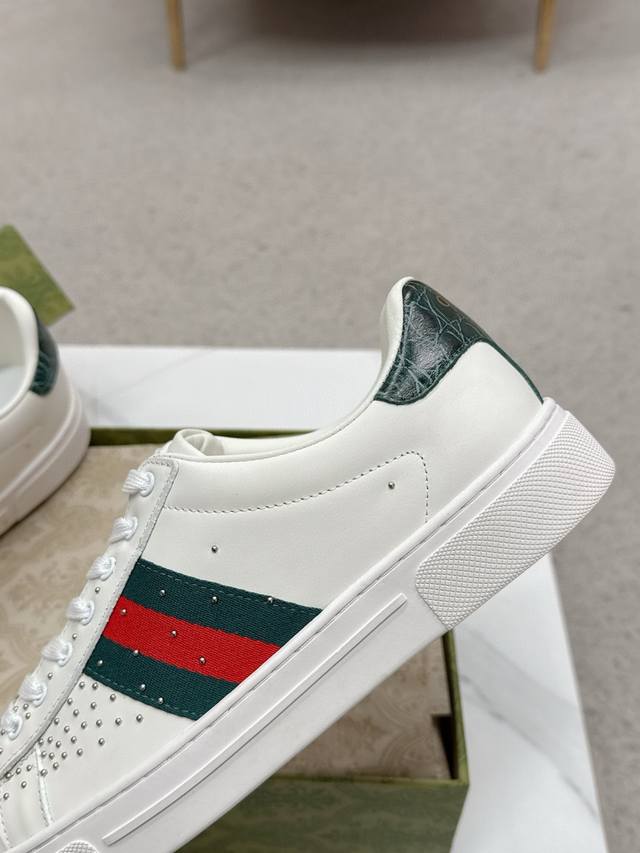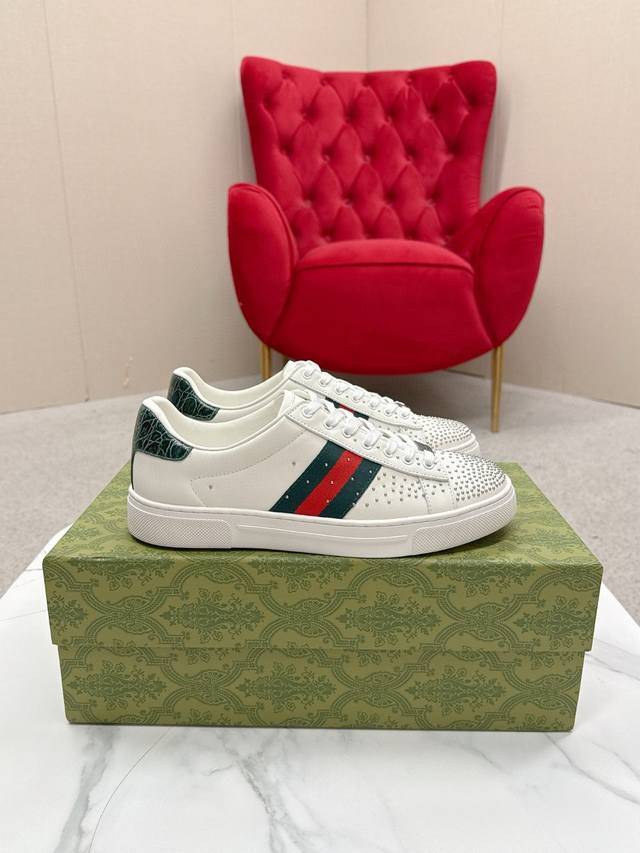 Men's Gucc* Ace Series Webbing Sneakers Ddd Since its inception, the Ace series sneakers have continued the brand's narrative, with meticulous craftsmanship creating signature items. The new series features a distinctive low-top design, paired with chic details, reinterpreting the athletic shoe silhouette. The laces are adorned with an "Ace" metal tag, and the thickened construction refines the shoe's structured shape. Gucc*'s classic red and green striped webbing adds further charm to the design. DDD White leather Ddd Green leather details "Ace" metal tag Ddd Rubber sole Ddd Extra pair of laces Ddd Lacing Ddd Low heel Ddd 3cm heel Ddd This product adheres to the quality standards of the Gucc* Ace series, using a new soft leather construction that may wrinkle. DDD Sizes: Men's 39-44 Men's 45 can be custom-made but is non-refundable DDD