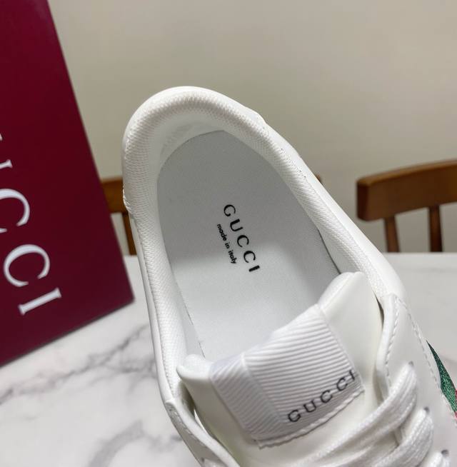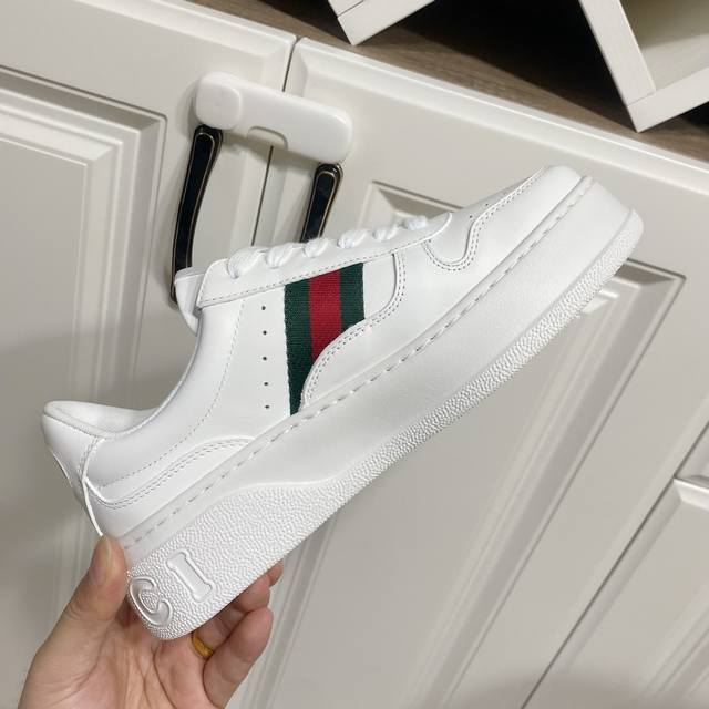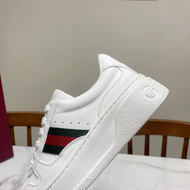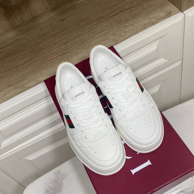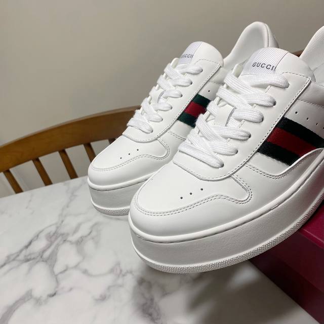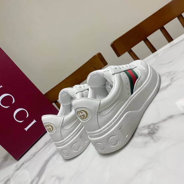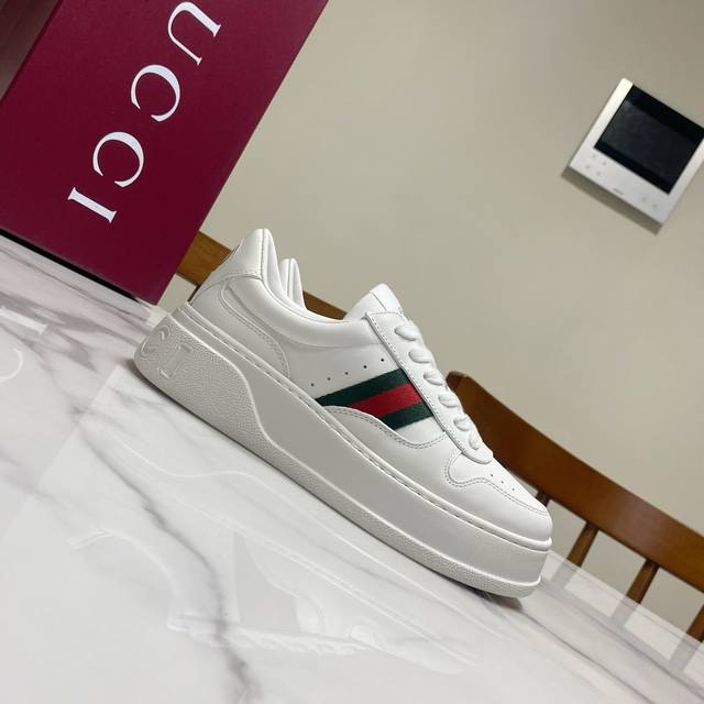 Men's Gucci platform white sneakers, same style worn by Bai Lu, trending on Xiaohongshu. A touch of retro luxury, platform sole for added height, instantly giving you longer legs. Comfortable and versatile. Upper is made of silk cowhide with metallic leather edge closure. Breathable mesh lining. Original foam outsole. Sole thickness: 5cm. Sizes: Women's 35 & 40, Men's 39 & 45. Women's 41, Men's 45 & 46. Custom orders, no returns or exchanges.