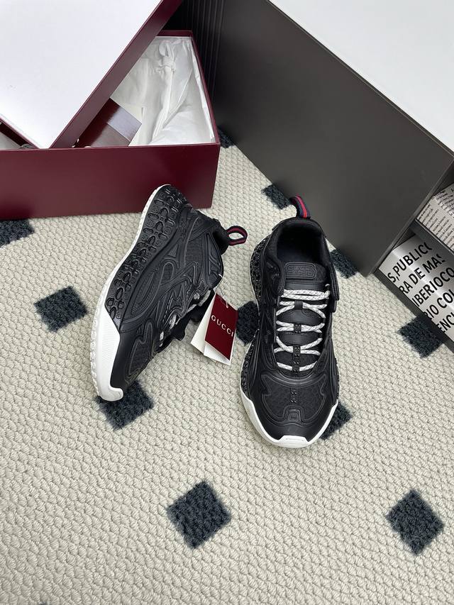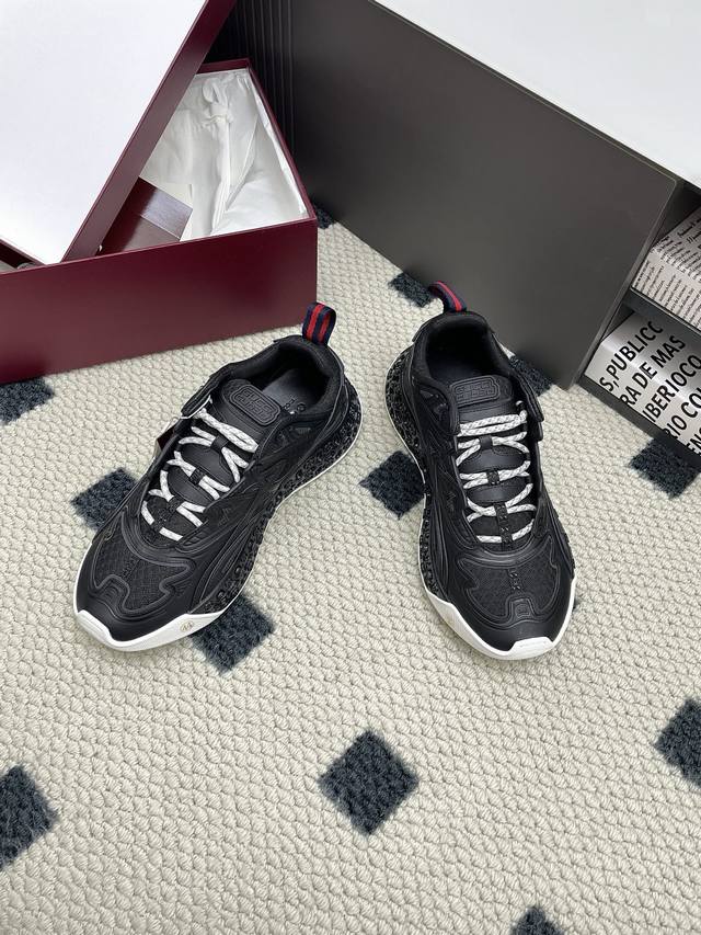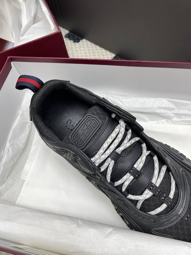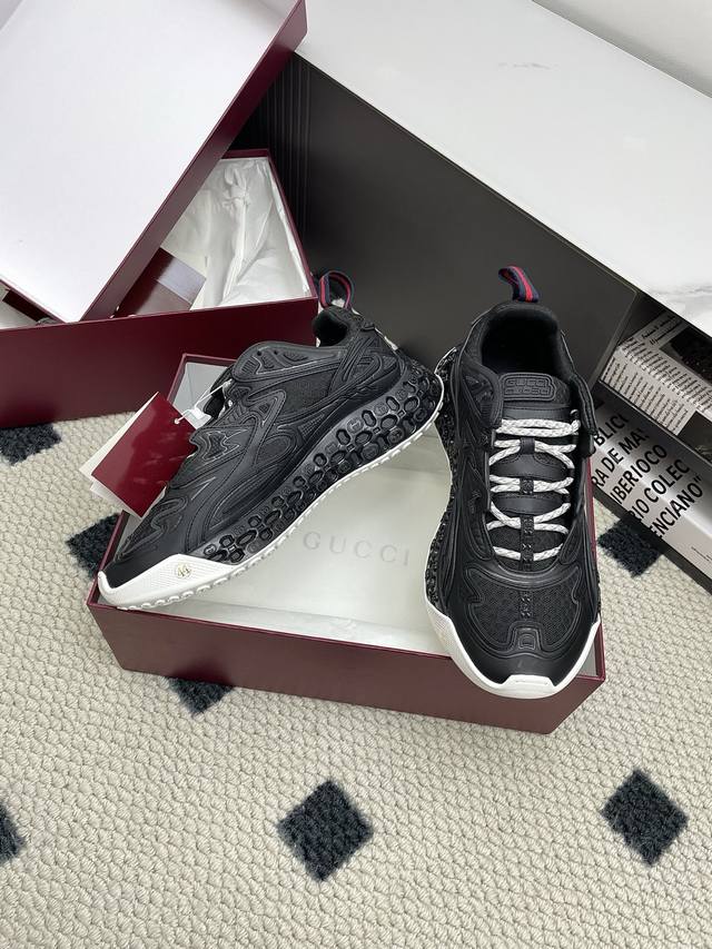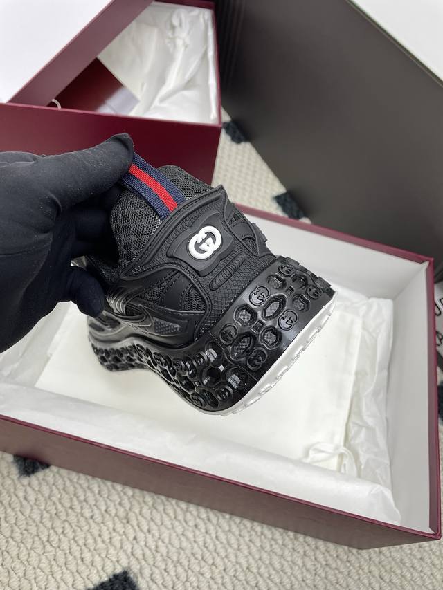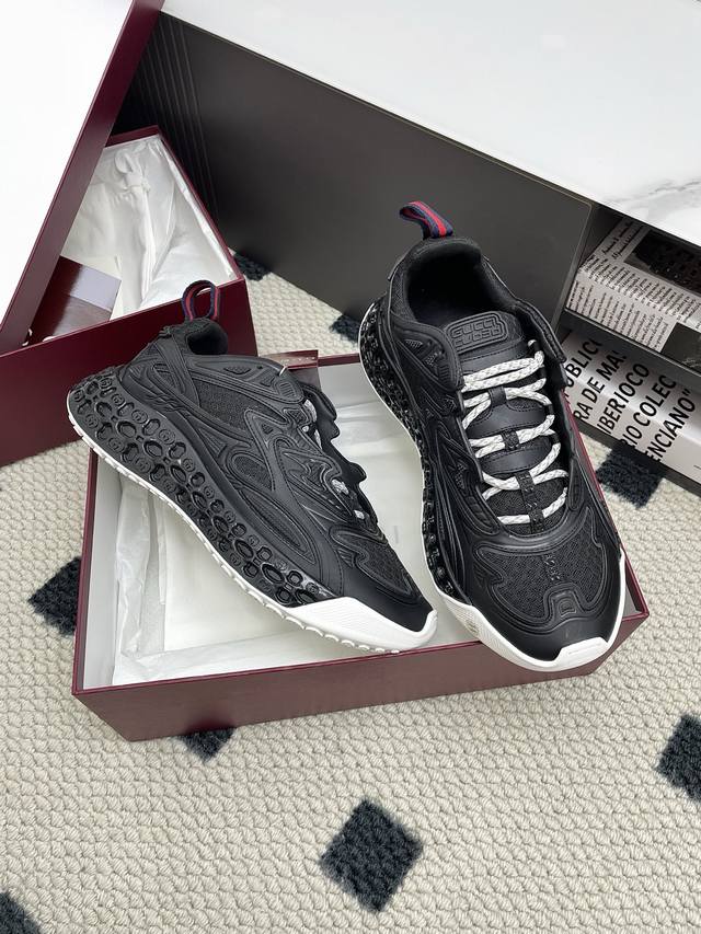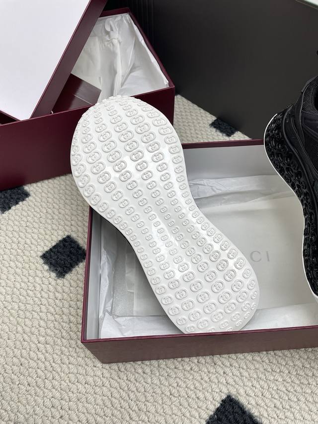 Original purchase, development and production of the 2025 Spring/Summer series presents a wonderful new shoe. This Gucci Cub3D series sneaker cleverly combines innovative materials and exquisite construction. The upper is made of sustainable material Demetra and mesh fabric, and the details are ingeniously presented through high-frequency craftsmanship. The interior of the sole is padded with Eva material, and the exterior is made of Tpu. Finally, the 3D interlocking double G pattern adds a finishing touch to the style, adding style