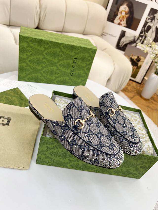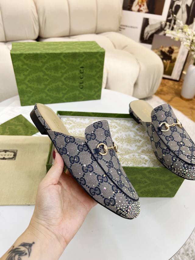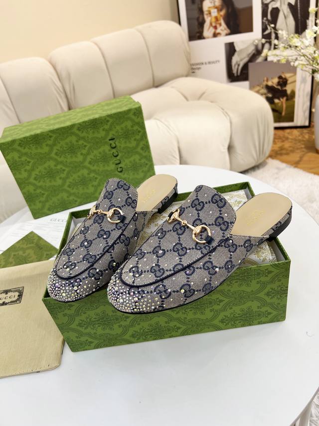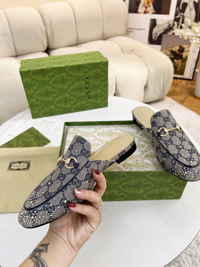 Original quality Gucci Summer latest limited edition single shoes, top quality release, purchased authentic product, developed with original special hot-fix rhinestone process, classic double G monogram upper, sheepskin lining, Italian original material and craftsmanship consistent with the original. Genuine leather outsole. Sizes : 35-42, 40, 41, 42 customizable.