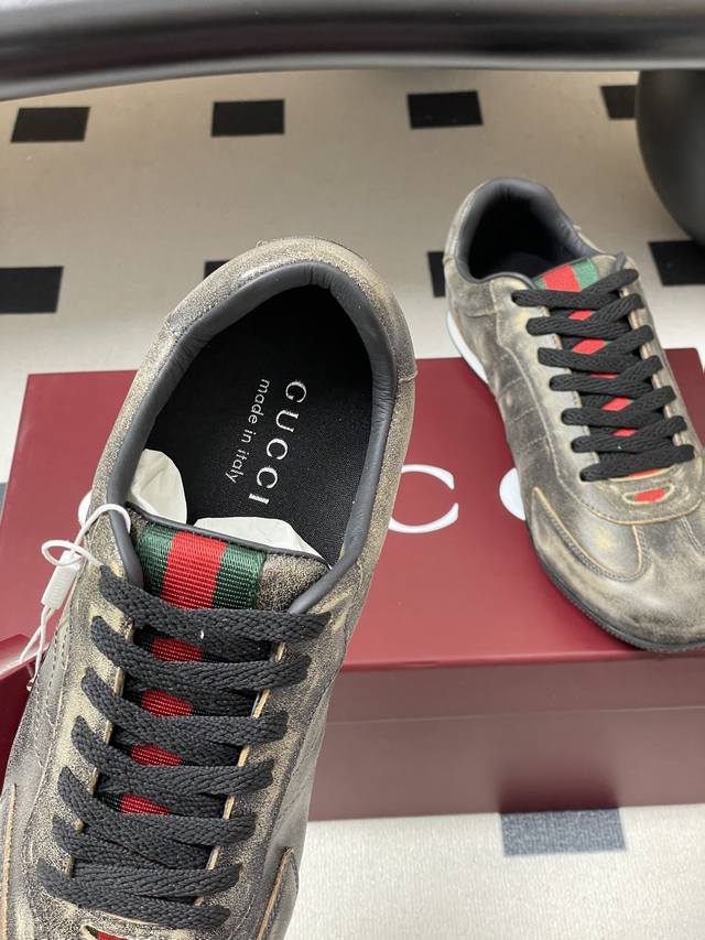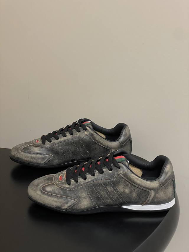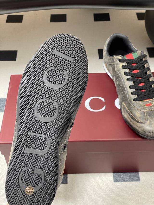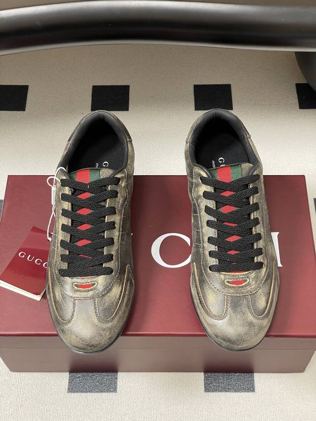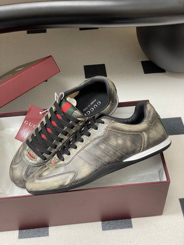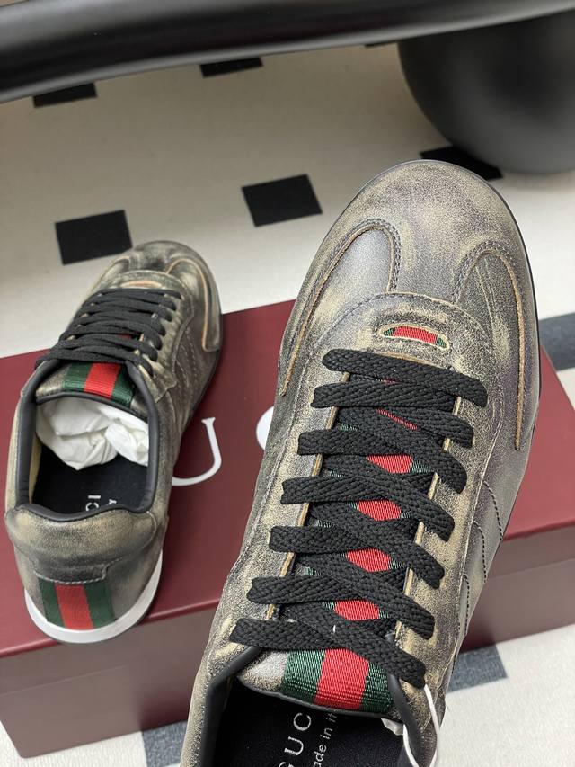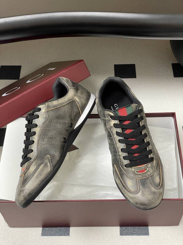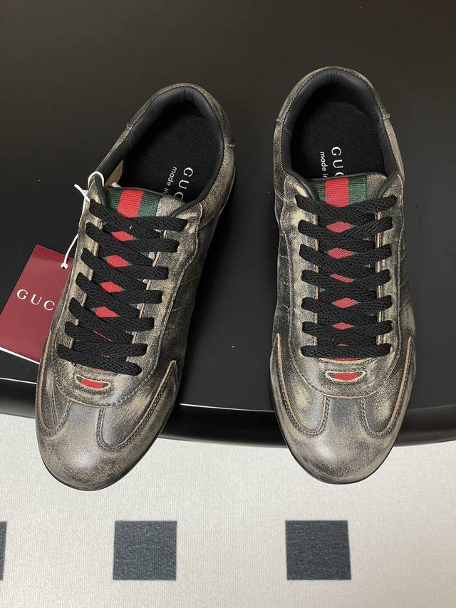 Top quality with high-end airplane box. Gucci Shift series couple's sneakers, lace-up casual German training shoes, 2025 early autumn new style. The Gucci Shift series is newly launched, with a lightweight design that reinterprets sporty style. The clean silhouette adds to the natural feel, showcasing exquisite texture with every movement. The webbing details are like a continuous ribbon running through the entire design, while the side stitching details add a finishing touch. Upper: Washed cowhide, custom suede. Insole: Sheepskin. Outsole: Two-tone TPU outsole. Sizes: Women's 35-39, 40, 41 (made-to-order, no returns/exchanges); Men's 39-44, 38, 45 (made-to-order, no returns/exchanges).