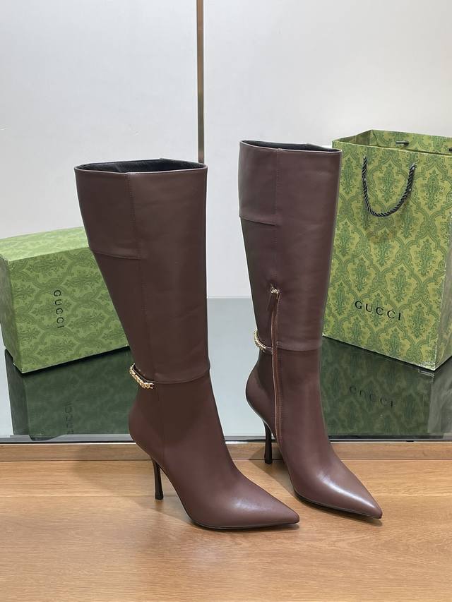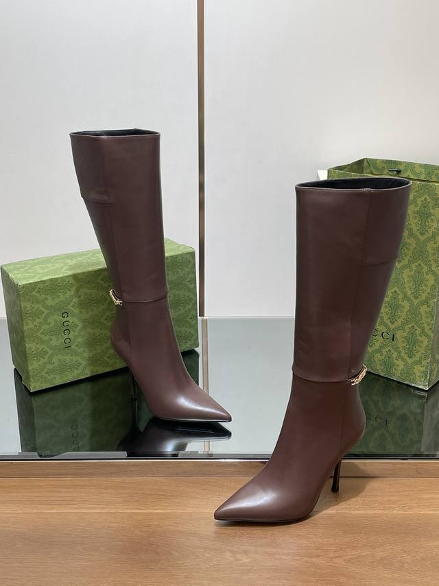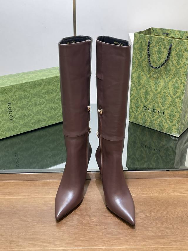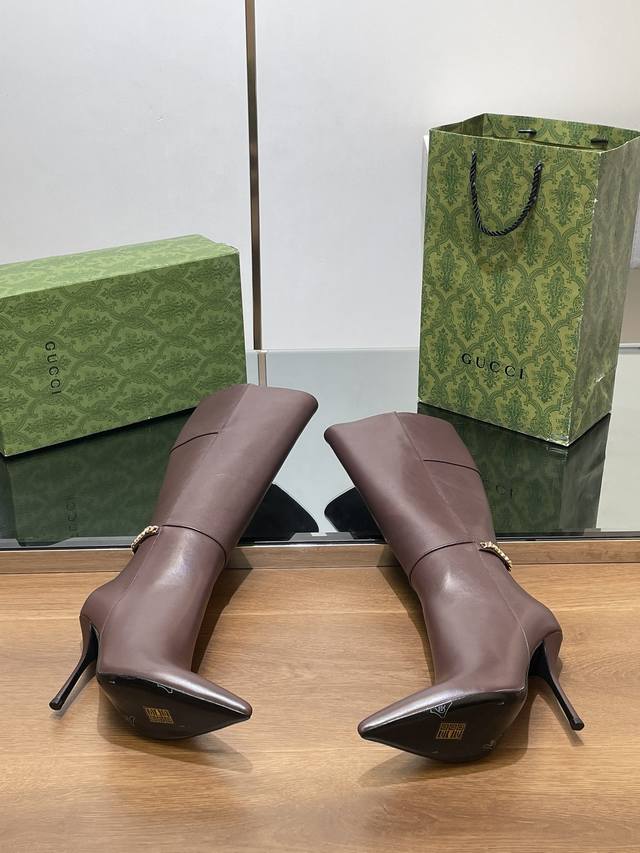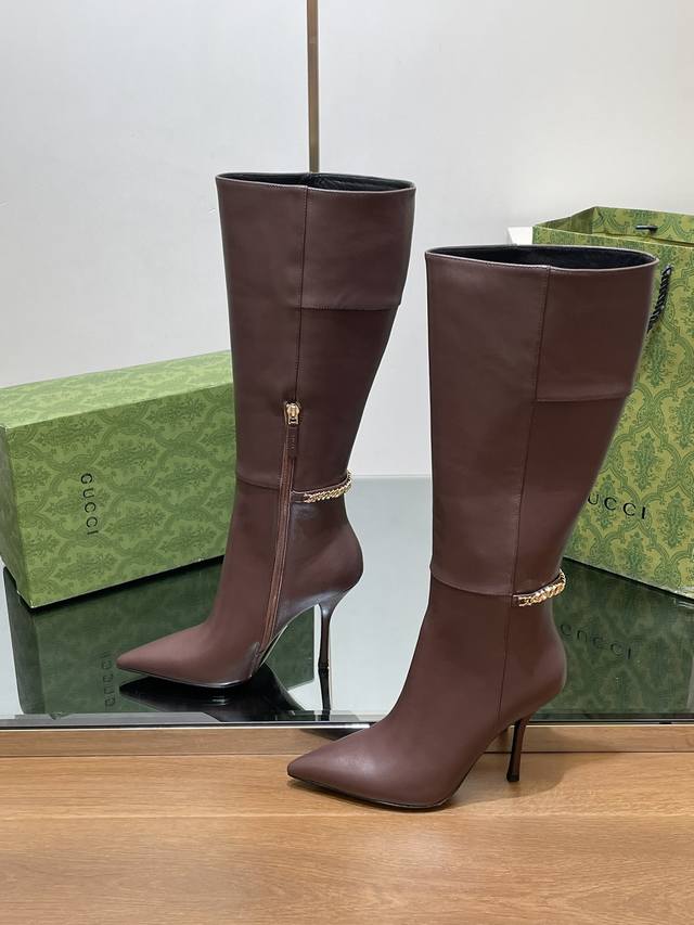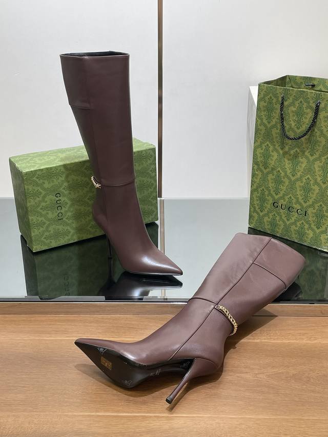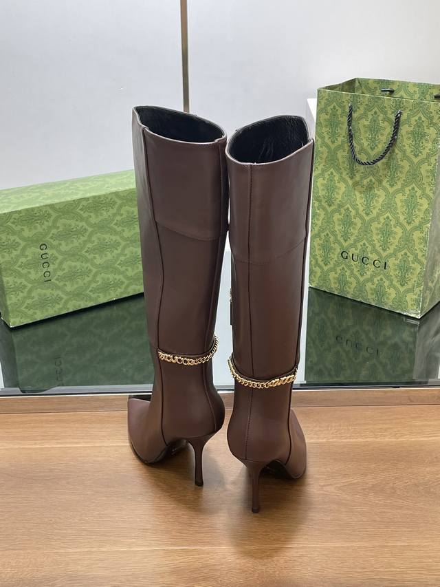 Winter Gucci New Gucci Logo Chain High-Heeled Women's Boots Pointed Toe Knee-High Boots, Factory Price, Top-Tier Version, Welcome to Compare. 1:1 Original Replica. Note that many common versions on the market have incorrect linings. Please recognize our authentic products. Upper: Full-grain high-grade calfskin. Lining/Insole: Full-grain high-grade lambskin. Sole: Italian top-grade genuine leather. Heel Height: 10.5cm and 4.5cm. Sizes: 35-42, 41, 40, 42. Custom orders are non-refundable. Packaging: Original full set of green packaging. Gucci's creative director launches a new pointed-toe chain shoe and boot collection, a commitment to gender equality and advocating for women's empowerment. The pointed toe with chic chain details showcases beauty, strength, and a spirit of freedom.
