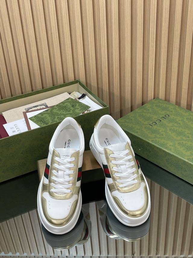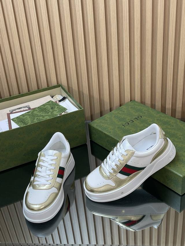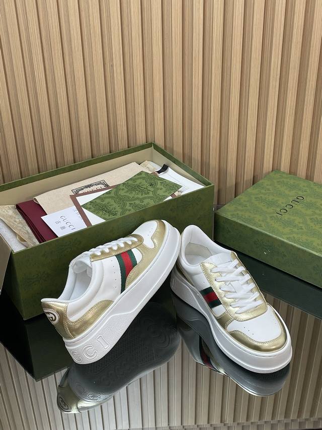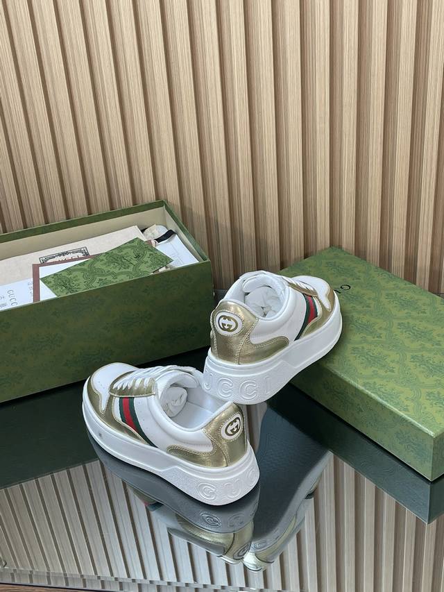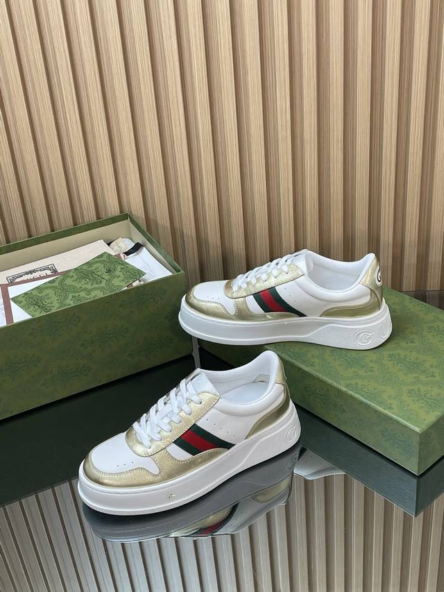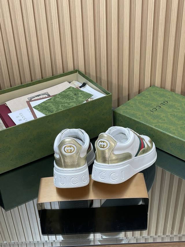 This 2025 Autumn/Winter series sports shoe features a platform structure, cleverly utilizing a corridor design, color scheme, and material elements to showcase a retro style. This shoe uses leather paired with red and green webbing details, and the rubber platform design adds to its exquisite charm. Yyds