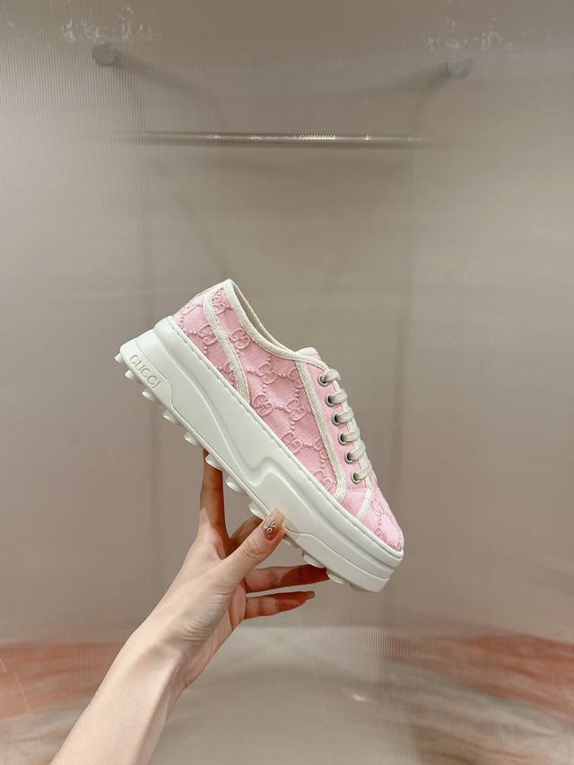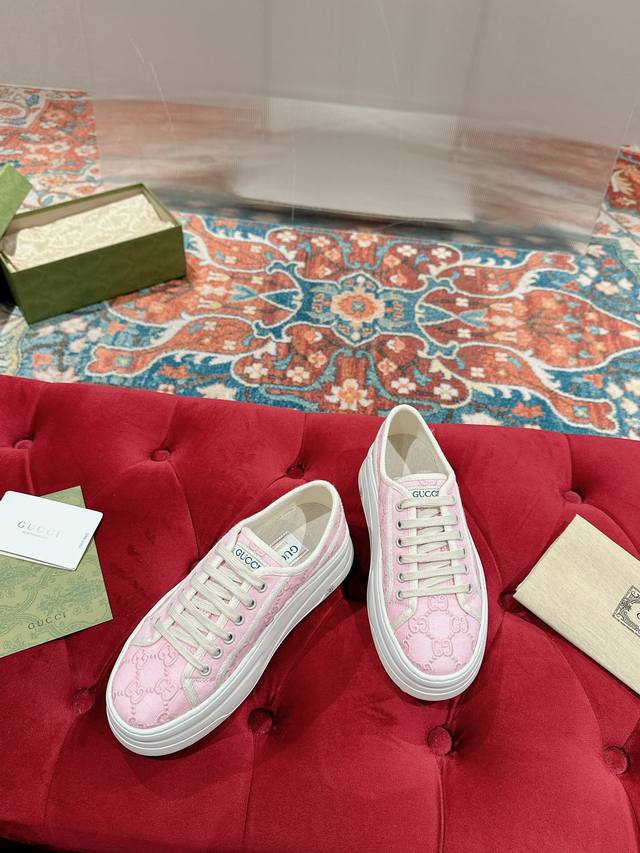 Women's Top-Tier Version Gucci I's Latest Hot-Selling Sneakers of the Year. This eye-catching item draws inspiration from the world of tennis. These sneakers are made from classic Gg canvas in tonal beige and ebony colors, with a thick sole and contrasting fabric piping for a modern aesthetic. Upper: Classic Gg canvas; Lining: Original custom-made grass green canvas + terry latex insole; Outsole: 1:1 original mold, interlocking double G rubber outsole; Sizes: Women's 35-40, Women's 40. Custom orders are non-refundable and non-exchangeable.