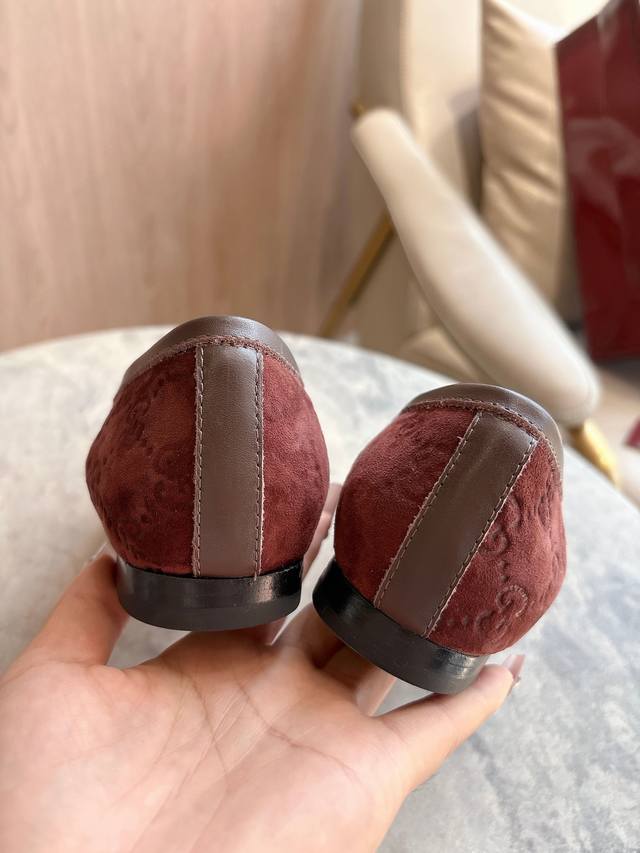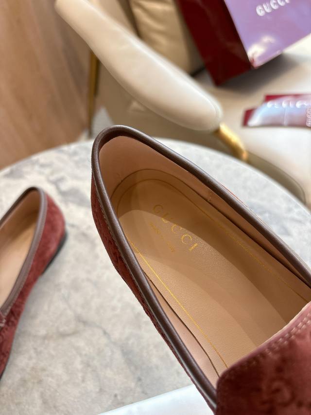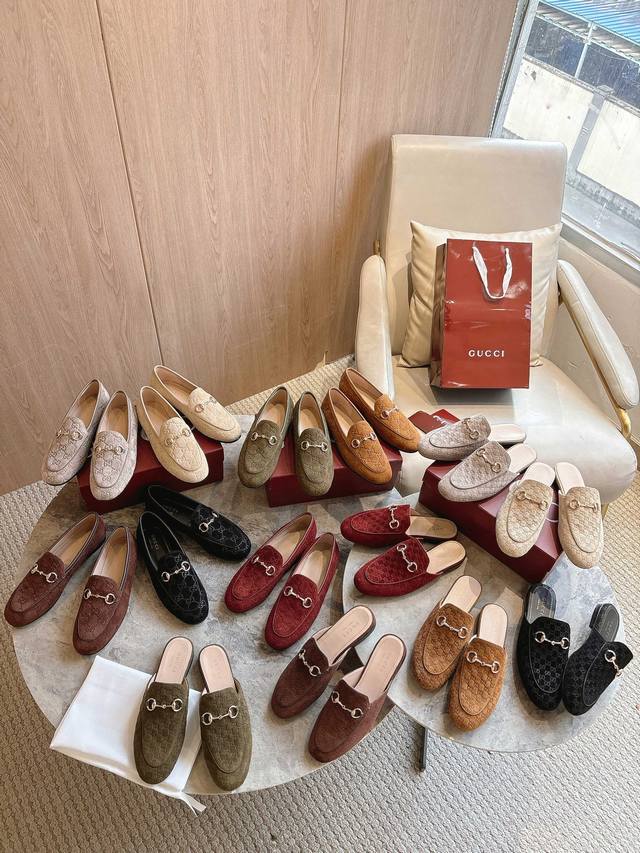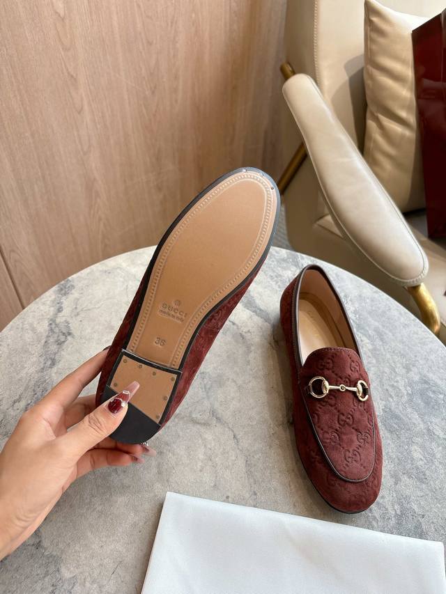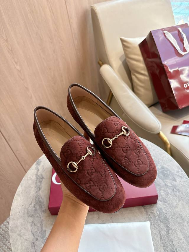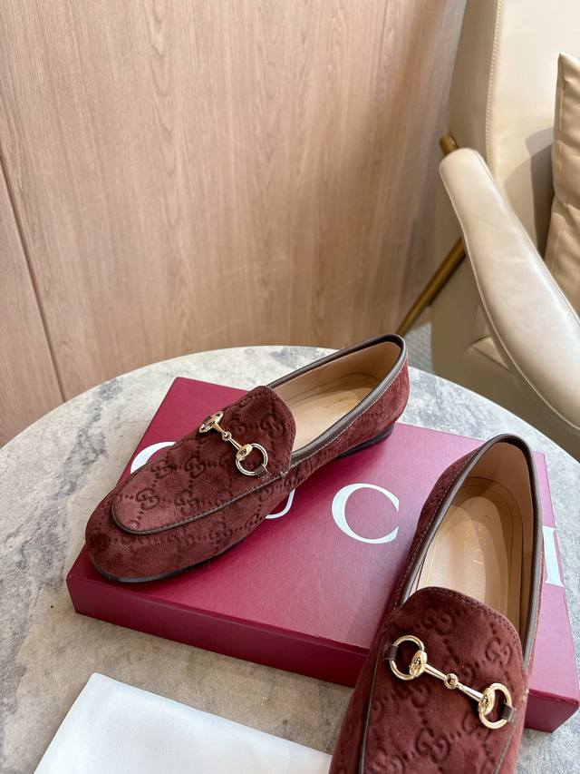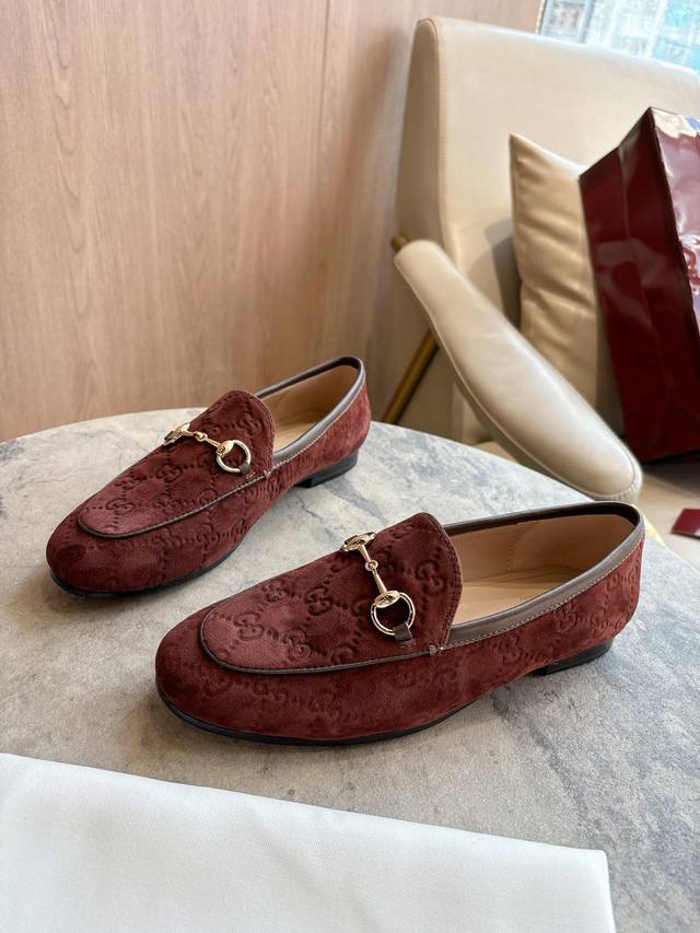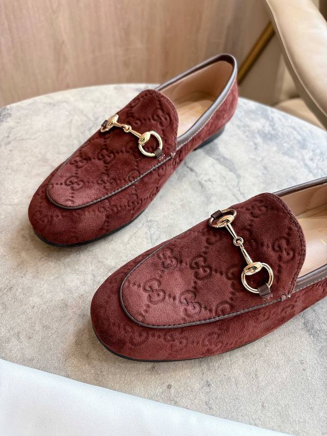 1819-10* Coffee 35-42 A true icon of Gucci's design heritage, the Jordaan Horsebit loafer embodies classic elegance. Crafted in smooth suede with the House's signature monogram pattern, this timeless shoe boasts a soft, refined silhouette for everyday elegance.