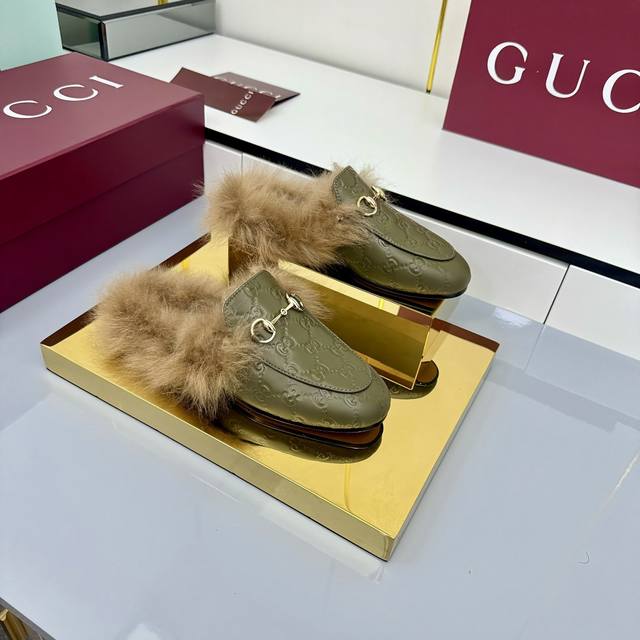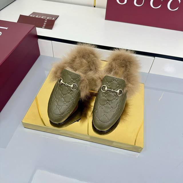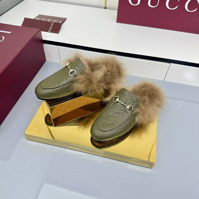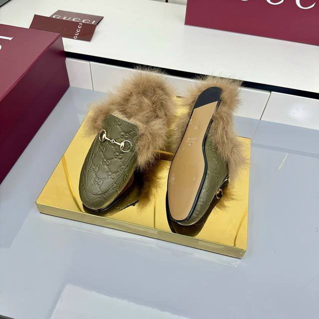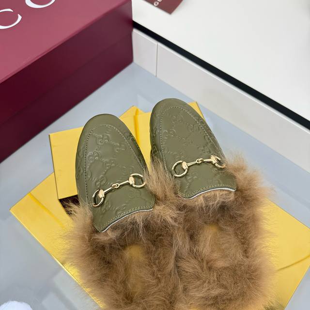 2025 Fall/Winter Collection: The iconic double-G motif continues to shine in Gucci's new collection. The new collection features meticulously crafted horsebit hardware, showcasing the brand's equestrian heritage. This women's mule is crafted from Tuscan wool and adorned with light gold hardware. [Dark Brown Merino Wool] [Light Gold Hardware] [Horsebit] [Leather Sole] [Flat Size 35-42]