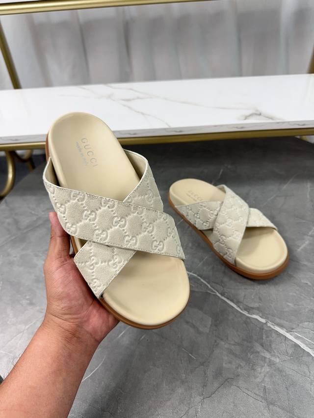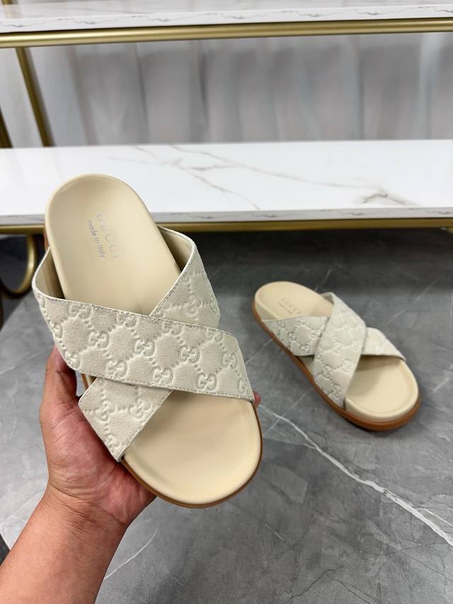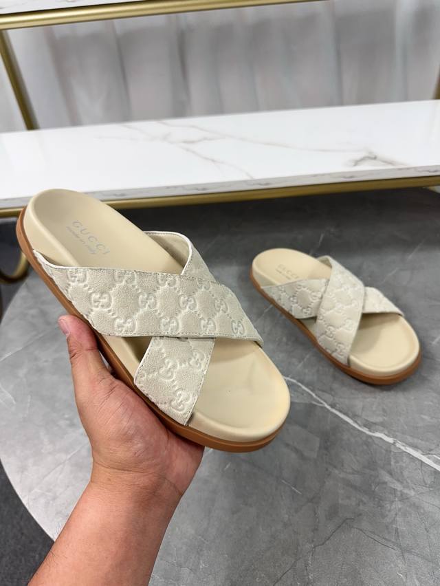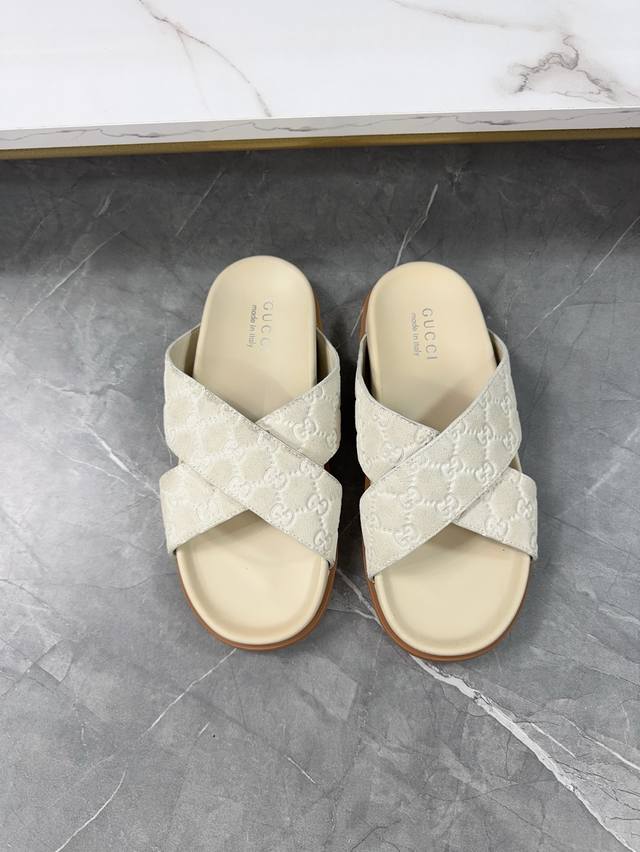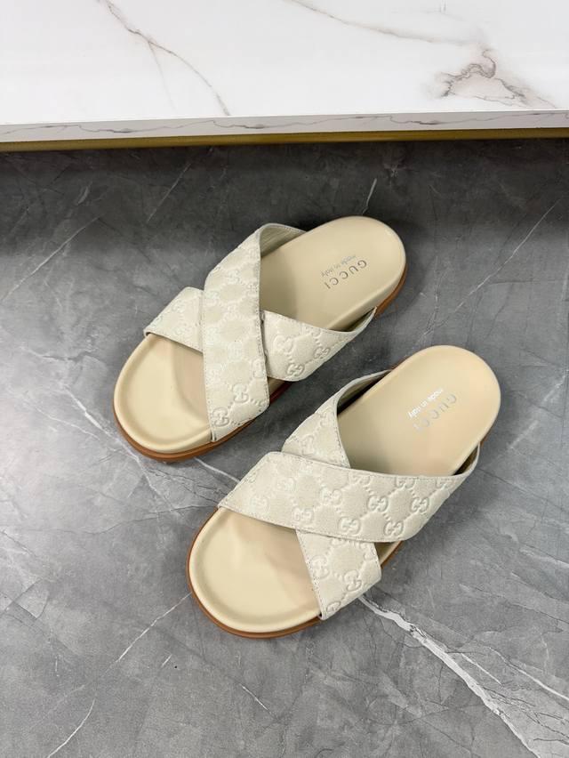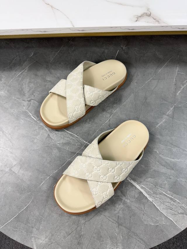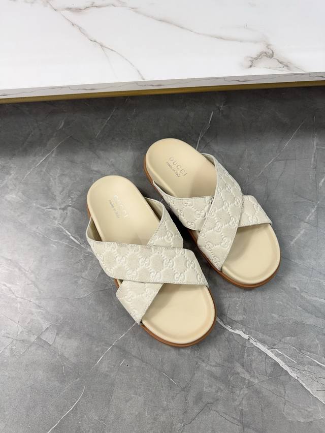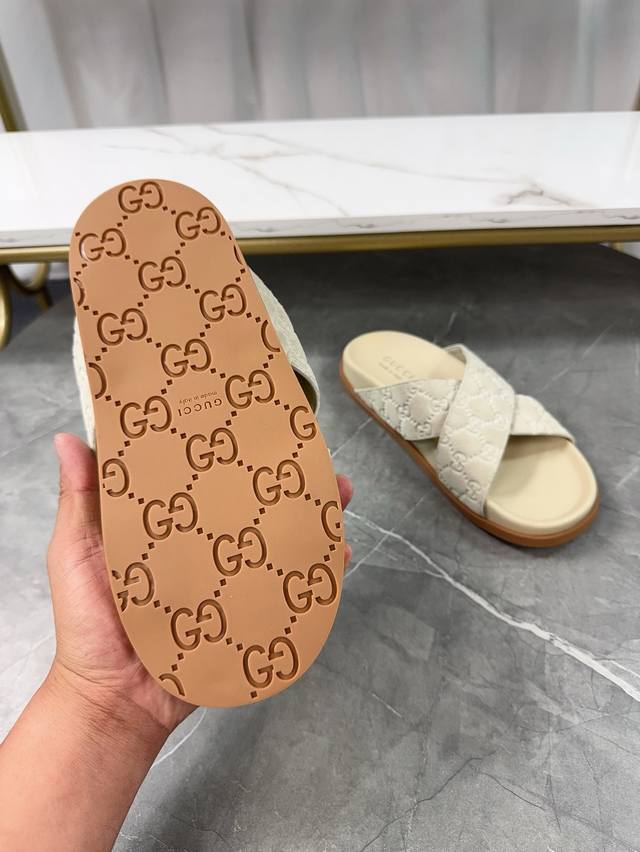 2025 Gucci Summer New Double G Monogram One-Shot Sandals, Beach Shoes. Original purchase and re-production. A dark horse item from Gucci's summer new collection, worn and showcased by fashion bloggers worldwide, a hit on social media platforms globally. A must-have for fashionistas. High-quality molds and craftsmanship, meticulously replicating every detail. Comes with exquisite boutique packaging. Material: Original imported double G monogram leather. Lining: Original imported leather. Sole: Original molded TPU outsole.