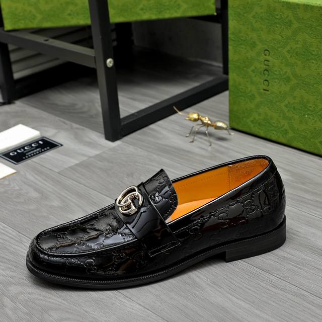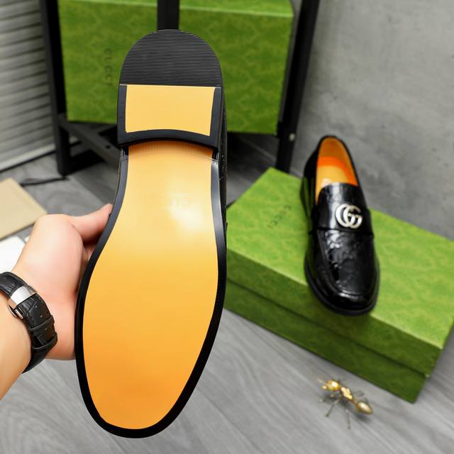 Factory direct price men's clothing, shoes, sportswear, original product. Trademark: Gucci business slip-on leather shoes. Sizes: 38-45. Material: Selected high-quality patent leather embossed upper, leather lining, rubber outsole.