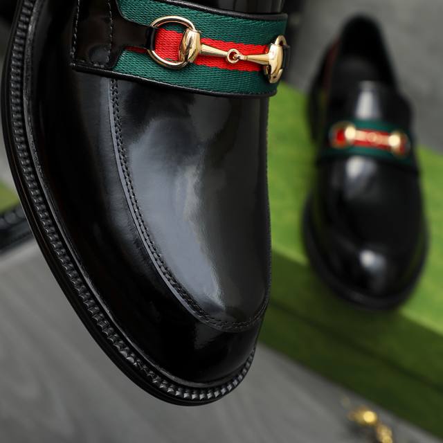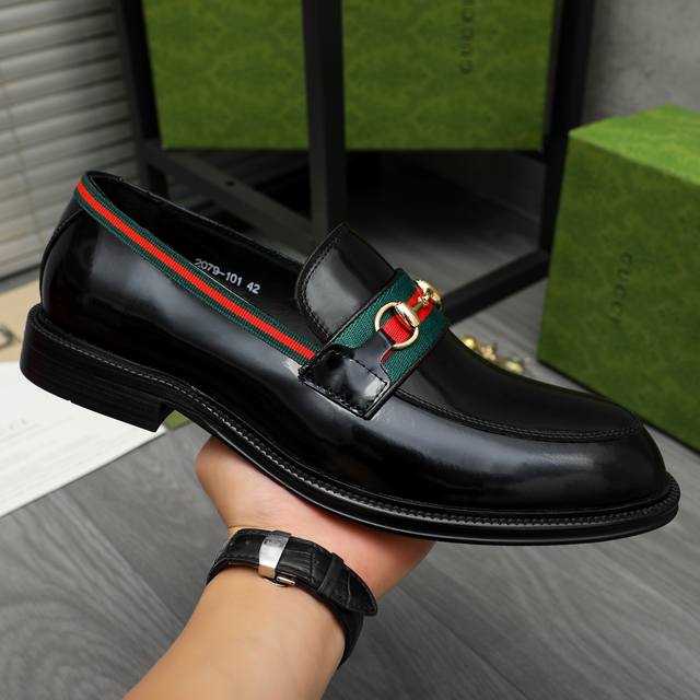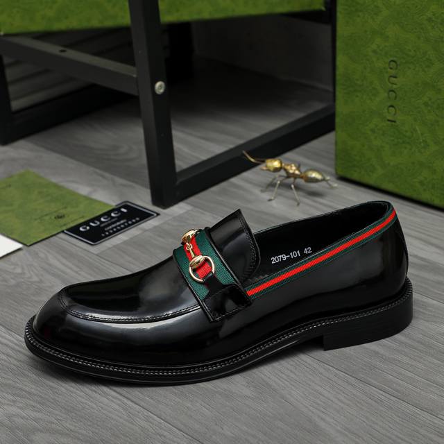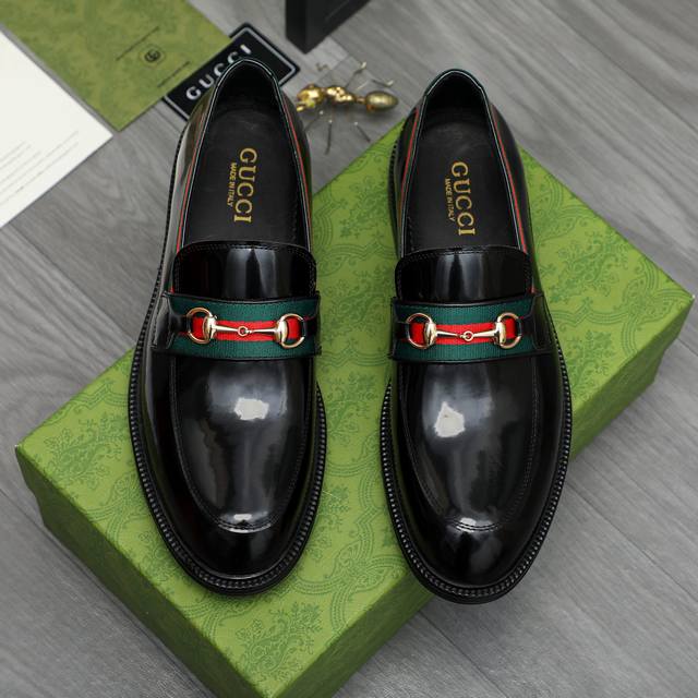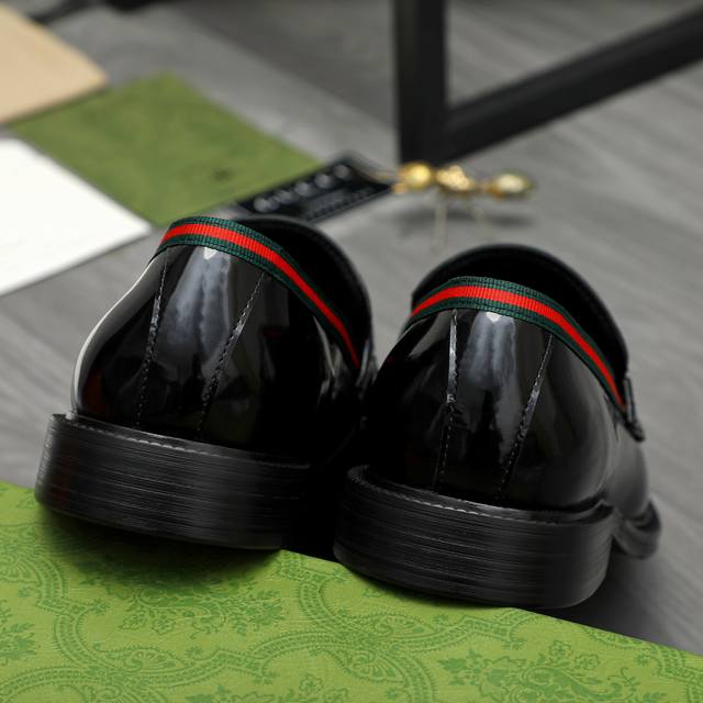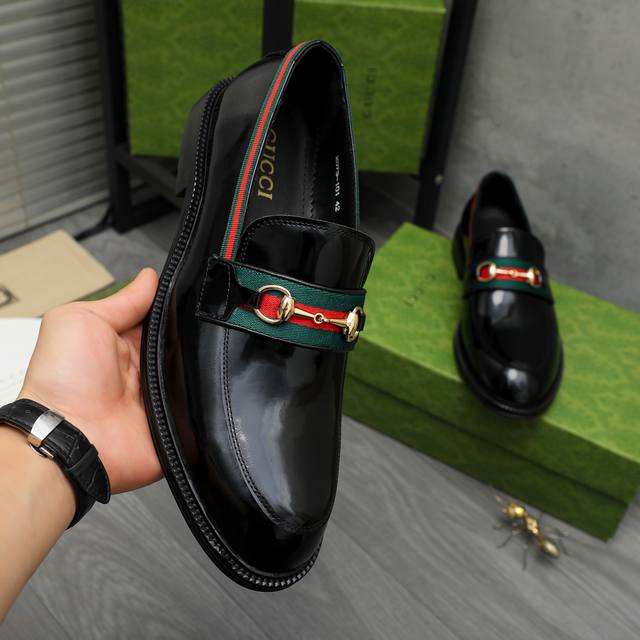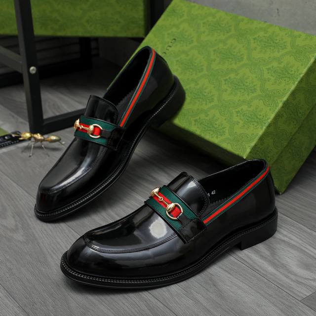 Factory direct price product trademark: Gucci business slip-on leather shoes. True to size: 39-45. Size 45 is custom-made and non-refundable. Product materials: Selected patent leather upper, leather lining, original rubber outsole.
