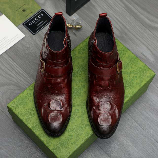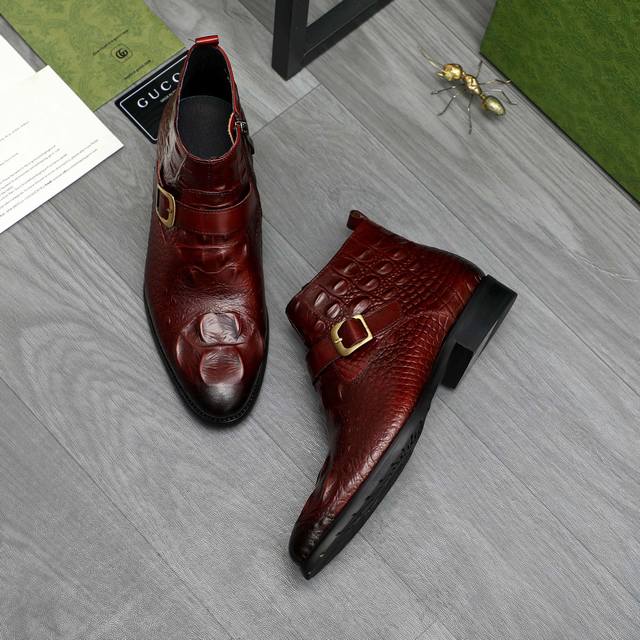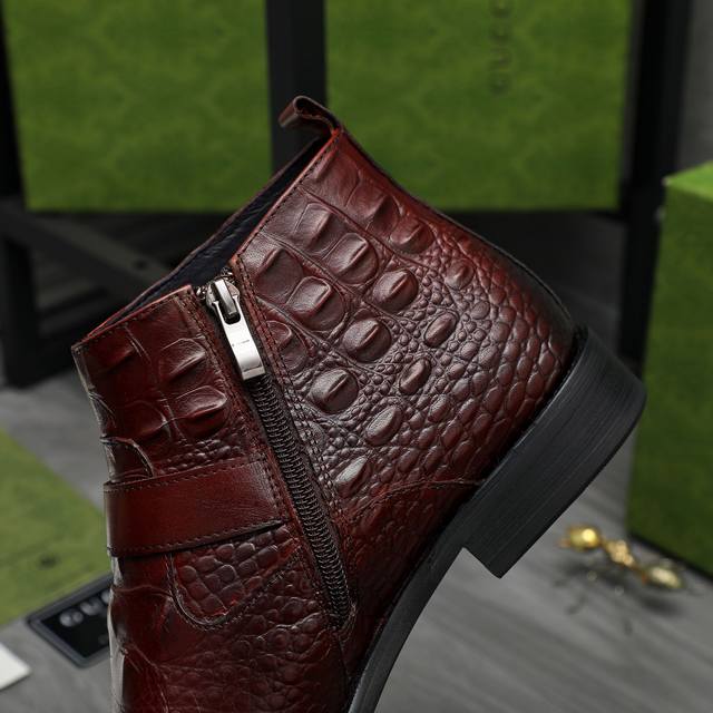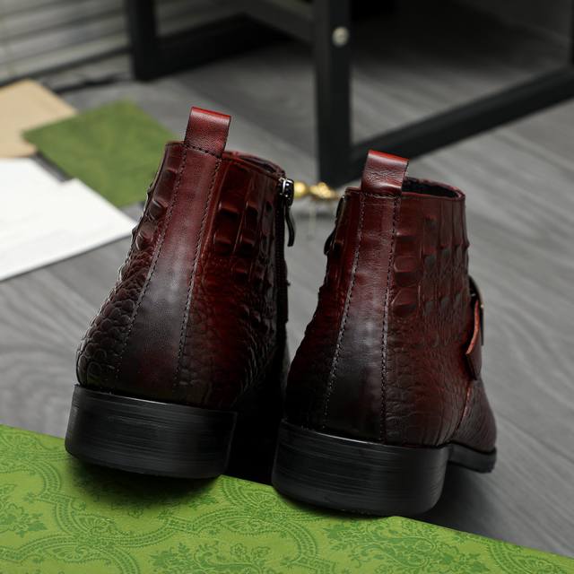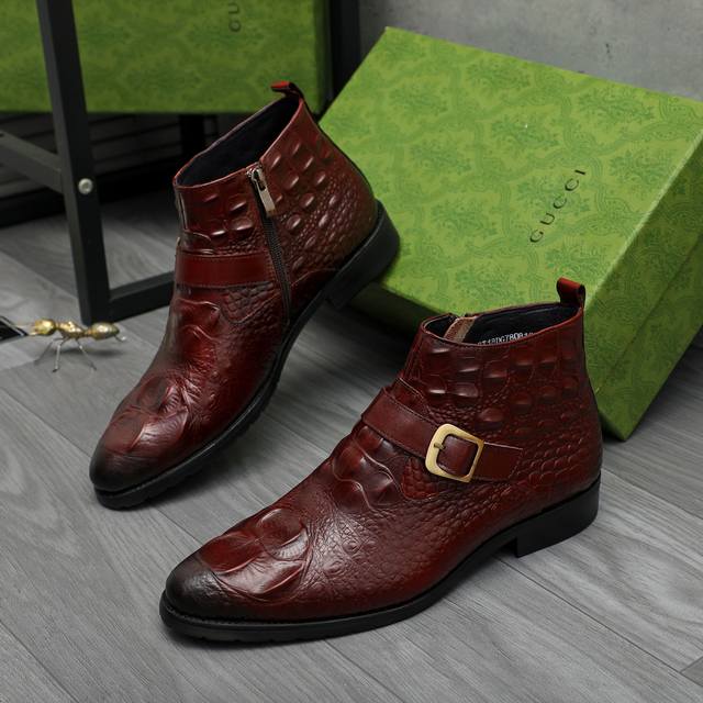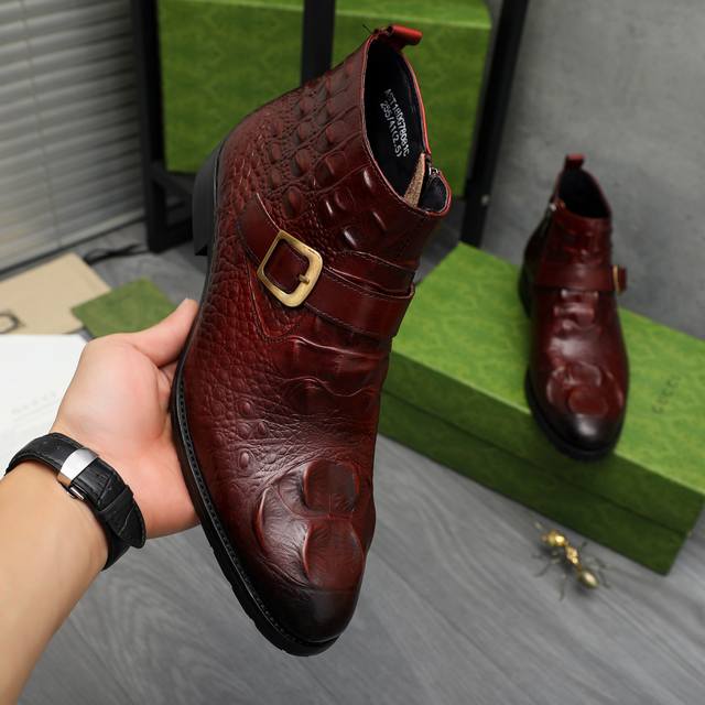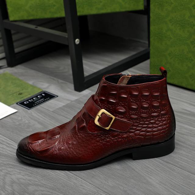 Factory direct price product trademark: Gucci high-top business leather shoes. True to size: 37-46. Sizes 37 and 46 are custom-made and non-refundable. Materials: Selected crocodile-patterned cowhide upper, pigskin lining, rubber outsole.