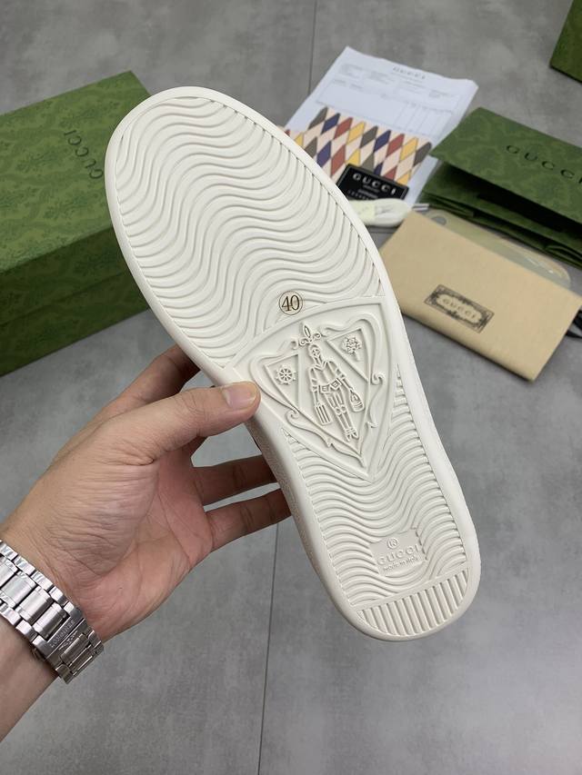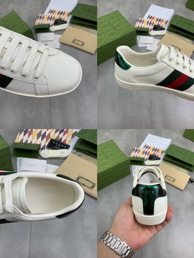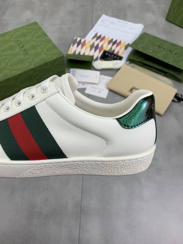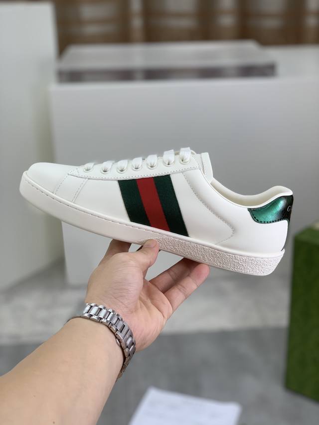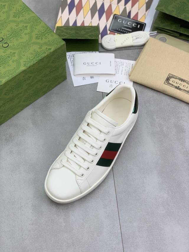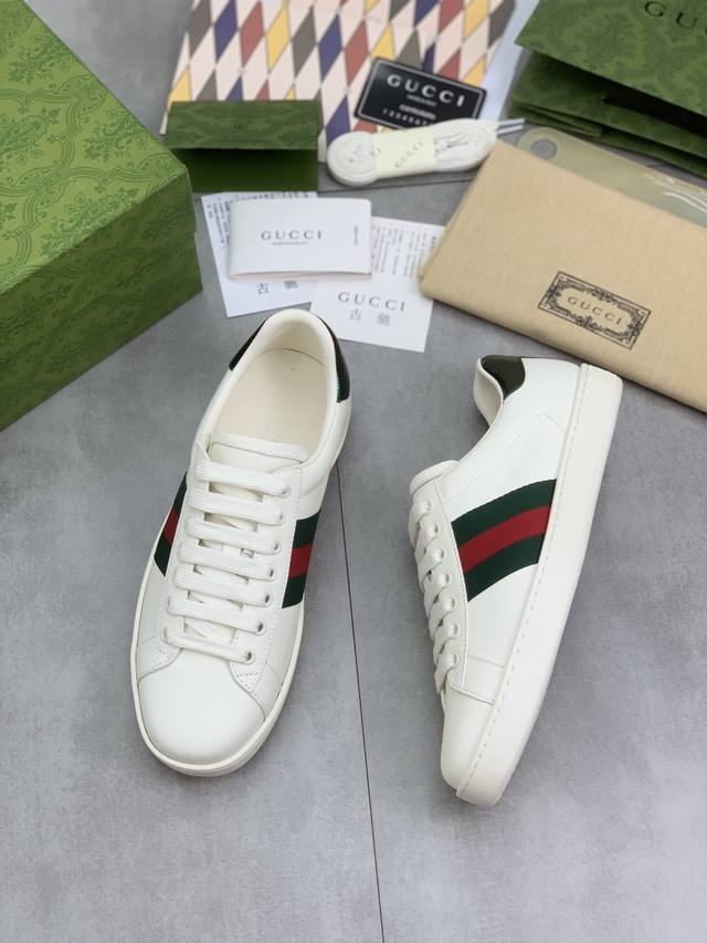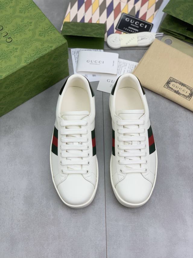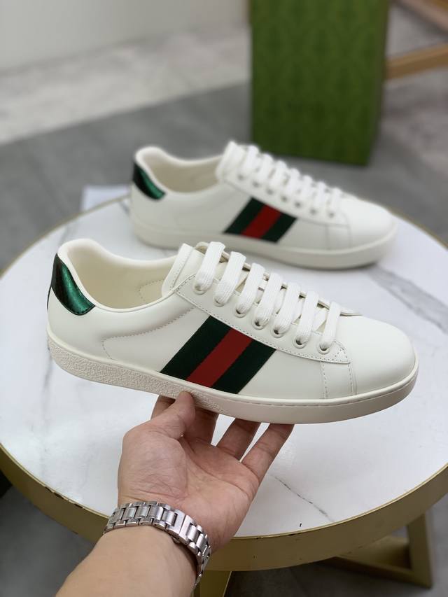 Factory direct price, top-tier version Gucci Ace Sneakers for couples. These Gucci Ace Sneakers have once again revolutionized the traditional white sneaker design. Many celebrities have worn them, echoing the brand's classic color. Material: Imported original selected silk calfskin. The quality is top-notch; original stitching and outsole. Size: Women's: 35-40; Men's: 38-44. Packaging: Top-tier original packaging.