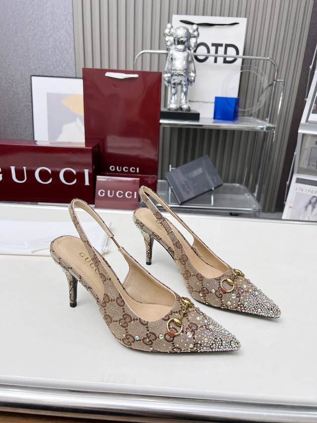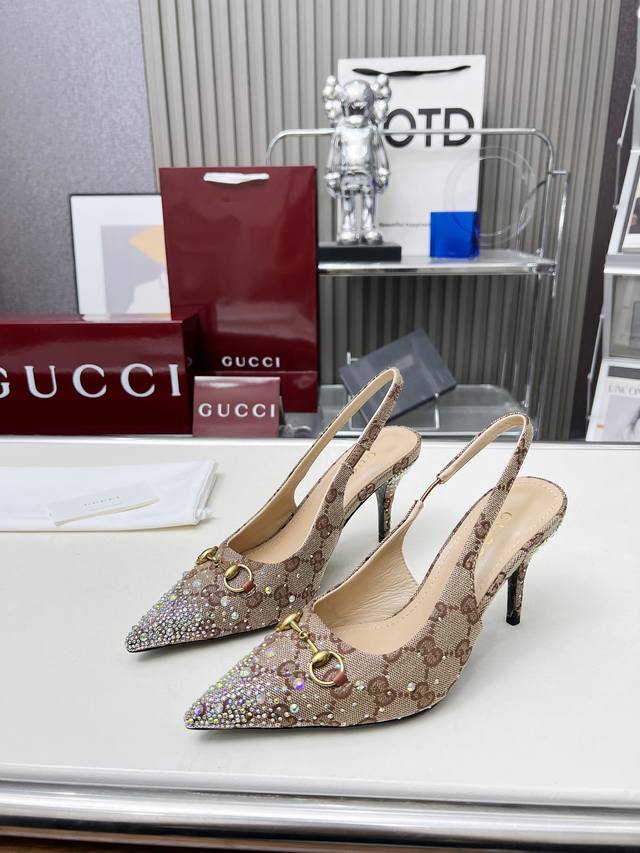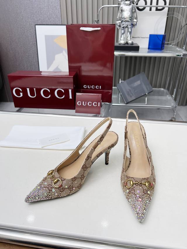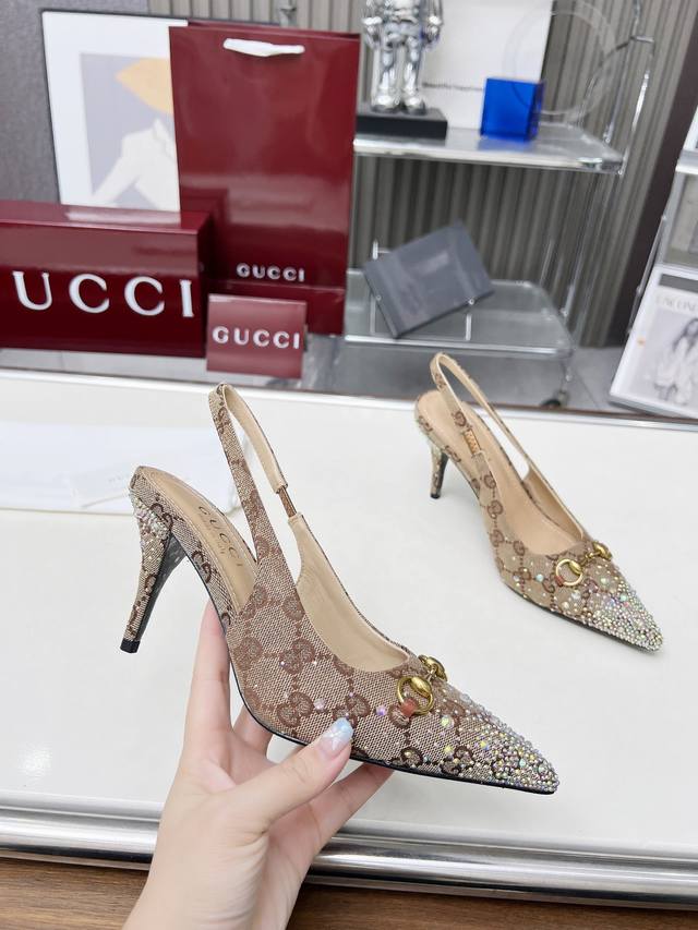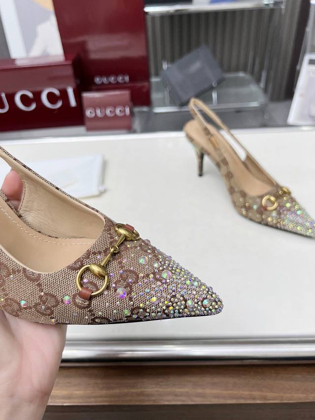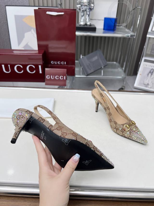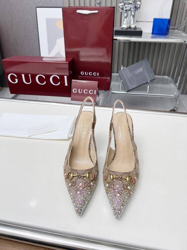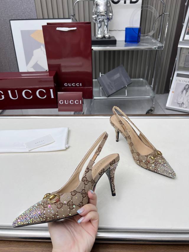 Factory direct price women's shoes and sportswear original quality Gucci 2025 Spring/Summer new arrivals rhinestone high heels, top quality, genuine product, original hot-stamping rhinestone process, classic double G monogram upper, lambskin lining, Italian original material and craftsmanship consistent with the original. Sizes: 35-42.