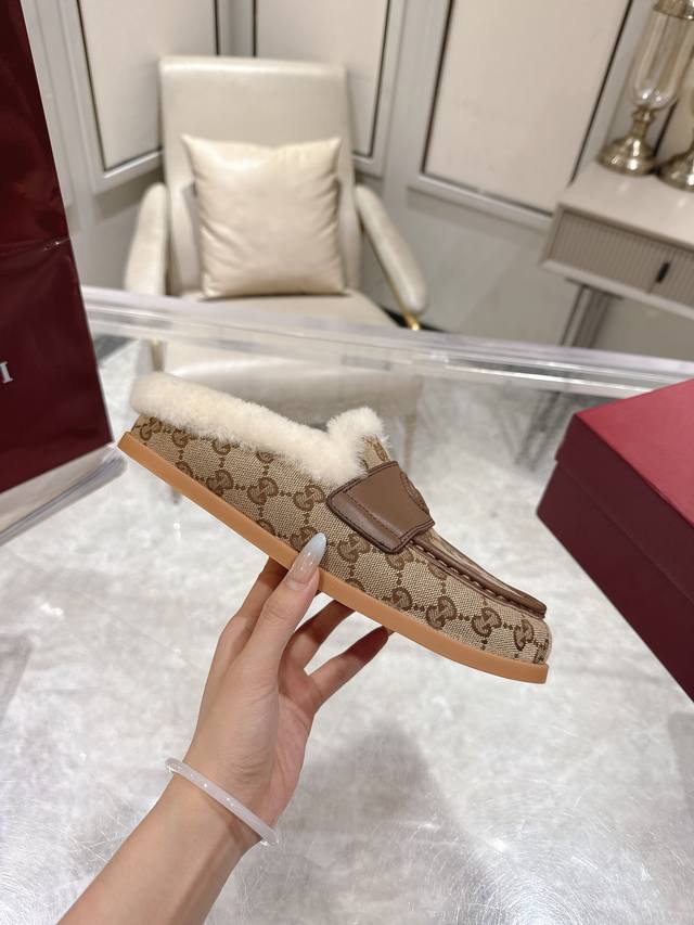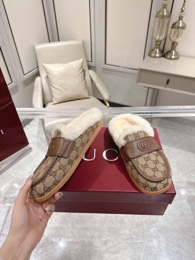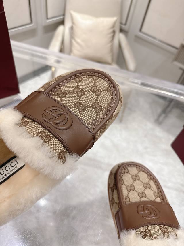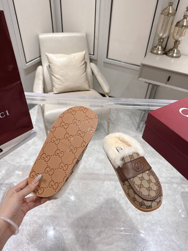 Factory direct women's shoes and sportswear original single 2025 early autumn latest color scheme Gucci wool slippers, latest version flat half wool slippers. As an outstanding representative of design heritage, these shoes vividly showcase classic elegance. They feature embossed leather with the brand's iconic GG logo, creating a timeless classic. The shoes are made of soft material with a refined and smooth silhouette, exuding everyday elegance! Convenient for travel. Sizes: 35-39. 4041 Custom-made, no returns or exchanges.