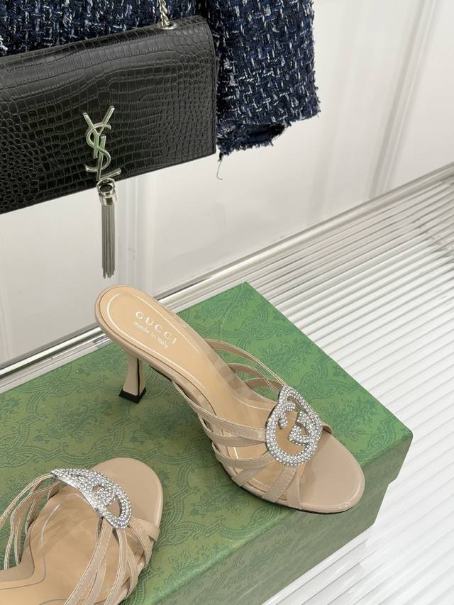 Factory Price DDD Gucci 25Wf Early Spring Rhinestone Double G Strap High Heeled Slippers DDD Reconstructing the Early Spring Style with Classic Symbols and Dazzling Rhinestones DDD Incorporating Italian "effortless elegance" into every inch of footwear DDD Showcasing luxurious quality and modern tension with every step. The shoe features a three-dimensional metallic double-G logo at its core, fully studded with tiny rhinestones that shimmer and gleam under light. Understated yet highly recognizable, it's a contemporary interpretation of the brand's century-old DNA. The 8.5cm stiletto heel is elegant and elongates the figure, making it suitable for petite individuals. Its versatility makes it suitable for all occasions. Pair it with a silk slip dress for a gentle and luxurious look, perfect for dates or commutes. With high-waisted wide-leg pants and a simple shirt, it exudes a sophisticated and modern style. With a floral tea dress, it's ideal for early spring vacations. Effortlessly adding a finishing touch to any outfit, it's appropriate and outstanding for both day and night. The upper is made of original custom leather, with a sheepskin lining and Italian imported genuine leather outsole. Sizes: 35-39, 40, 41, 42 (custom sizes available).