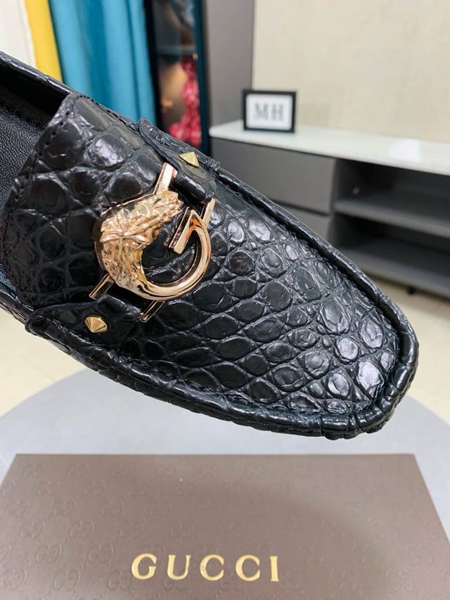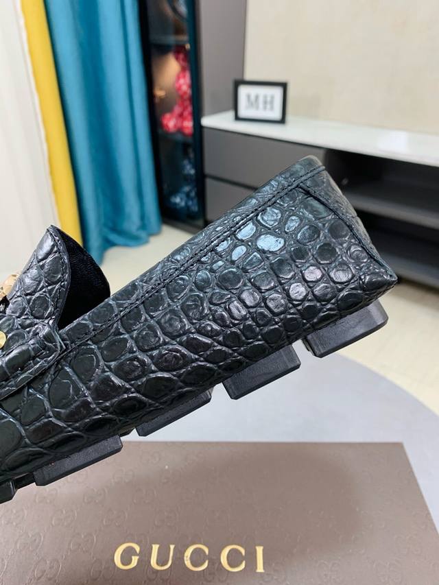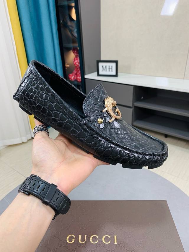 Factory price (p) Includes packaging. Original Gucci men's casual loafers. Made with genuine Italian-made embossed cowhide and genuine sheepskin lining; precision stitching accentuates understated luxury. The comfortable sole design maximizes comfort and slip resistance. The shoe's elegant, understated charm is undeniable! A natural and effortless new urbanism. Sizes: 38-44