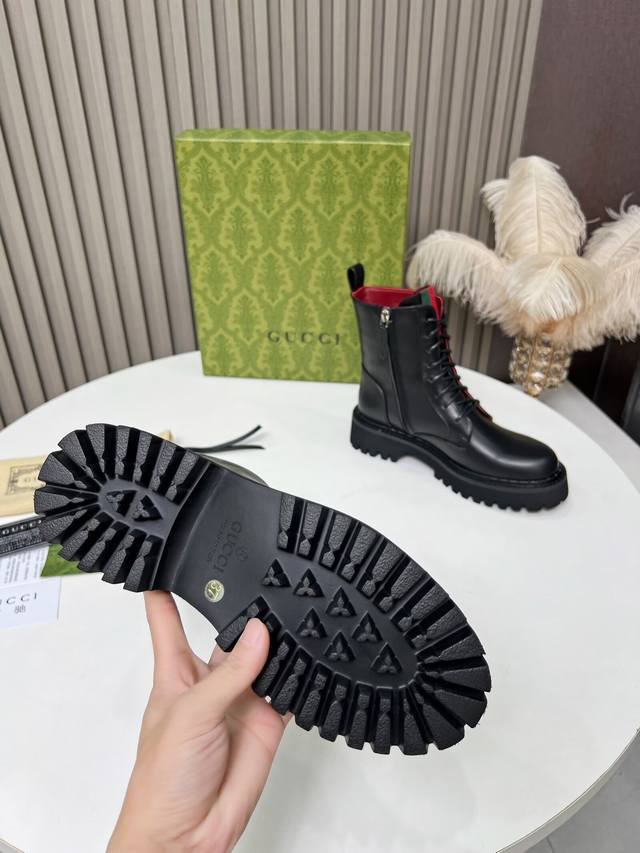 Factory Price (pp): 2025 Latest Gucci Versatile Lace-up Martin Boots, Easy to On and Off. Brand Webbing Color Block Heel Height: 5cm Material: Cowhide Leather with Split Edge Lining: Red Cowhide Insole: Foam Outsole Color: Black Sizes: 34, 40. Sizes 34, 41, and 42 require custom orders. Packaging: Comes with card and cloth bag.