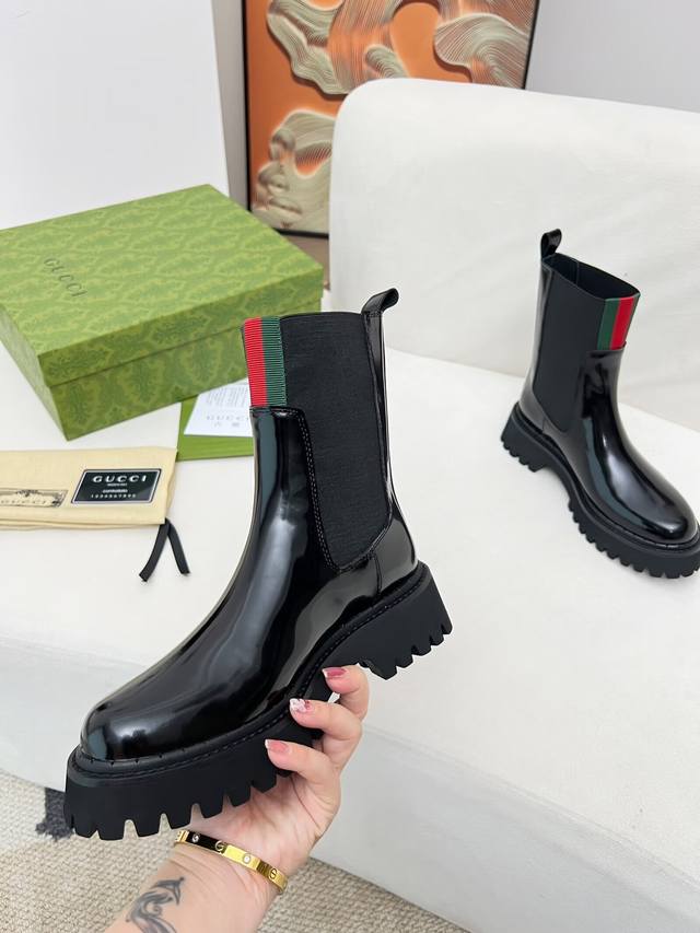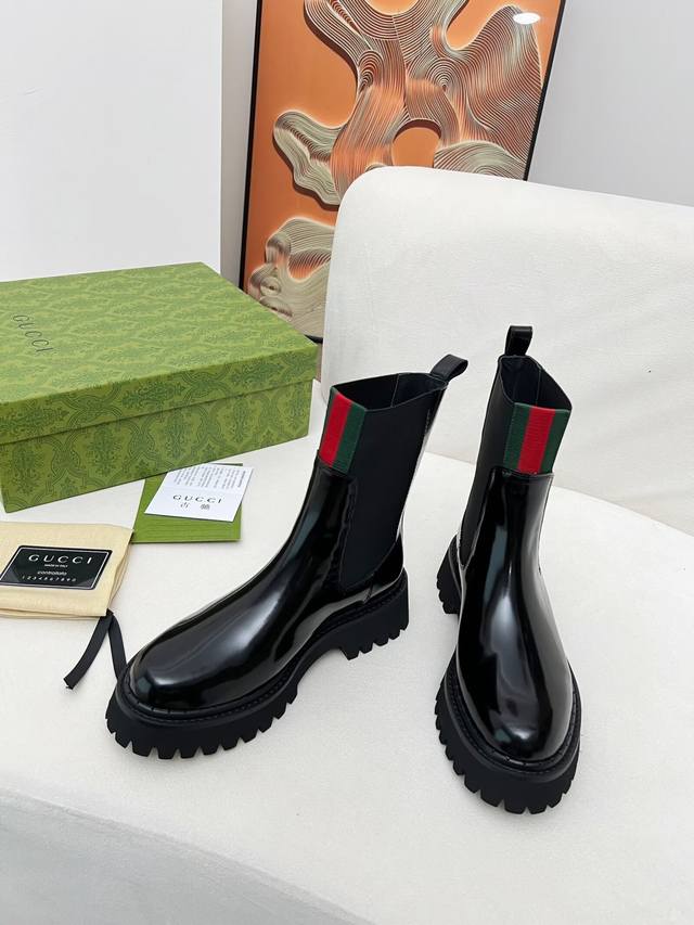 Factory Price (pp): 2025 Latest Gucci Versatile Martin Boots, Easy-on Slip-on, Brand Webbing Color Block Heel Height: 5cm Material: Cowhide Leather Lining: Black Cowhide Lining: Foam Outsole Color: Black Sizes: 34, 40. Sizes 34, 41, and 42 require custom orders. Packaging: Comes with card and cloth bag.