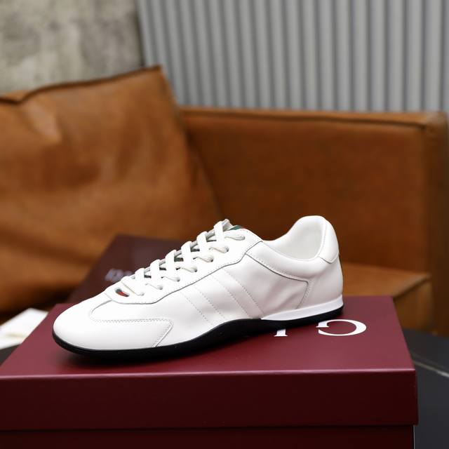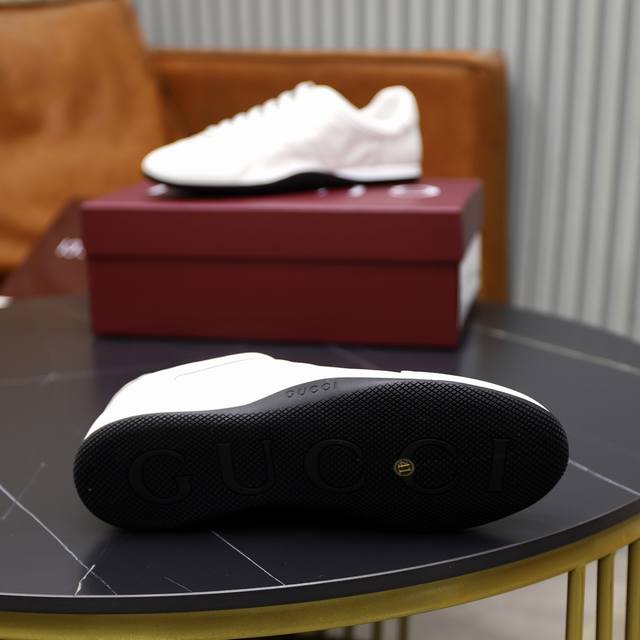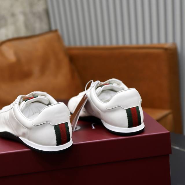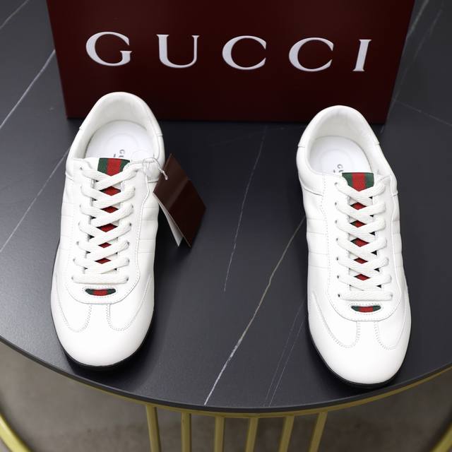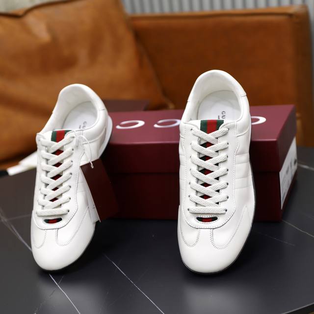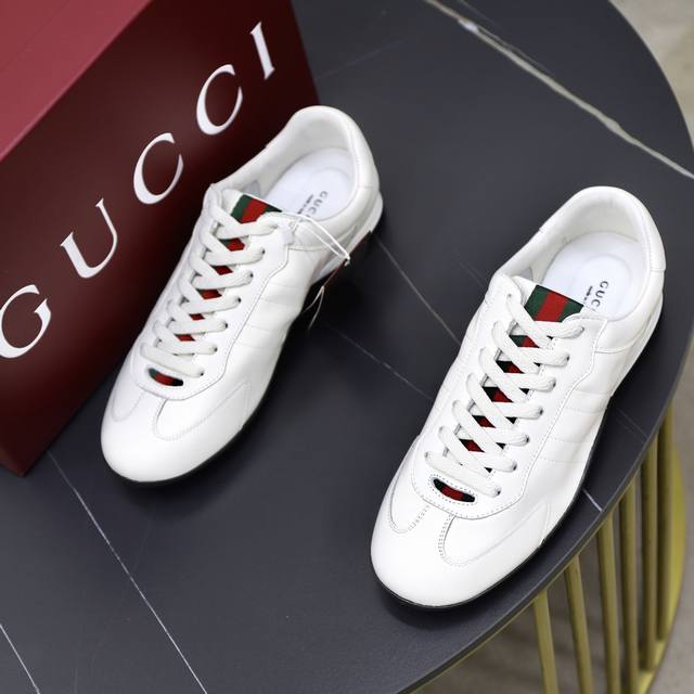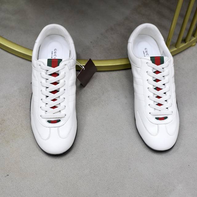 Factory Price (pp): Gucci Shift Series Couple Sneakers DDD The new Gucci Shift series is now available, with a lightweight design that reinterprets sporty style. The clean silhouette adds a touch of freedom, showcasing refined quality with every movement. Webbing details flow like a continuous ribbon throughout the design, while side stitching details add a finishing touch. DDD Original Development DDD Washed Leather Upper DDD Two-tone TPU Outsole DDD Sizes: Women's 35-41 Men's 39-45 DDD