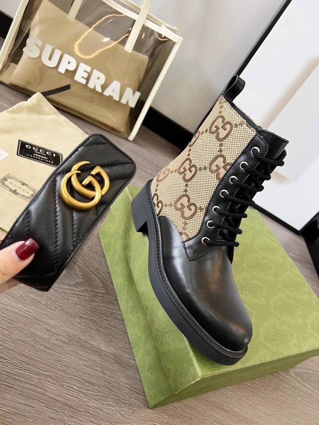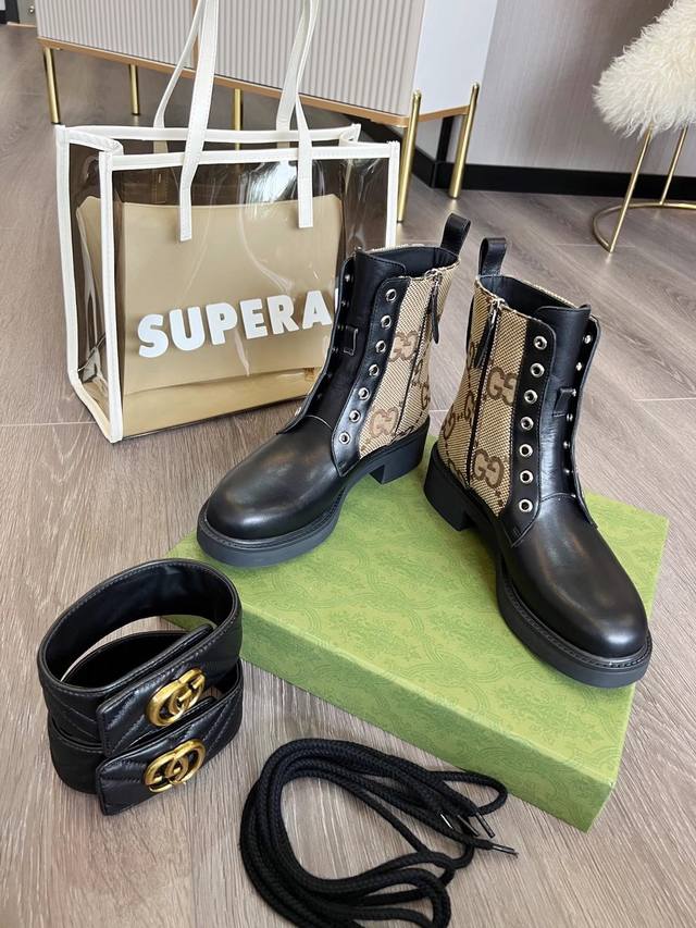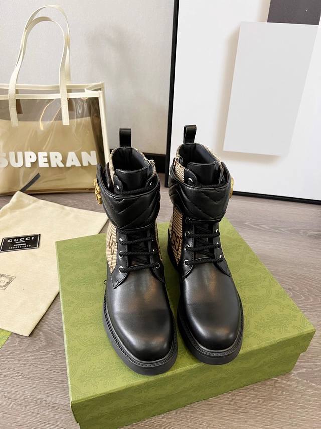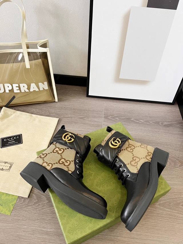 Factory Price (pp): Original Gucci Double G Ankle Boots for Autumn/Winter, full edge finishing and metal chain details, pull tab at the back for easy on and off, elasticated sides for a luxurious feel. Material: Cowhide. Lining/Insole: High-end cowhide. Gucci TPU outsole with a small bee design, 4cm heel height. Color: Black. Sizes: 35, 41. Size 41 requires custom order. Packaging: Includes card and cloth bag.