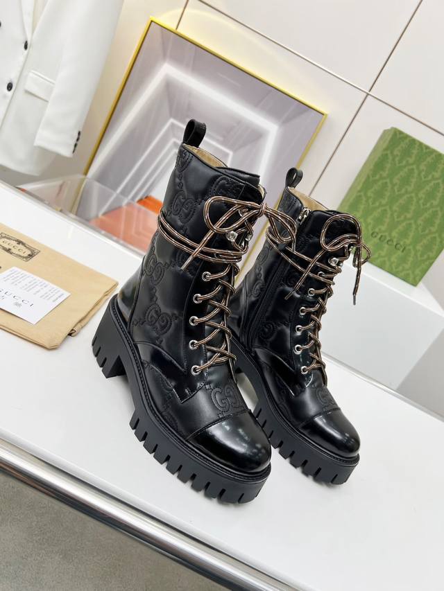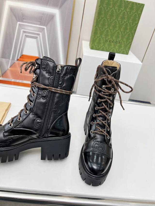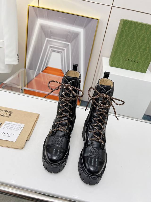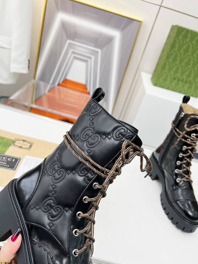 Factory Price (pp): Price not specified] Official Website 1:1 Gucci Double G Embroidered Lace-up 8-inch Boots for Autumn/Winter - Full Edge Finish, High-End Feel, Side Zipper for Easy On/Off, Unique Style, Distinctive Brand Style. Material: Cowhide Leather with Split Edge. Lining: High-End Cowhide. TPU Outsole, 6cm Heel Height. Colors: White, Black (Matte and Glossy). Sizes: 35, 41, 42. Packaging: Includes card and cloth bag.