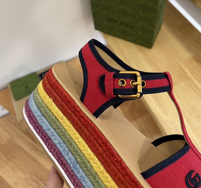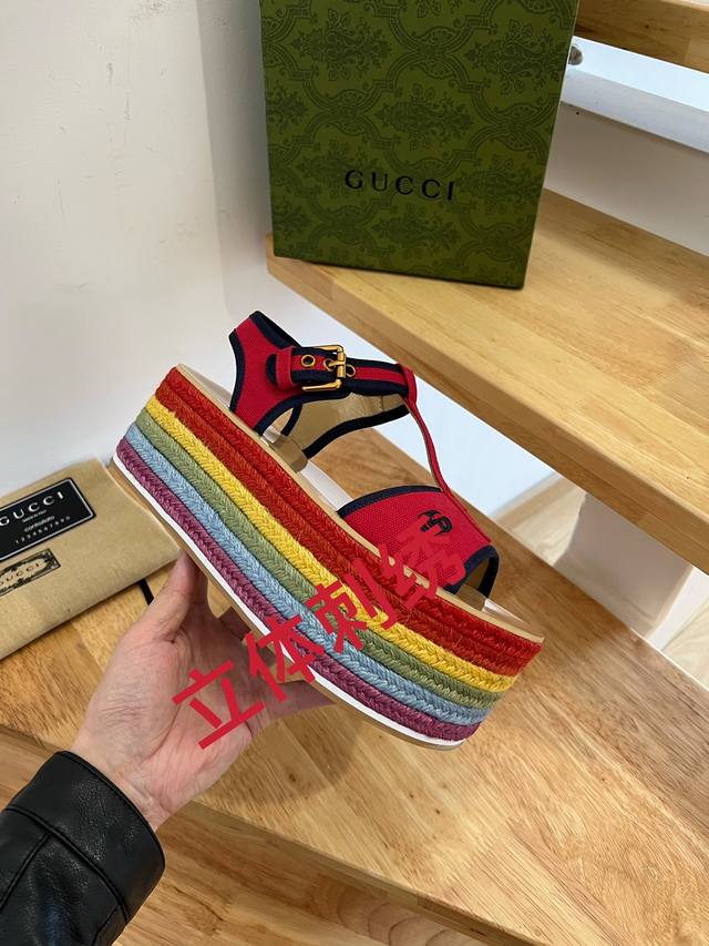 Factory-priced women's sports shoes. These 22Ss Spring/Summer Gucci straw rainbow platform sandals bring a touch of modern flair to your summer look. Upper: Leather, fabric. Lining: Leather. Sole: Leather insole, rubber sole. Open square toe. Made in Spain. Fits true to size. Slightly wider. International standard size. Platform: 7cm. Sizes: 35-41.